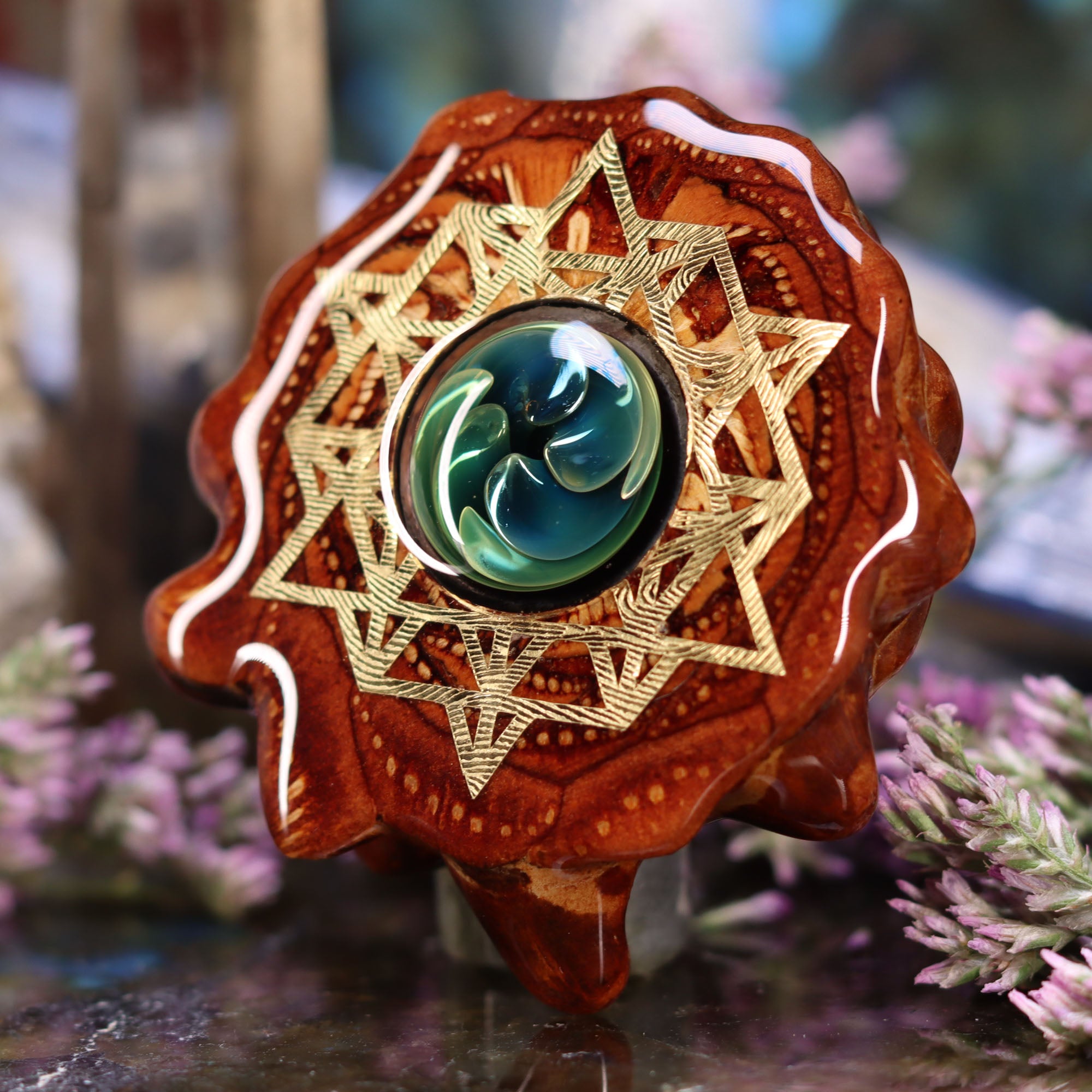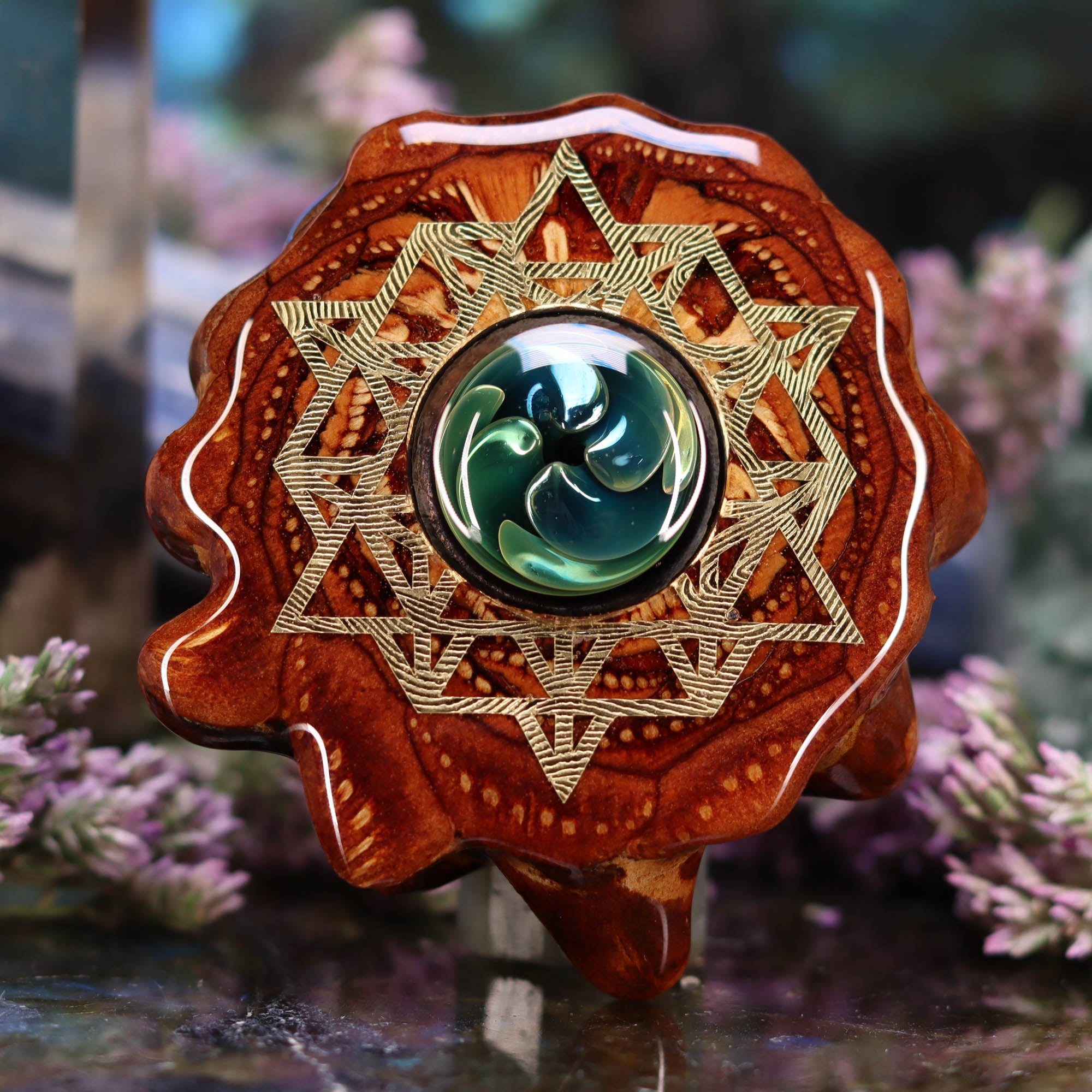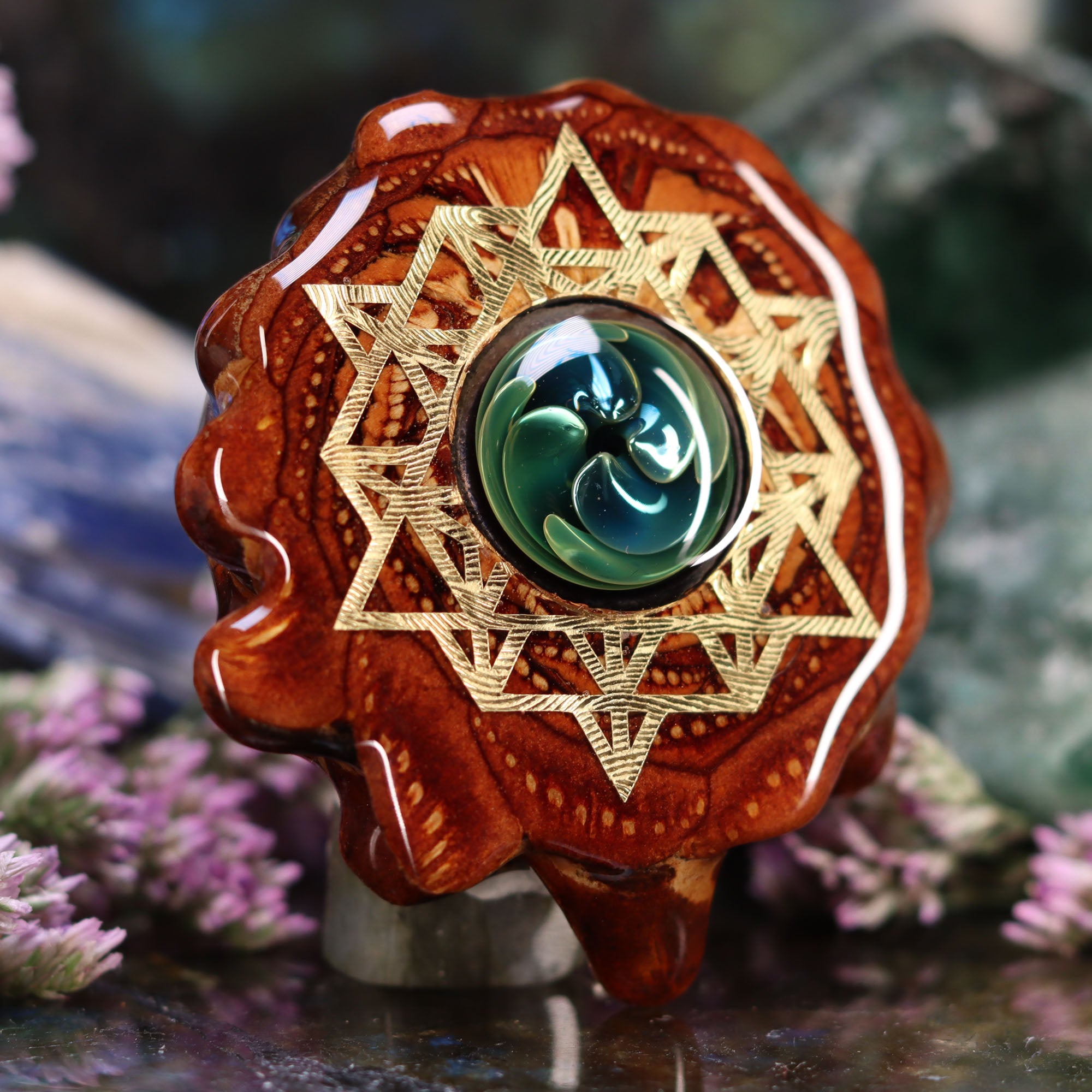 This epic collaboration between Third Eye Pinecones and Nick Anderson Art features a small Glass “Phoenix Orchid” Cab set inside one of our Pinecone Pendants! Each one of these Phoenix Orchid pendants is entirely unique, each with a life of its own. This piece is a one-of-a-kind creation, handmade by Nick, adding an exotic beauty and a stunning natural presence to the person wearing it. Crafted of borosilicate glass and precious metals, the exotic Phoenix Orchid is born in the flames. Forged at temperatures of nearly 5000º Fahrenheit, it is preserved eternally in its final glass form. It is the only of its kind known to exist – truly an original creation.