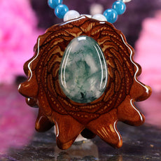 Hand-woven in Bellingham, WA, this necklace features a Blue Lace Agate with Silver 64 Star Tetrahedron pendant lovingly strung with Dendritic Agate, Larimar, Strawberry Quartz, Aquamarine, Red Jasper, Aqua Stone, and Lepidolite beads to activate and energize body, mind and spirit!