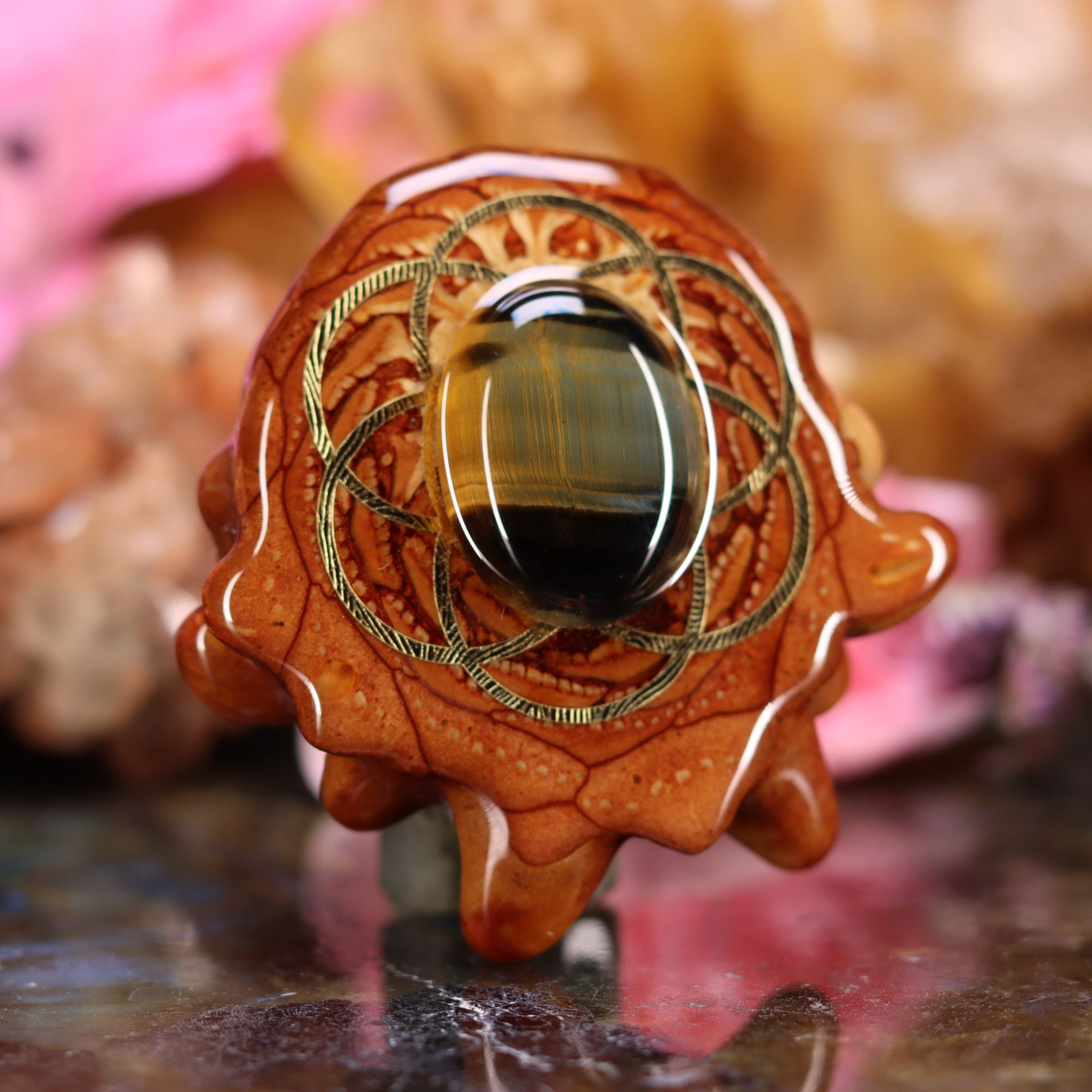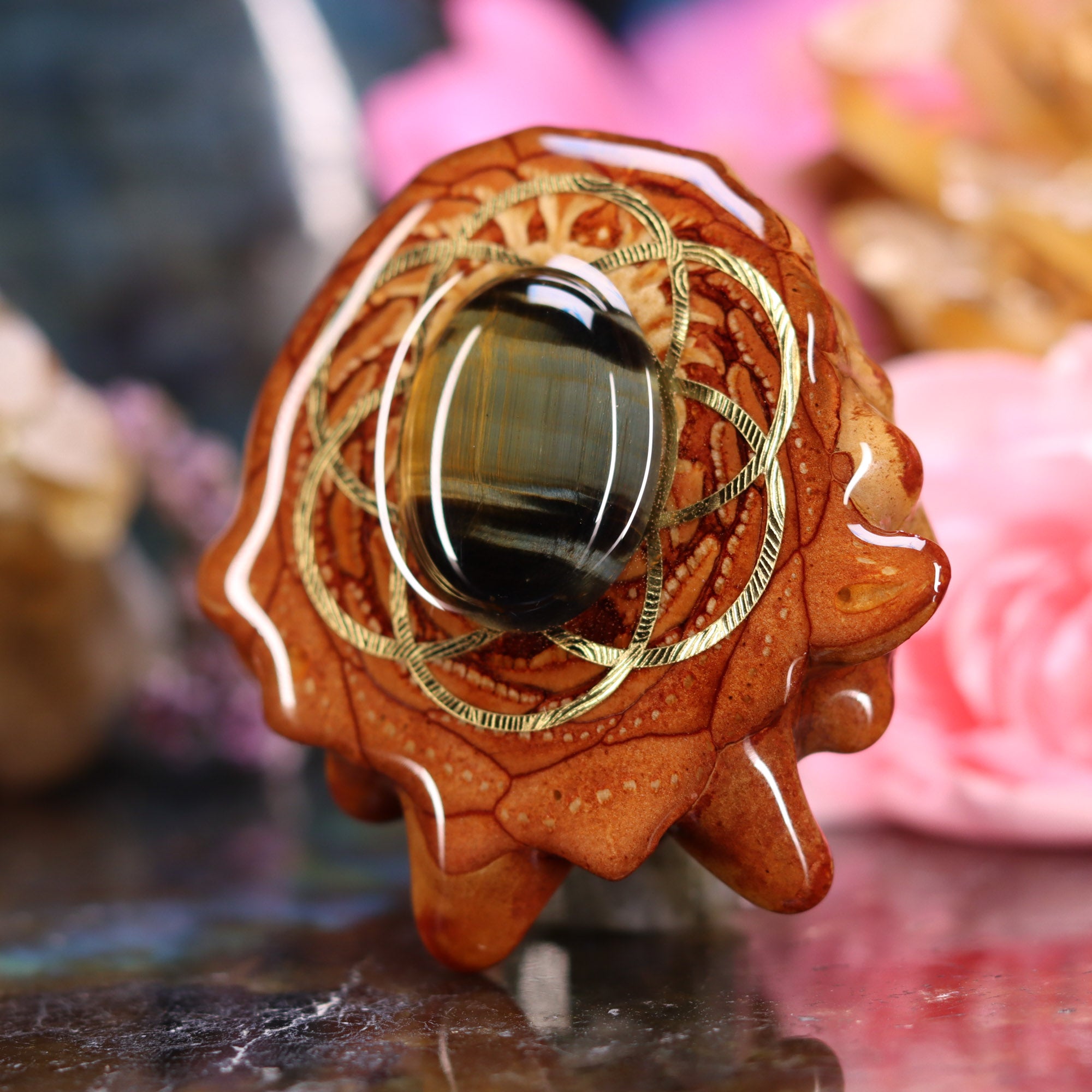 Traditionally carried as a protective talisman to ward off ill will and curses, Tiger's Eye is thought to combine the grounding (yin) energy of the earth with the higher vibrational (yang) energy of the sun, facilitating heightened intuition and awareness without losing one's root. It is associated with clarity, focus, and differentiation – assisting in accomplishing goals, recognizing one's inner resources and promoting refinement of intention. It also integrates the two hemispheres of the brain, enhances visual acuity, and is especially helpful for resolving difficult dilemmas and internal conflicts.
