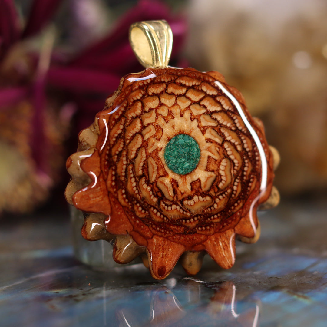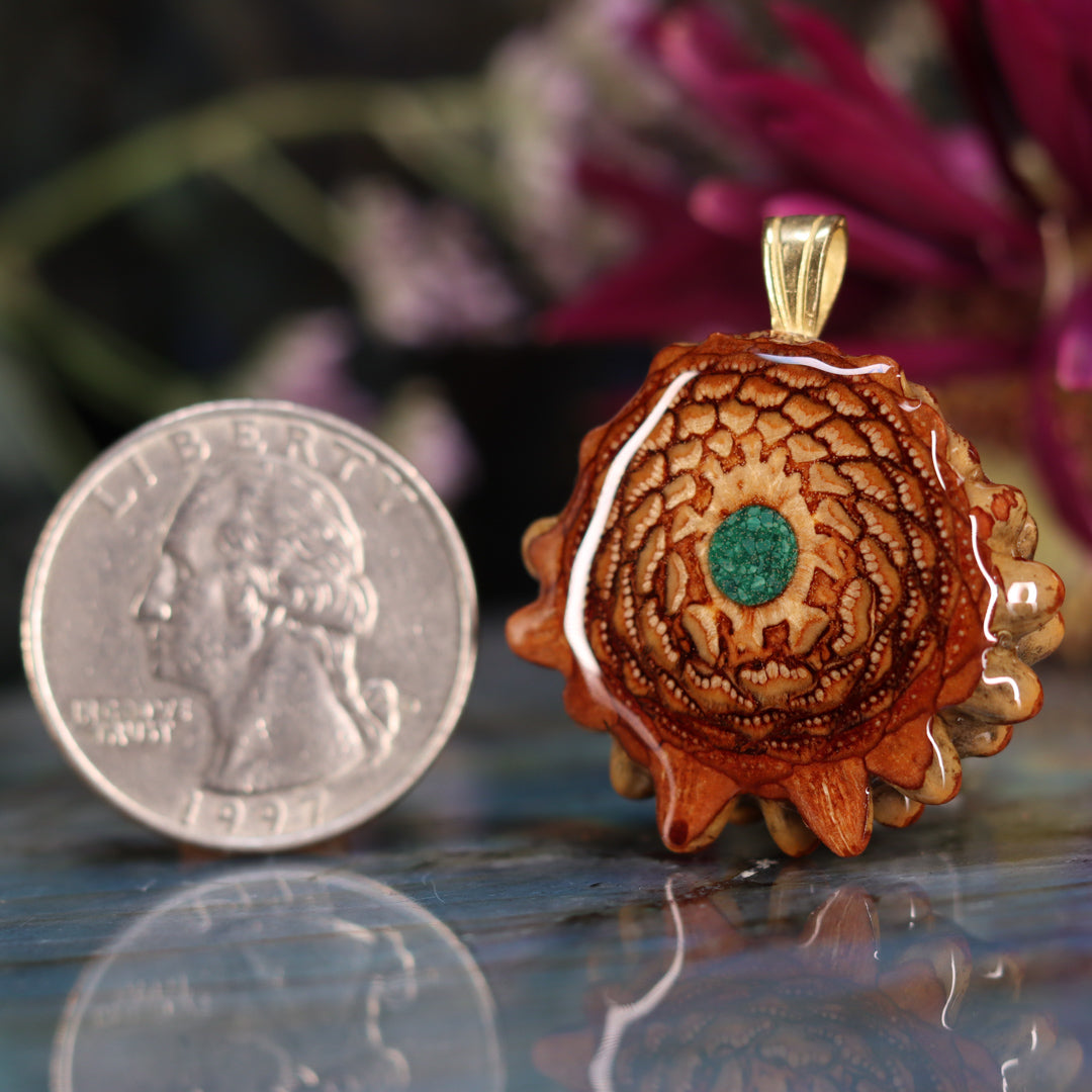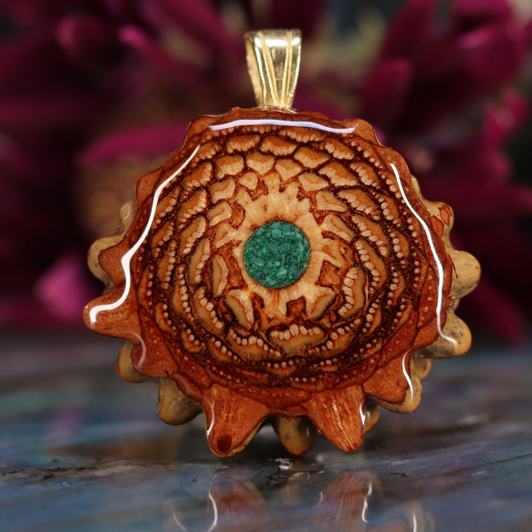 Every pinecone pendant is an elegant gift from Mother Nature -- unveiling the ornate Sacred Geometry hidden at the center of one of the world's densest Pinecones. Because only one cross-section is taken from the "heart" of each Cone, every pendant is absolutely unique, and truly one-of-a-kind.