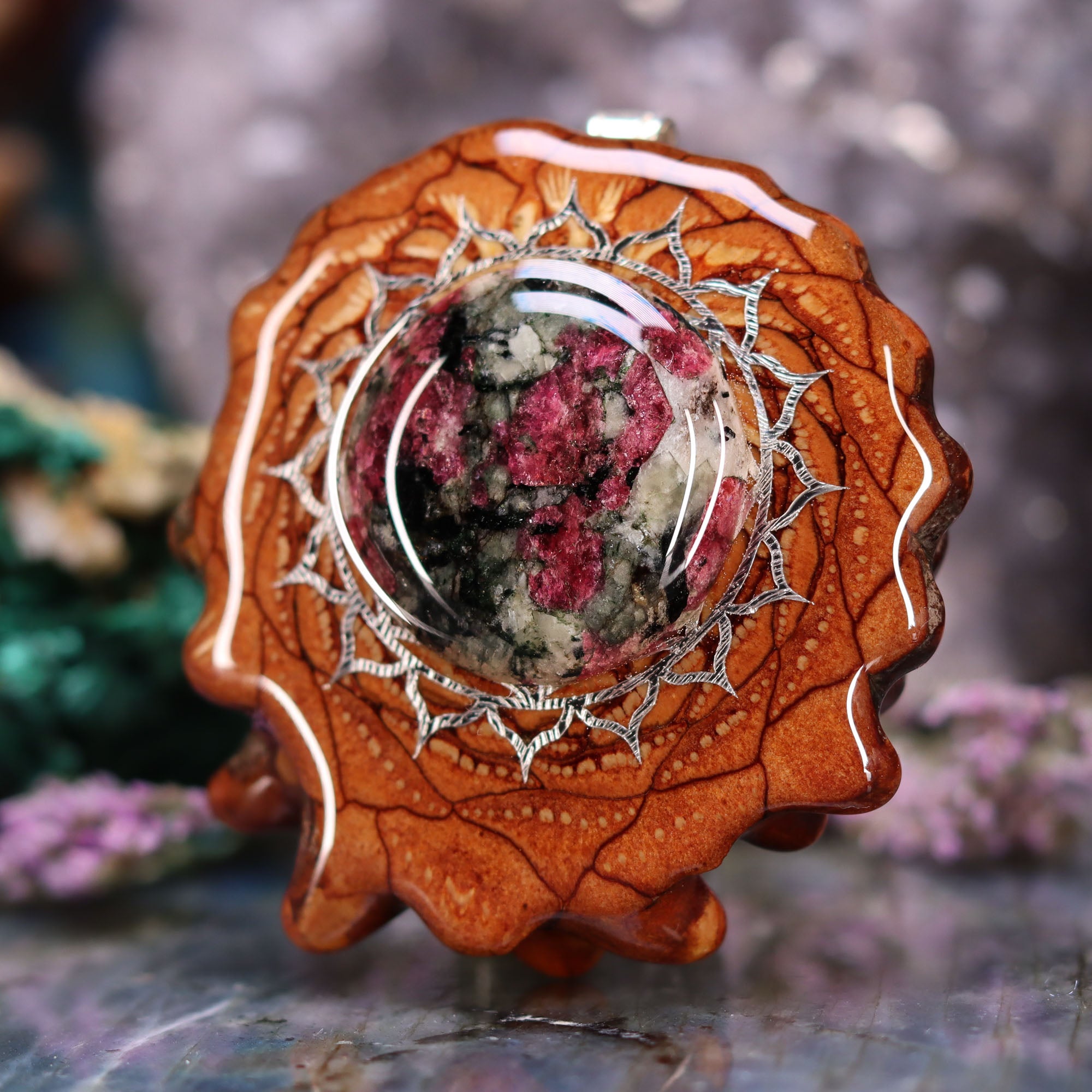 Every pinecone pendant is an elegant gift from Mother Nature -- unveiling the ornate Sacred Geometry hidden at the center of one of the world's densest Pinecones. Because only one cross-section is taken from the "heart" of each Cone, every pendant is absolutely unique, and truly one-of-a-kind.