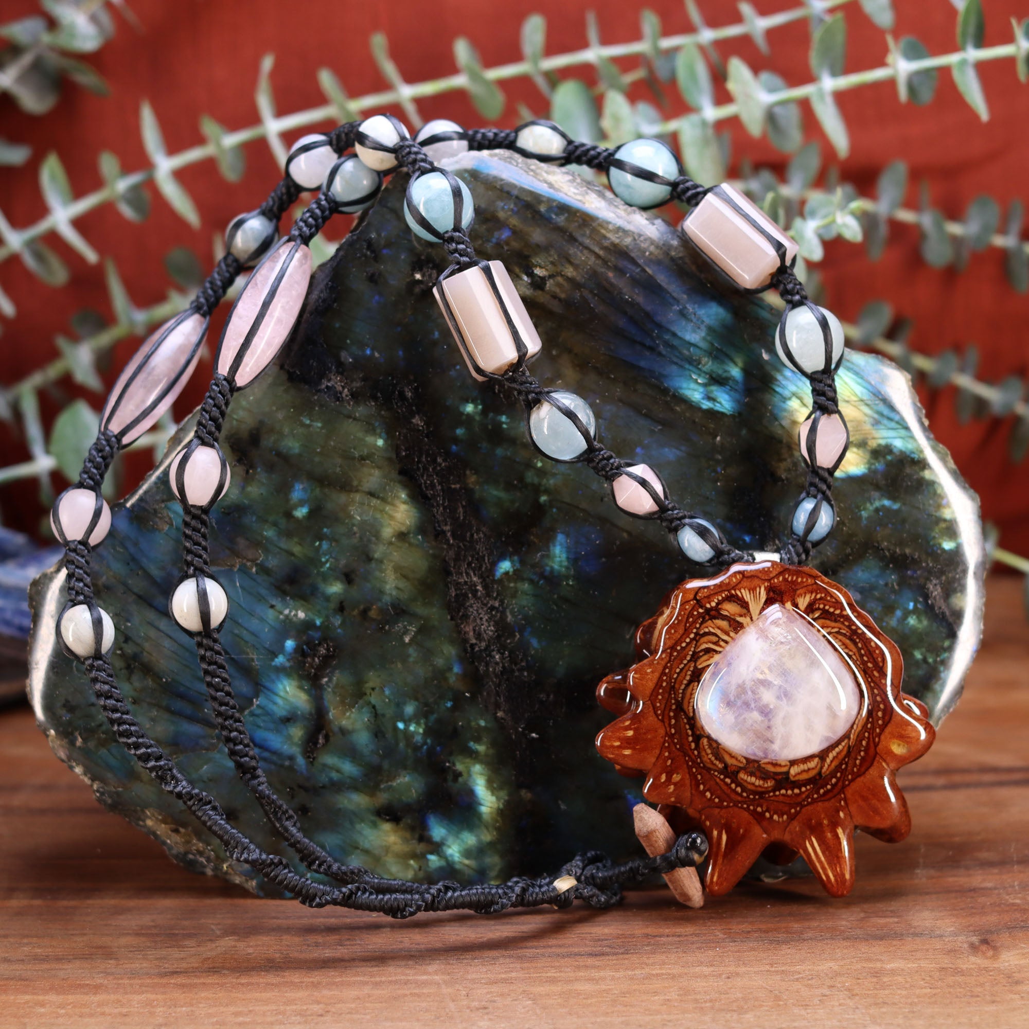 Hand-woven in Bellingham WA, this necklace features a Moonstone pendant lovingly strung with Aquamarine, Rose Quartz, Moonstone, Peach Moonstone, and Matte Rose Quartz beads to activate and energize body, mind and spirit!