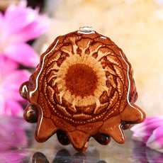 This pinecone bears a 24k Gold emblem of the 3rd chakra, the Solar Plexus Chakra. Known as “Manipura” (“the place of resplendence”) in Sanskrit, the 3rd chakra is characterized by the Archetype of the Warrior, and is associated with self-esteem, transformation, and the ability to assert one’s Will in the world.