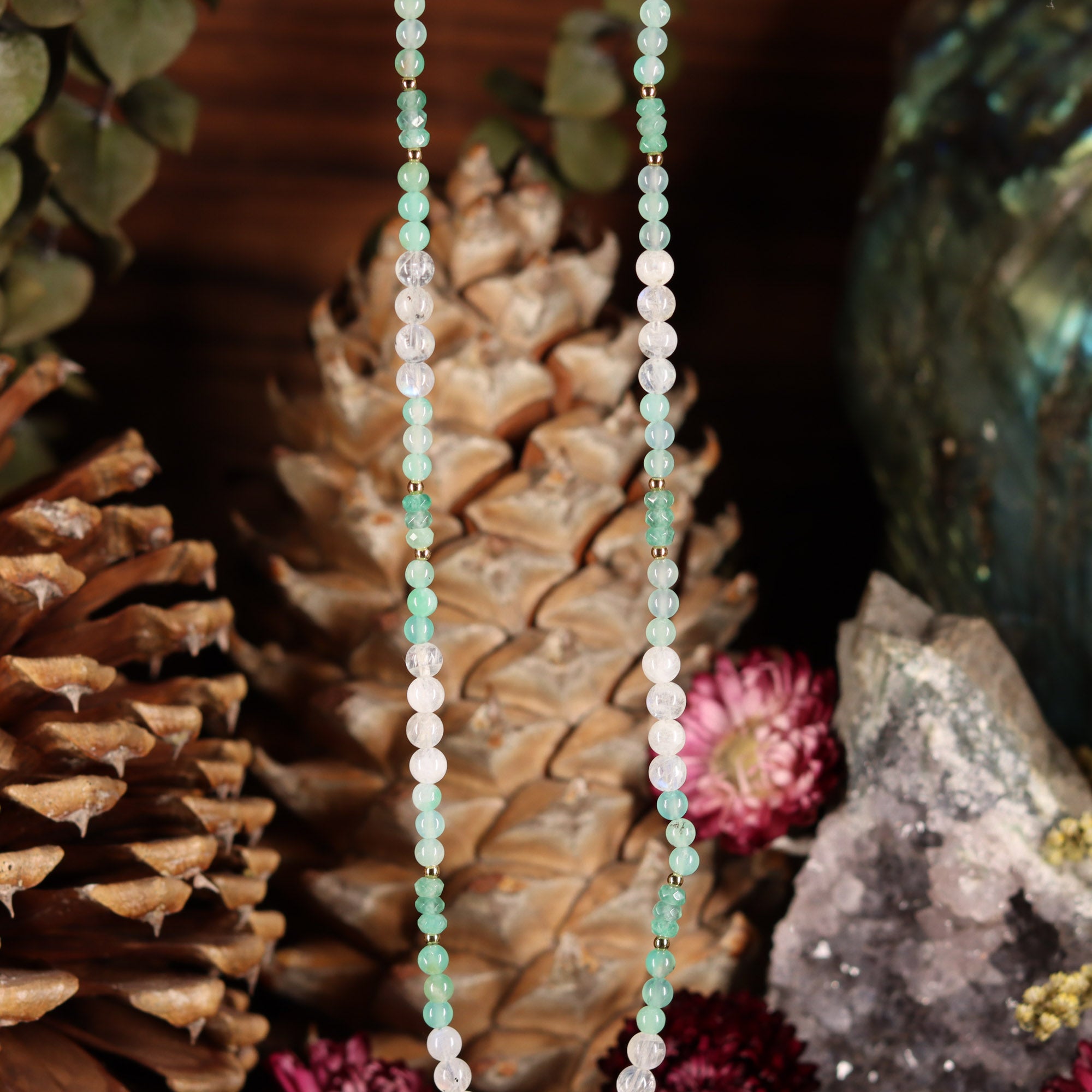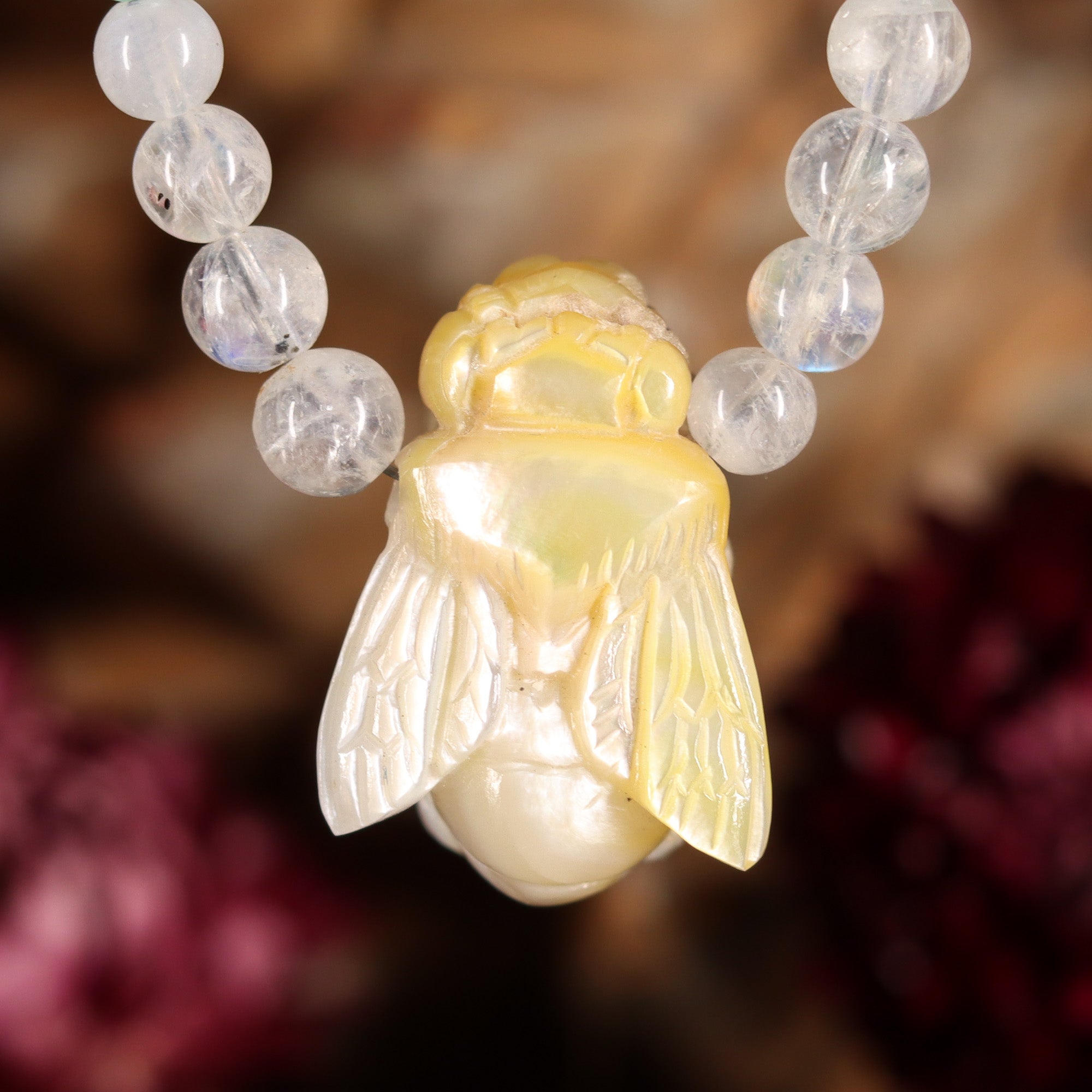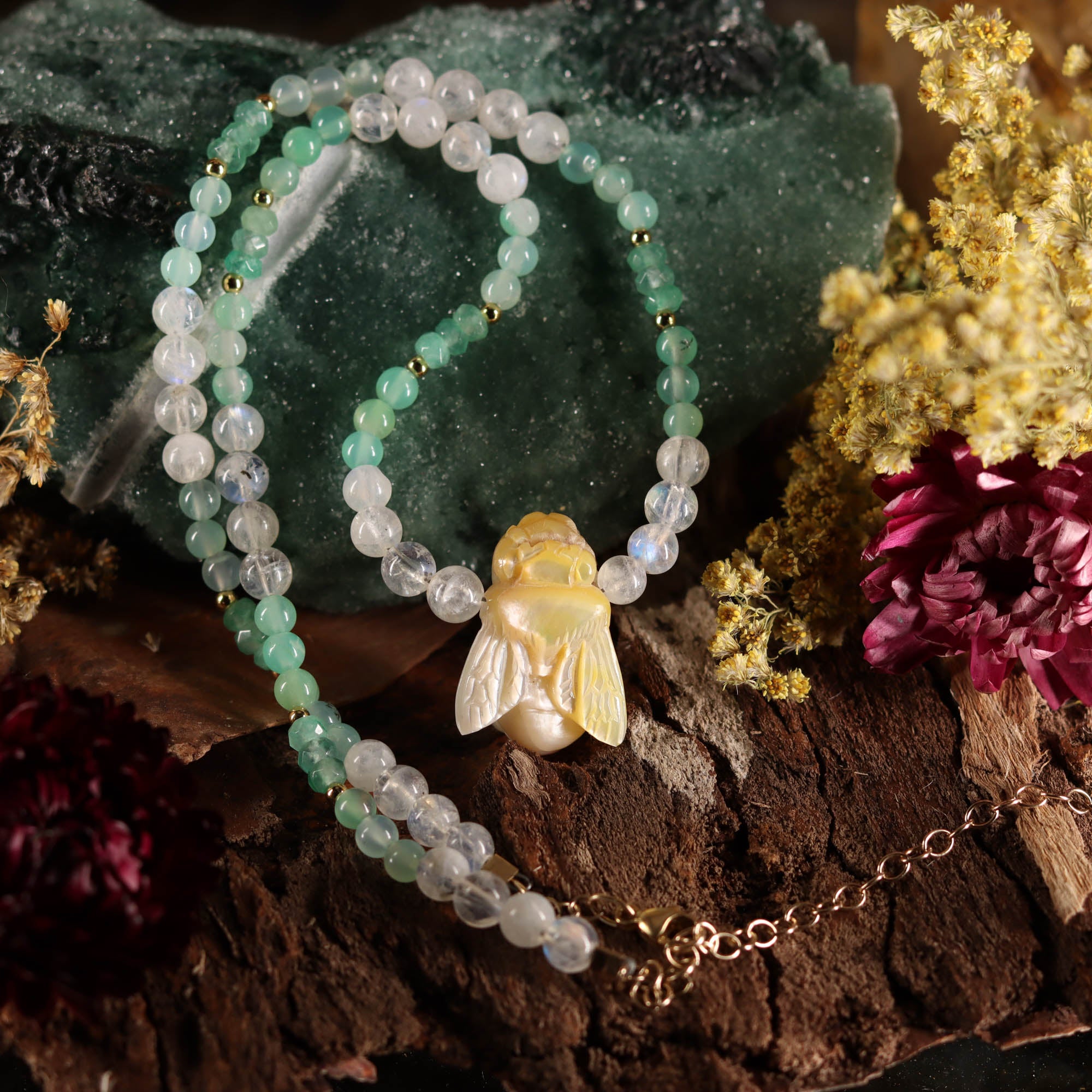 This necklace measures 16.5-21 inches (42-53 cm) and features a Mother of Pearl Bee pendant lovingly strung with a 4.5-inch length-adjustable 14k Gold Fill chain with Moonstone and Chrysoprase beads to activate and energize body, mind and spirit!