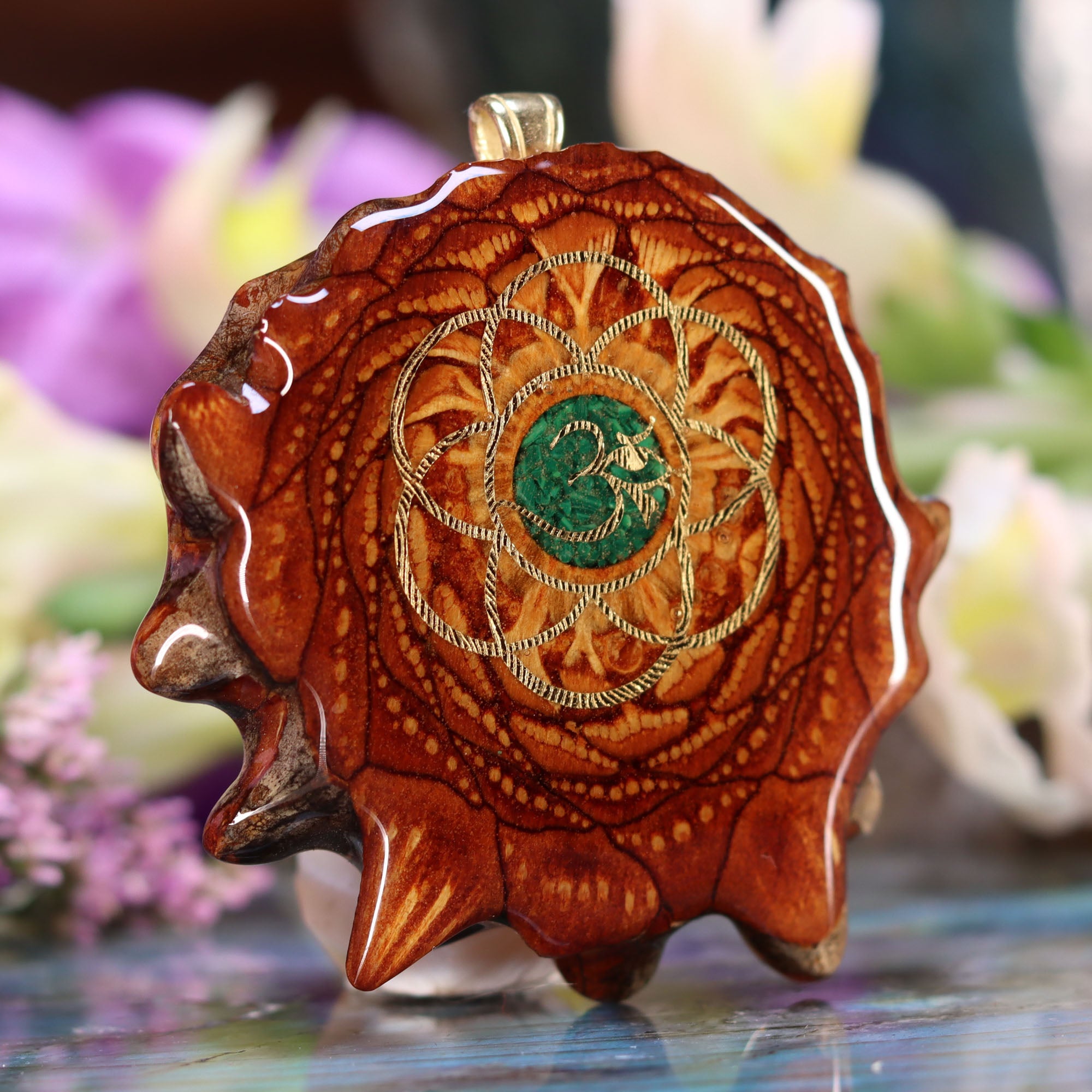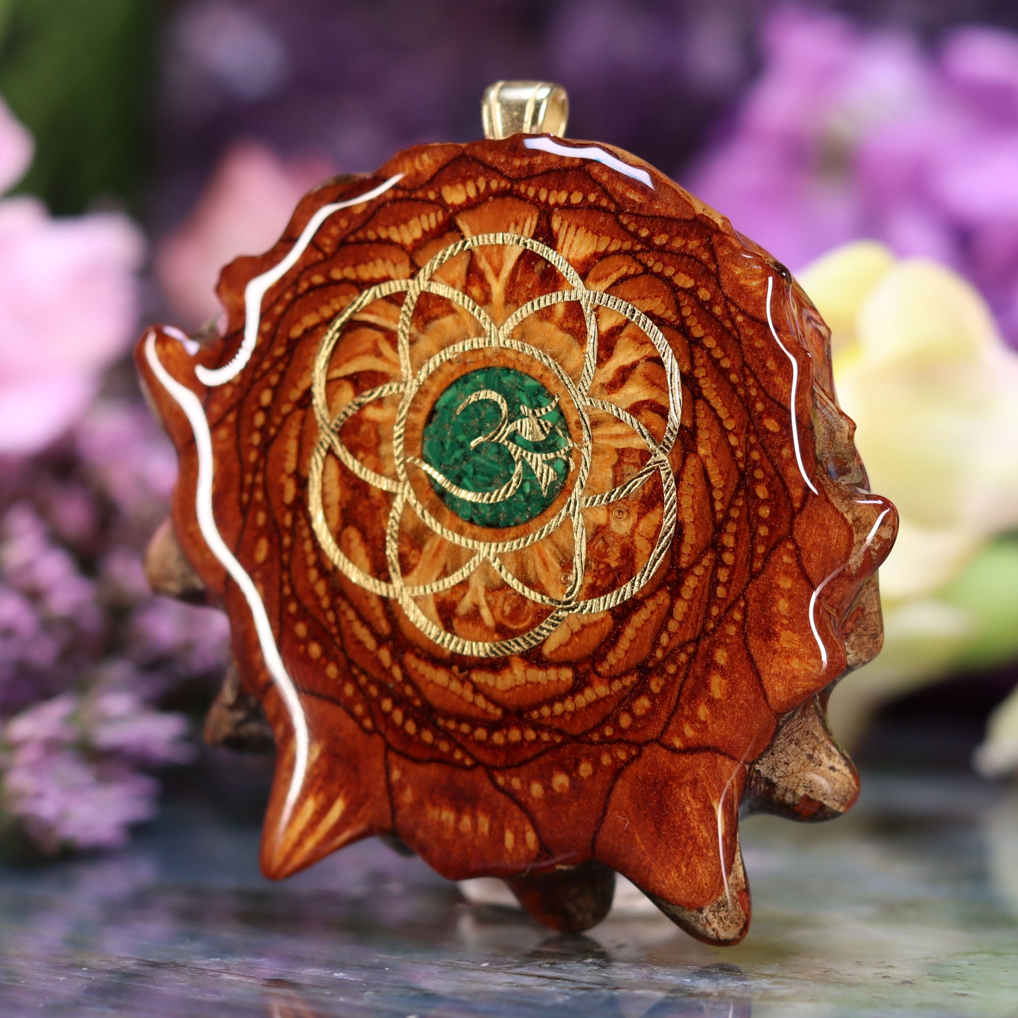 Crushed Malachite (Glows) with Gold Seed of Life and Front Om