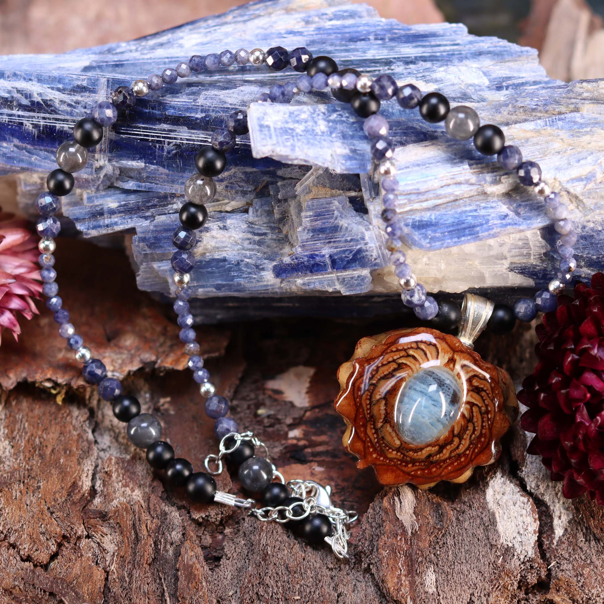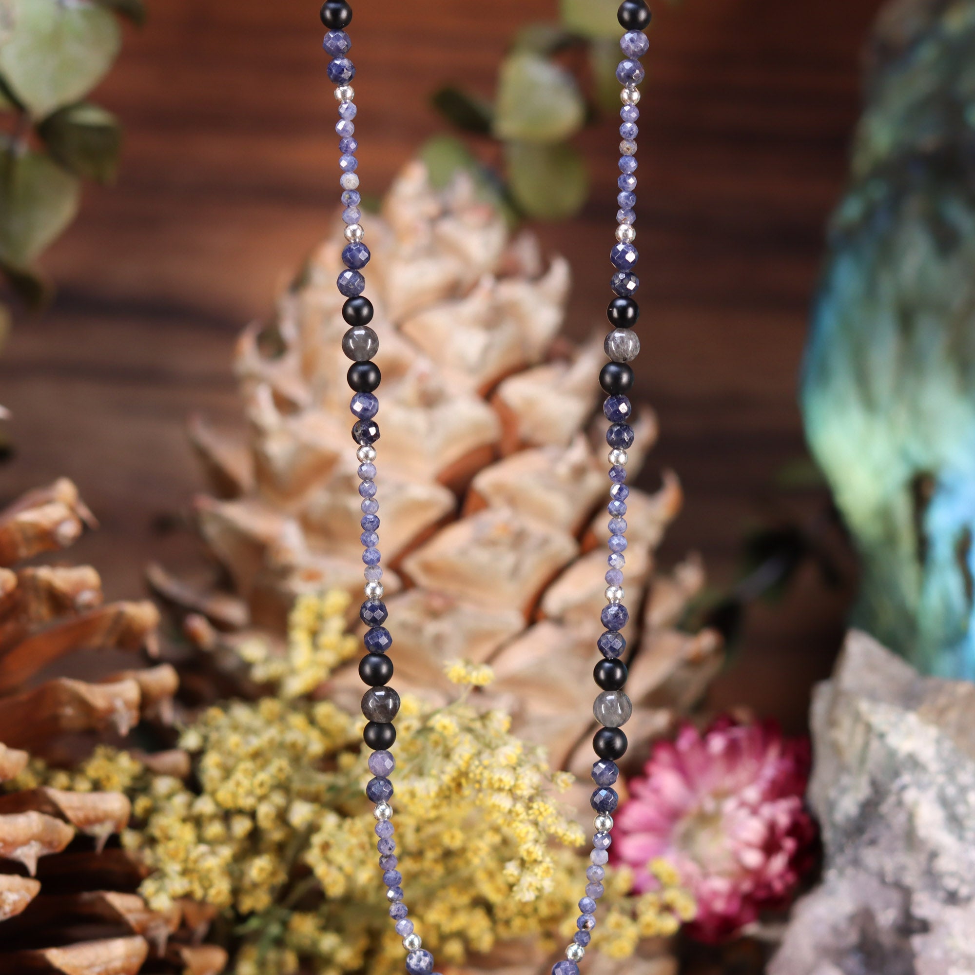 This necklace measures 12 inches (30 cm) and features an Aquamarine pendant lovingly strung with a 3-inch length-adjustable Sterling Silver chain with Matte Onyx, Iolite, and Blue Sapphire beads to activate and energize body, mind and spirit!