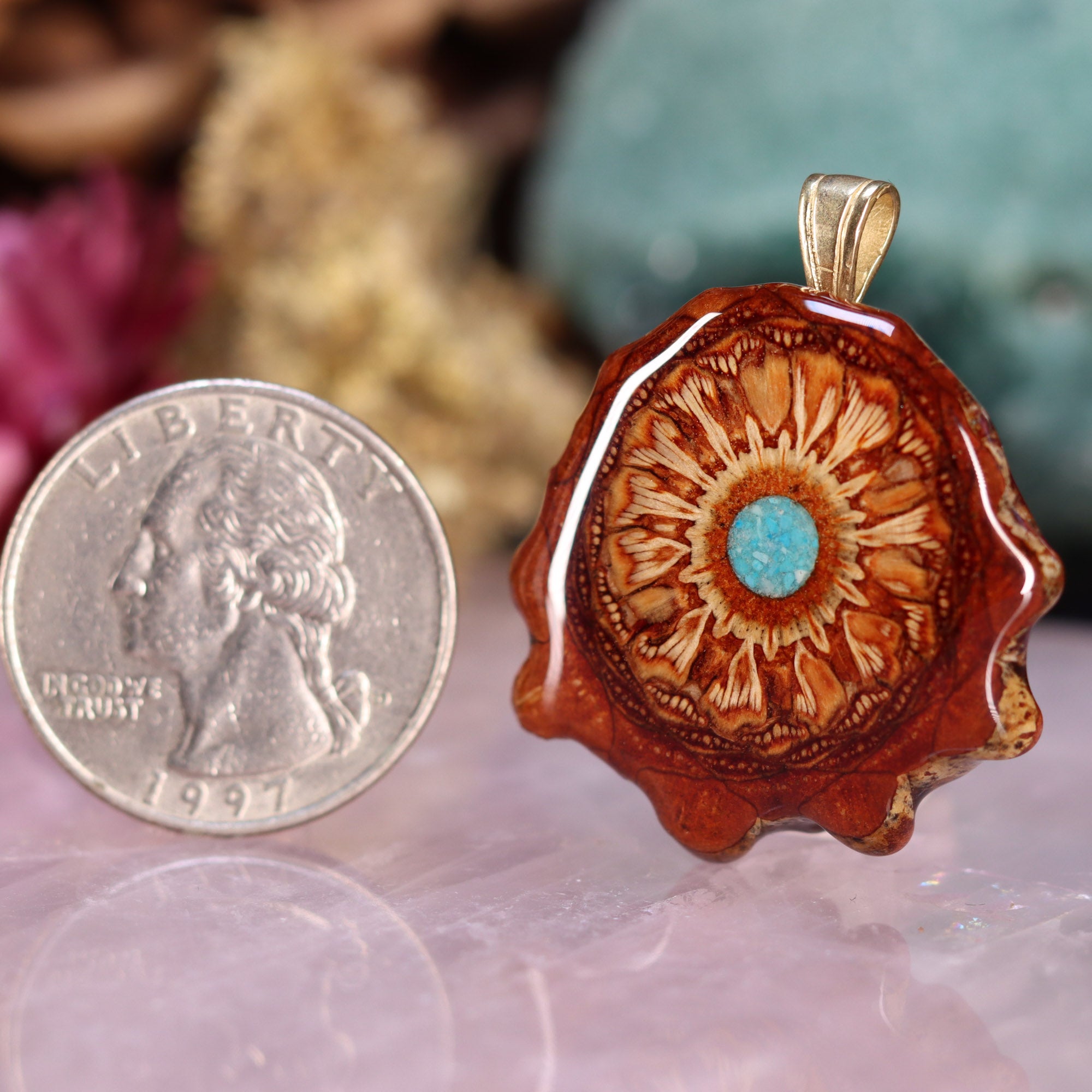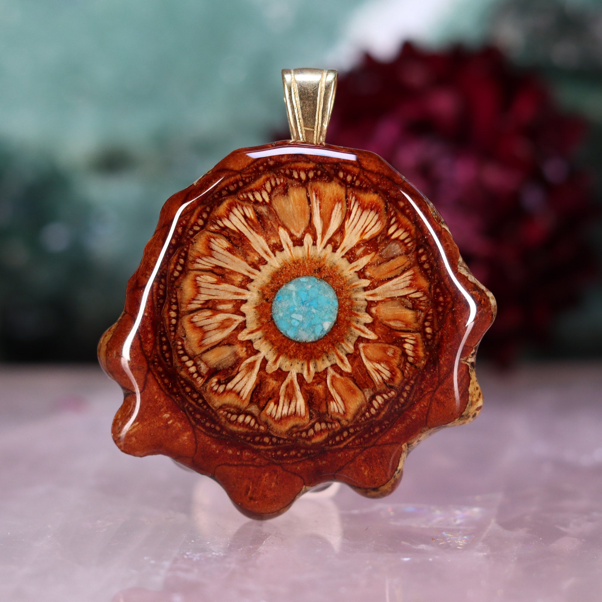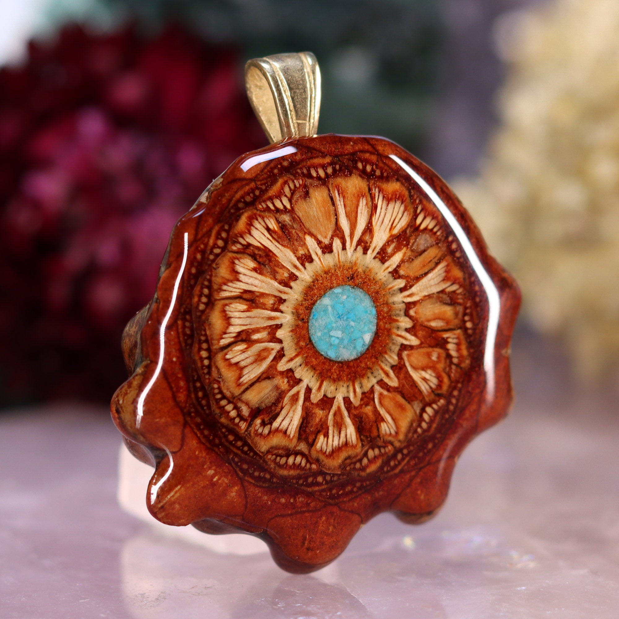 Every pinecone pendant is an elegant gift from Mother Nature -- unveiling the ornate Sacred Geometry hidden at the center of one of the world's densest Pinecones. Because only one cross-section is taken from the "heart" of each Cone, every pendant is absolutely unique, and truly one-of-a-kind.
