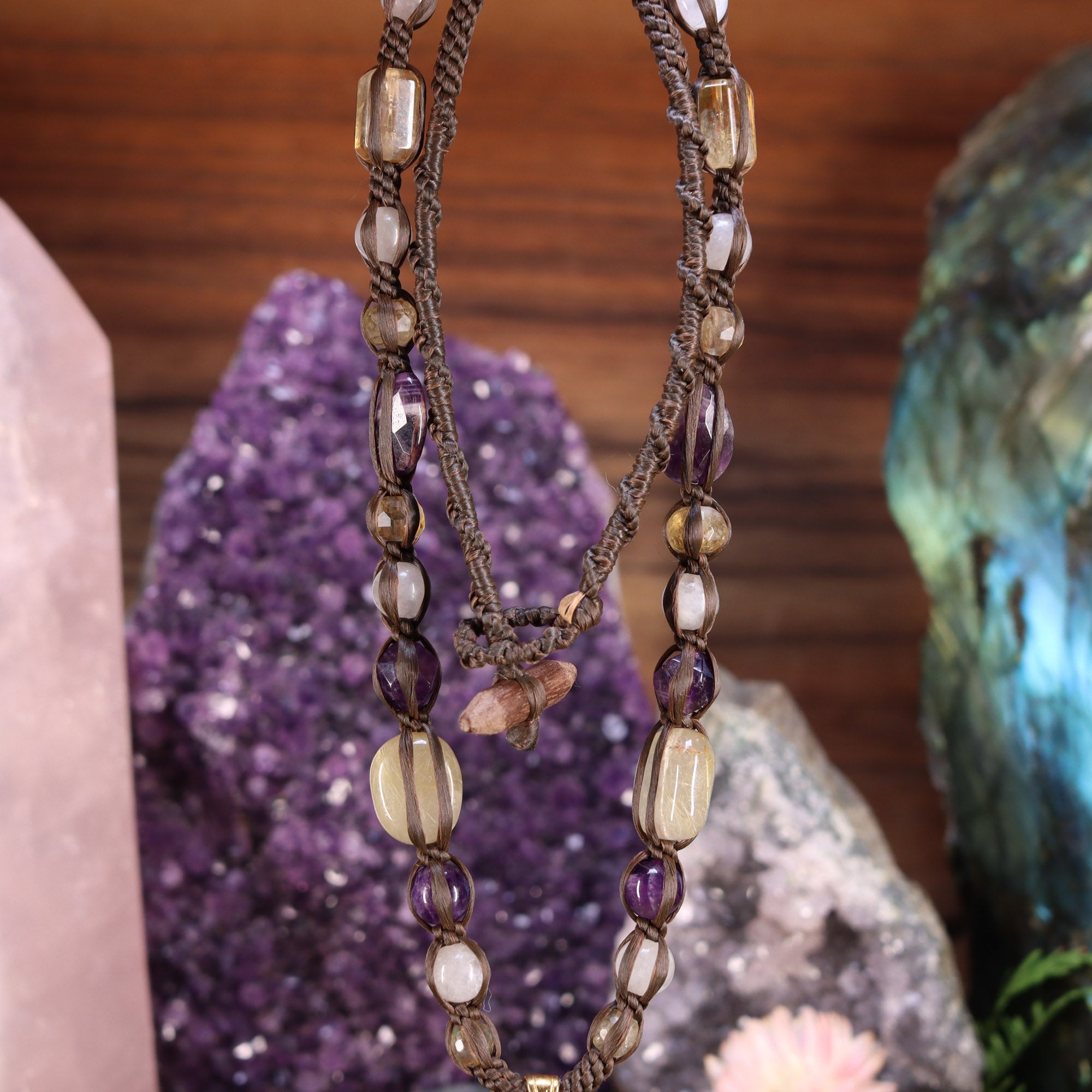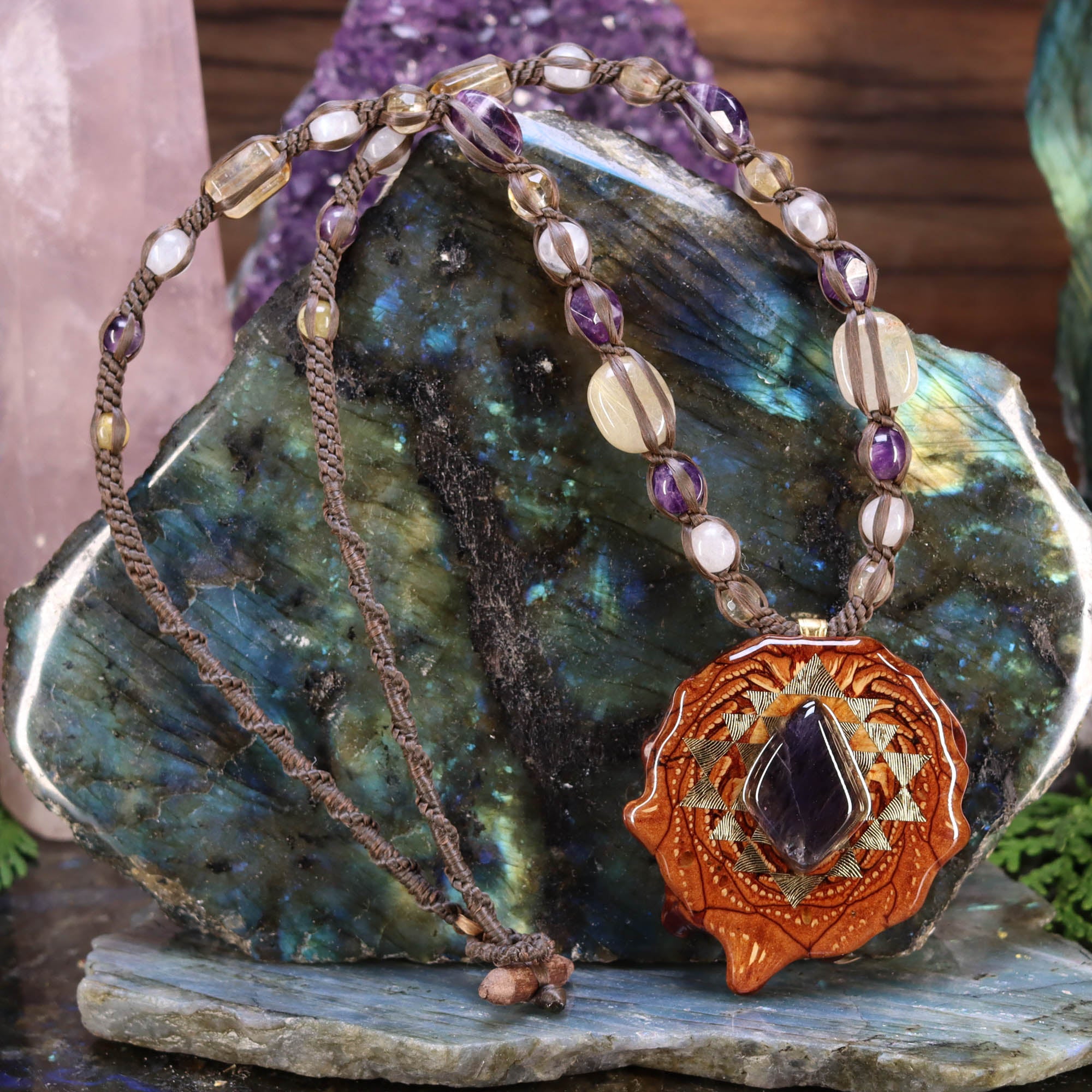 Hand-woven, this necklace features an Iolite Sunstone with Gold Sri Yantra pendant lovingly strung with Citrine, Moonstone, Amethyst, and Rutilated Quartz beads to activate and energize body, mind and spirit!