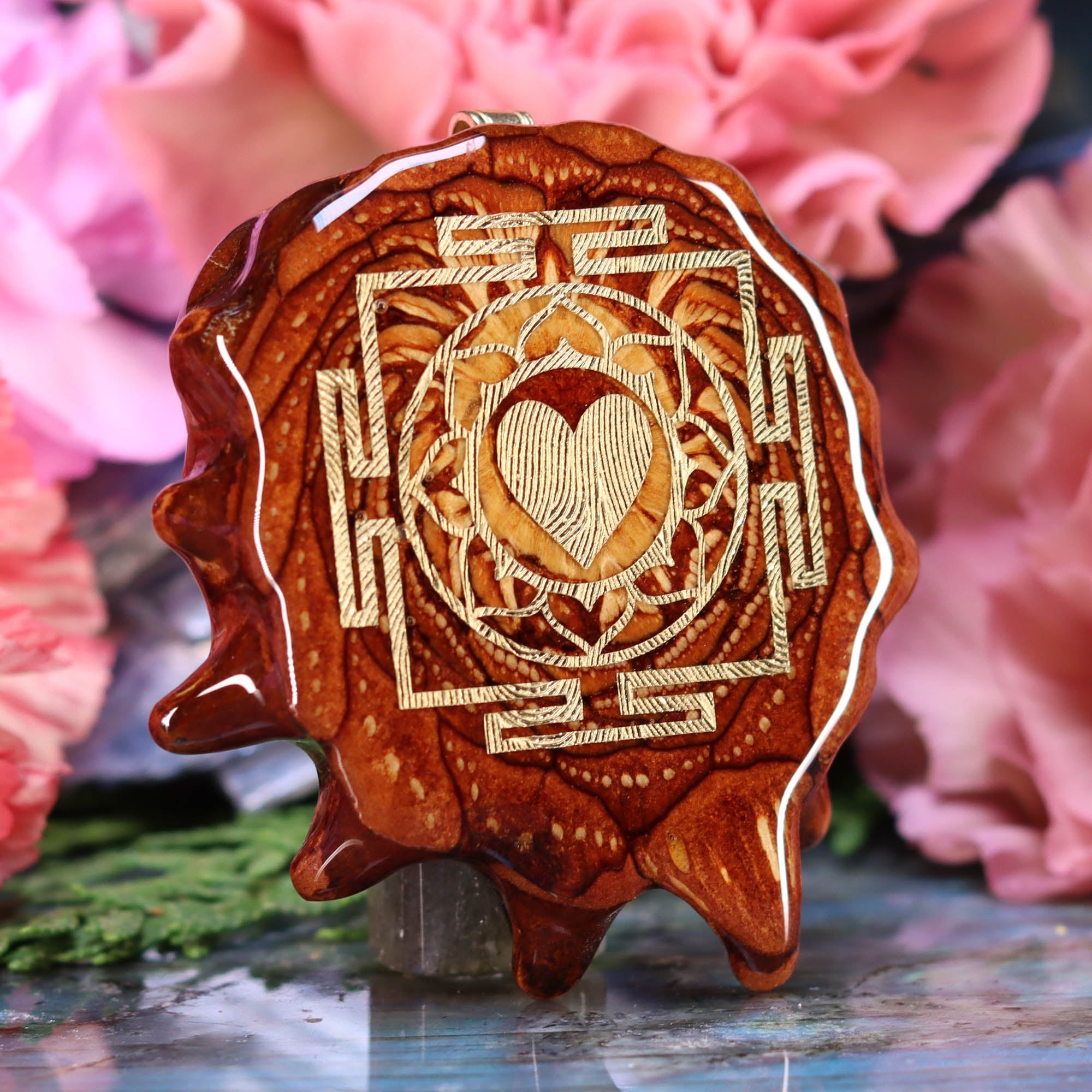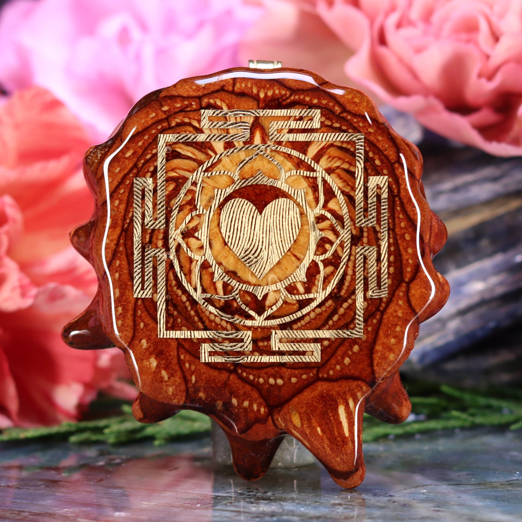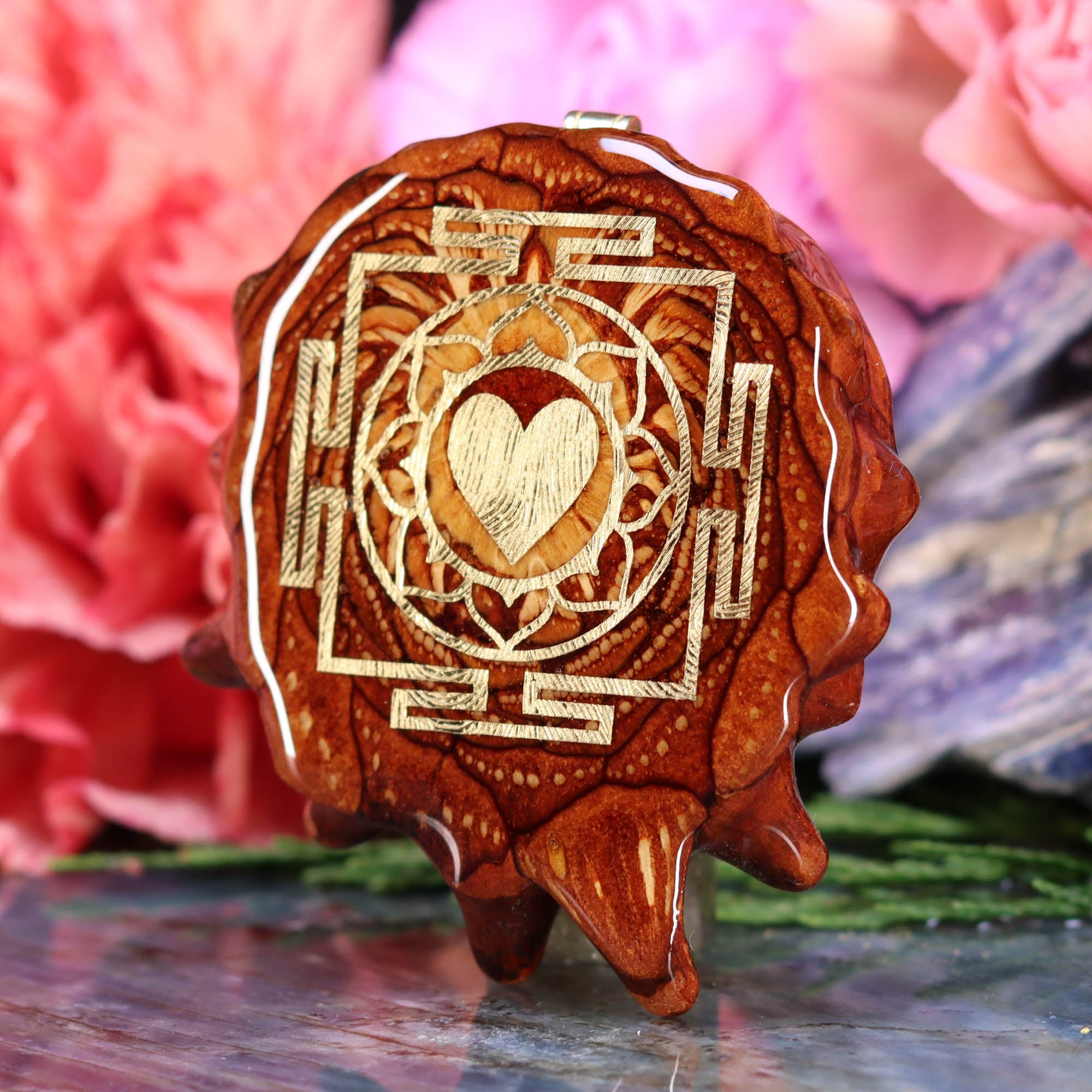 This Pinecone is adorned with a 24k Gold Kali Yantra. The Kali Yantra (also known as the Dakshinikali Yantra) is a geometric symbol existing in the external world as well as a subject to be internalized within human consciousness. Kali is the Hindu Goddess of time, and of change. She is the power of action, of the breath and of transformation (kriya-shakti). Kali's essence is Divine Love and through time, breath, and Divine Love all things are said to be accomplished. The Kali Yantra, then, contains within it the transformative energy of change.