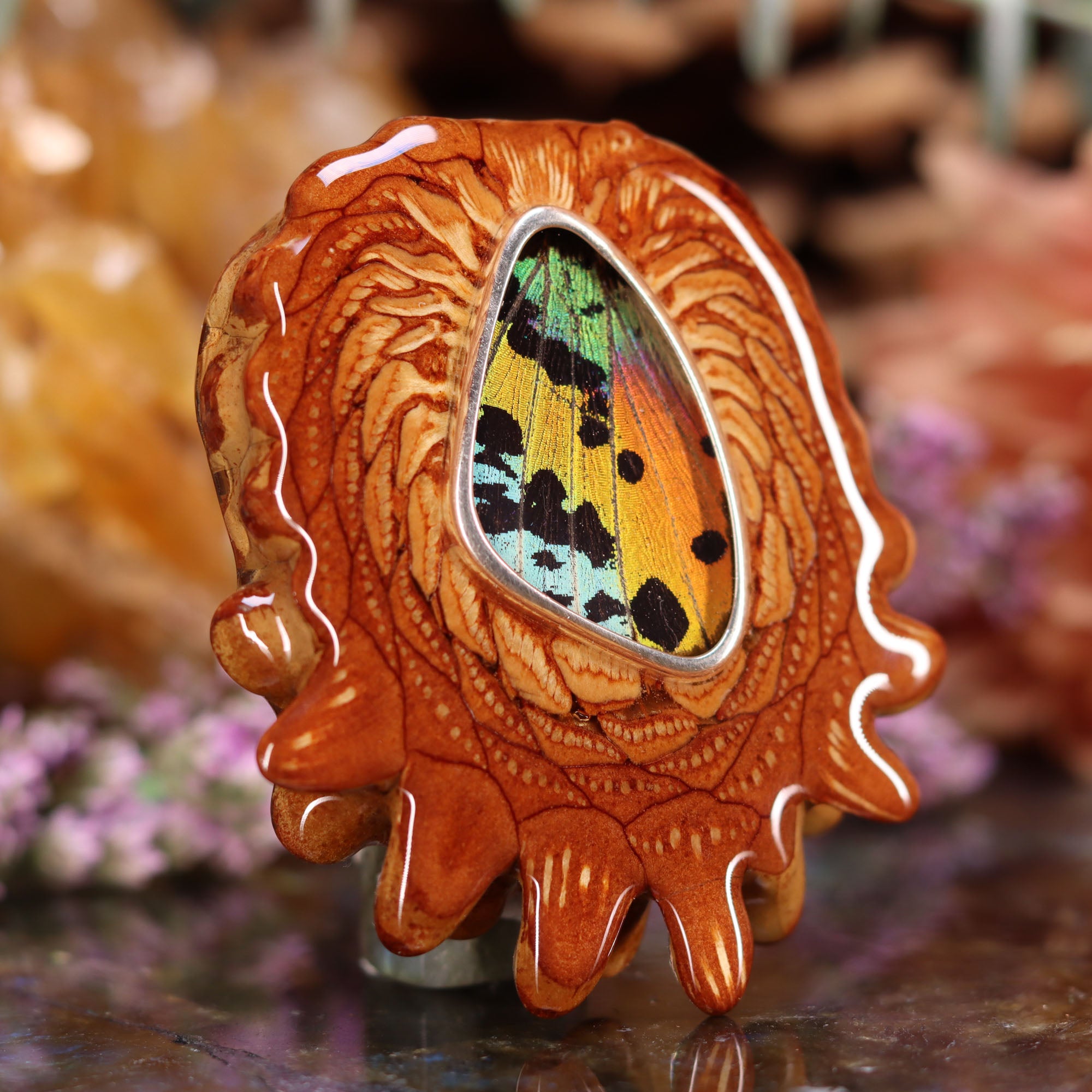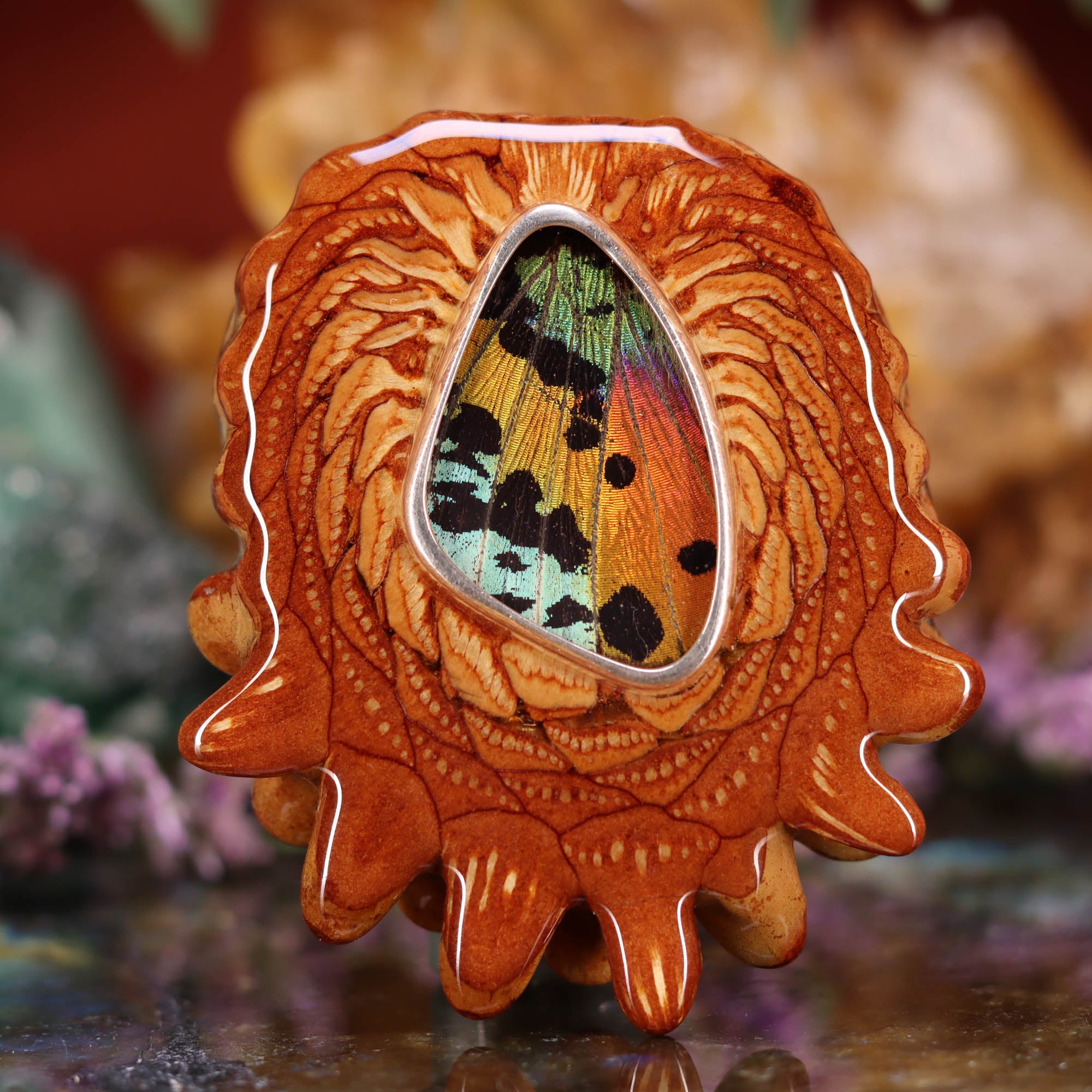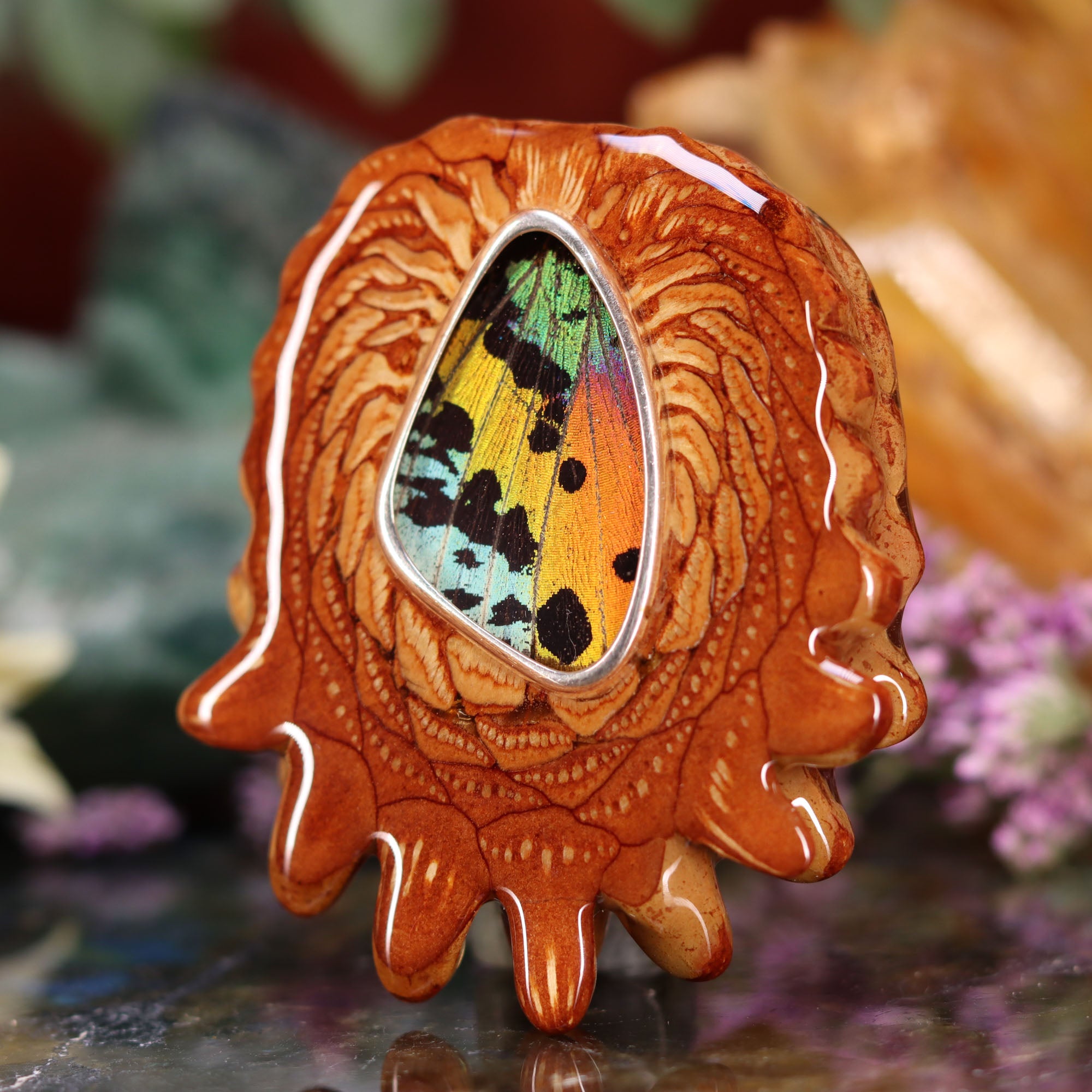This delicate Sunset Moth Butterfly Wing has been set in Sterling Silver, and inlaid into the center of one of our finest Pinecones. Each wing comes from a sustainable Peruvian butterfly farm -- helping to protect local rain forests from widespread cutting and burning by providing alternative livelihood for local indigenous peoples.