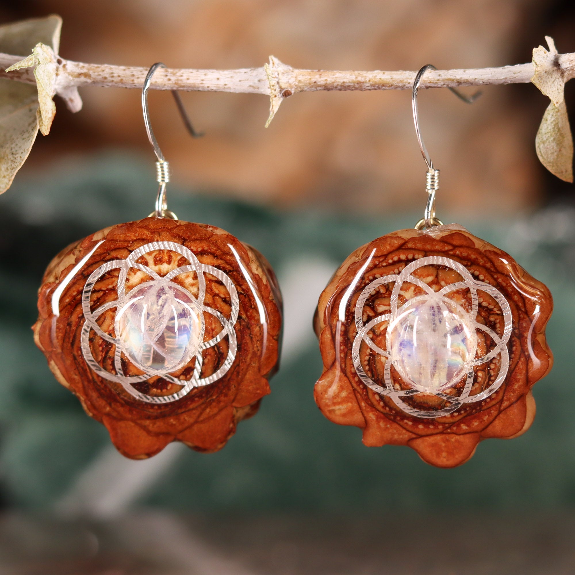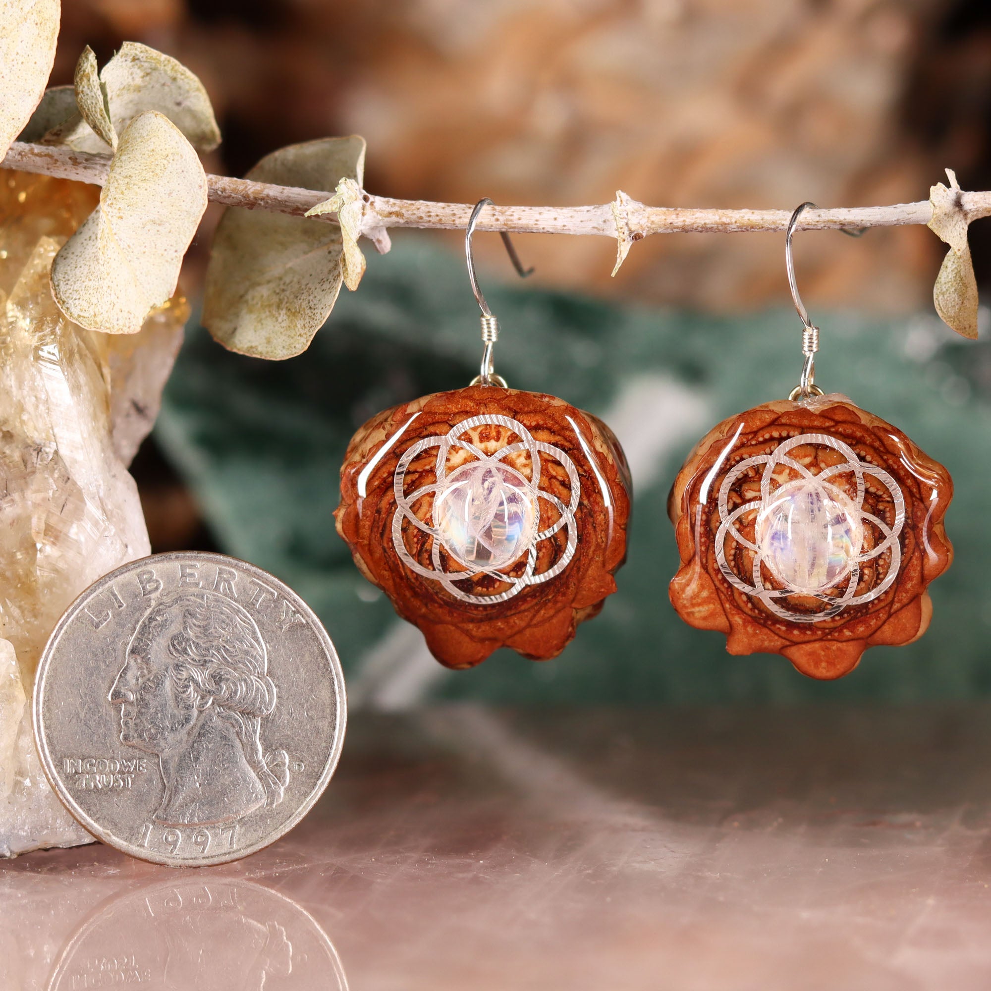These Pinecone Pendant Earrings have been blessed with the Seed of Life, cast in Sterling Silver. This sacred symbol serves as the foundation or "Seed" for the Flower of Life, and represents the Seven days of Creation.  It depicts the origins of all matter, in geometric perfection, with six circles (the six days of work) resting inside a seventh circle (the day of rest, the sabbath).