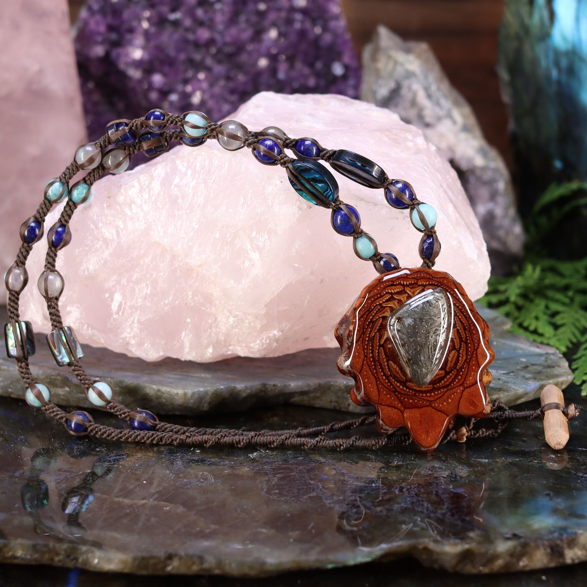 Hand-woven in Bellingham, WA, this necklace features a Feather Pyrite pendant lovingly strung with Lapis Lazuli, Amazonite, Abalone Shell, and Labradorite beads to activate and energize body, mind and spirit!