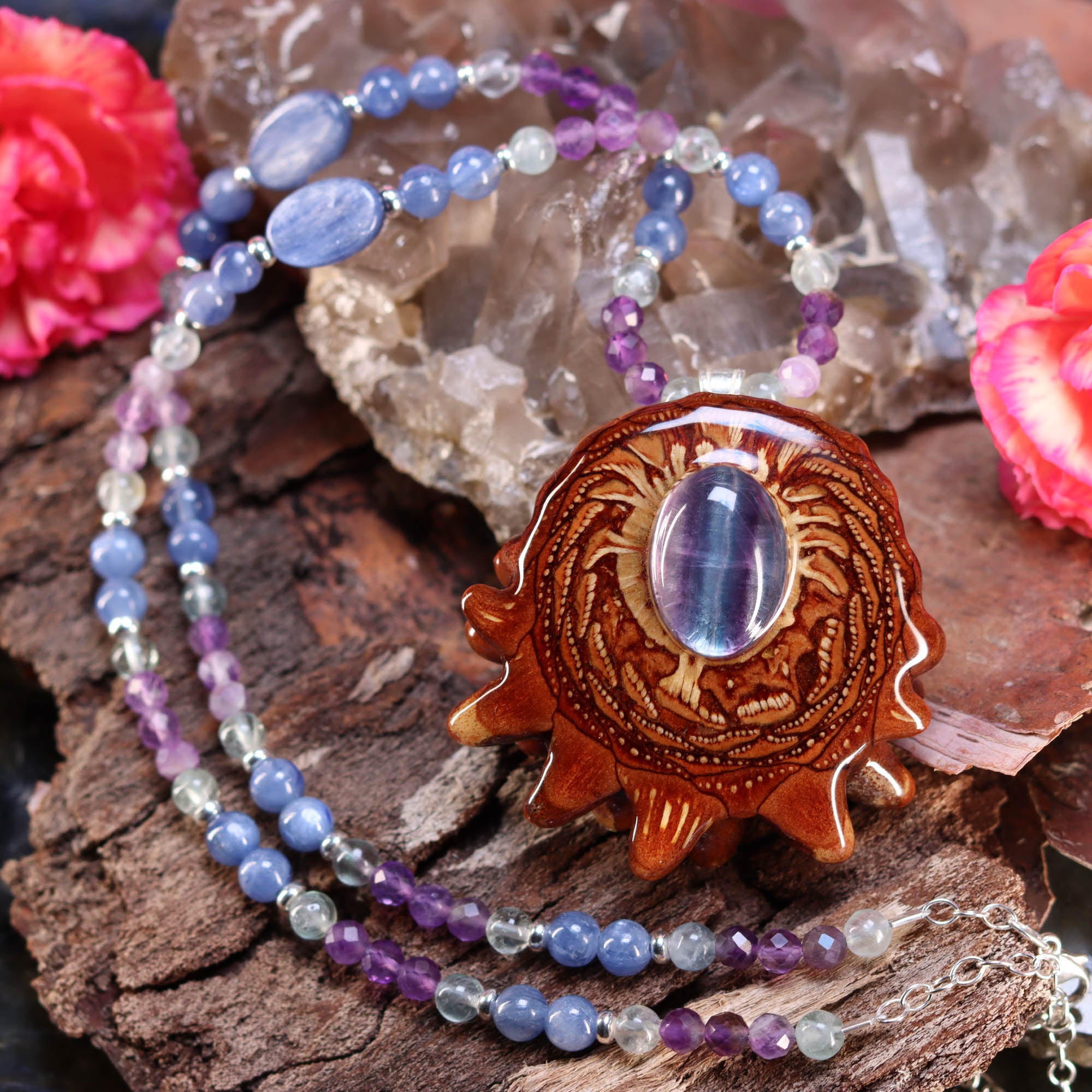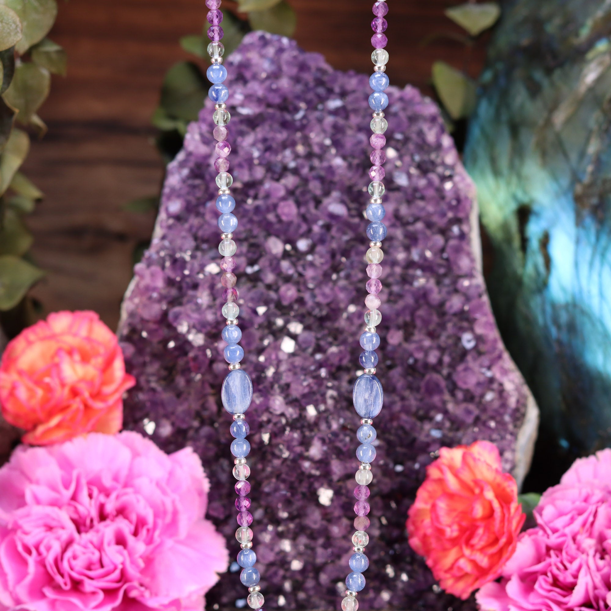 This necklace measures 17.5 inches (44.5 cm) and features a Fluorite pendant lovingly strung with a 4-inch length-adjustable Sterling Silver chain strung with Fluorite, Amethyst, and Blue Kyanite beads to activate and energize body, mind and spirit!