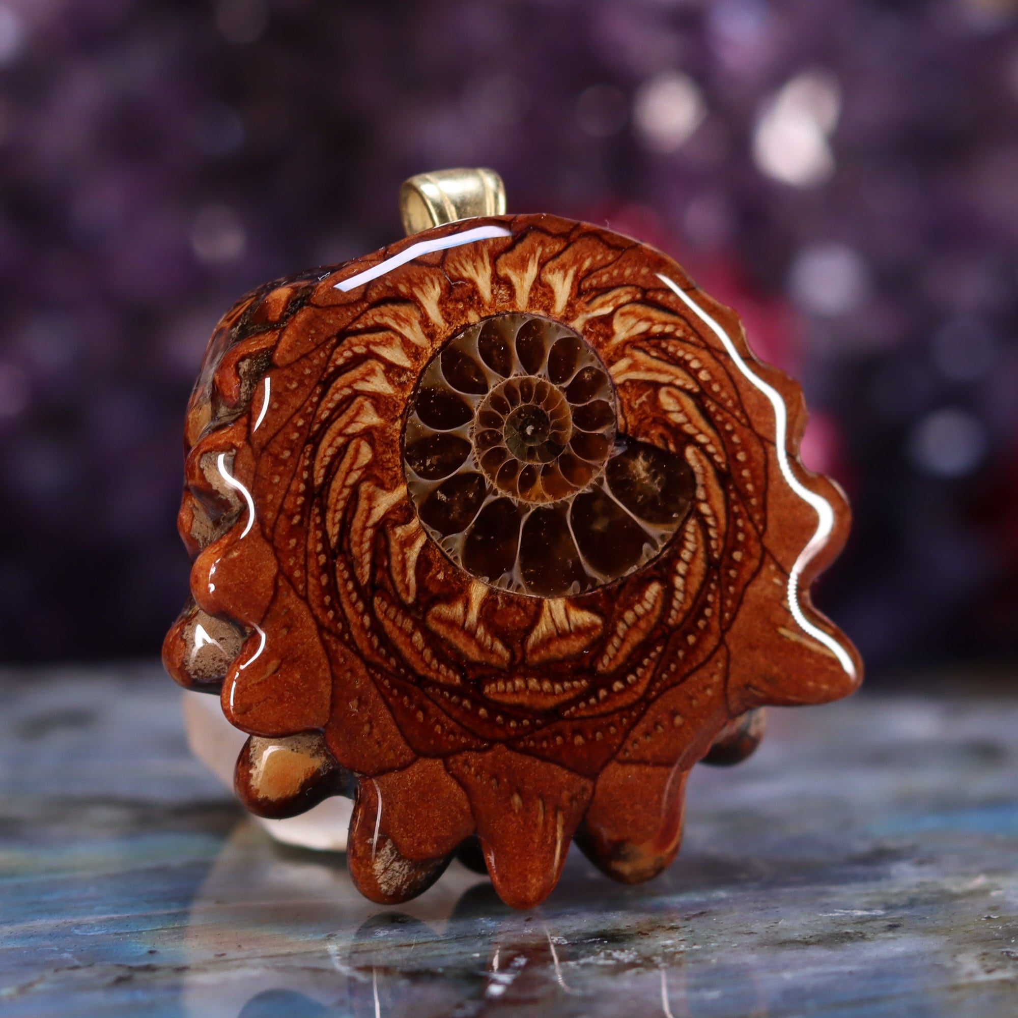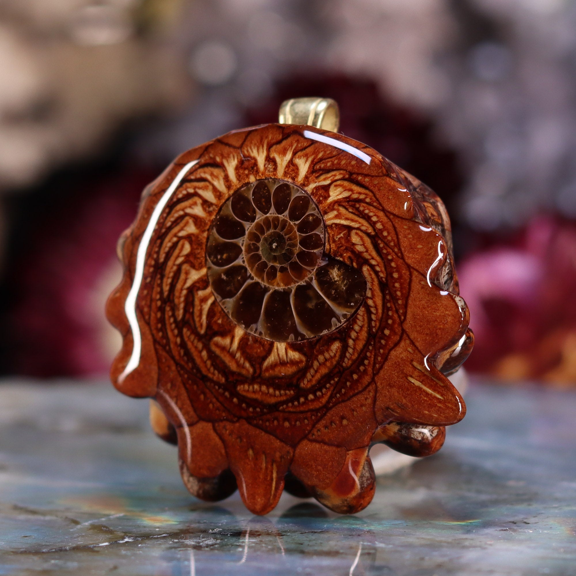 The 240 million year old ammonite fossils form a sacred geometrical shape called the "golden mean spiral," traveling both infinitely outward and infinitely inward. This spiral can be mathematically represented by the Fibonacci Sequence – the numerical foundation that depicts the underlying growth, movement, and evolution throughout all of nature. Plants unfurl, flowers bloom, and our galaxy spirals according to this sequence. The ammonites are fitted expertly into the center of each pine cone's mandala so as to blend the golden mean spirals of tree and shell into a single dynamic Fibonacci movement – evoking a sense of wonder and connectedness to our universe's greater intelligent design.