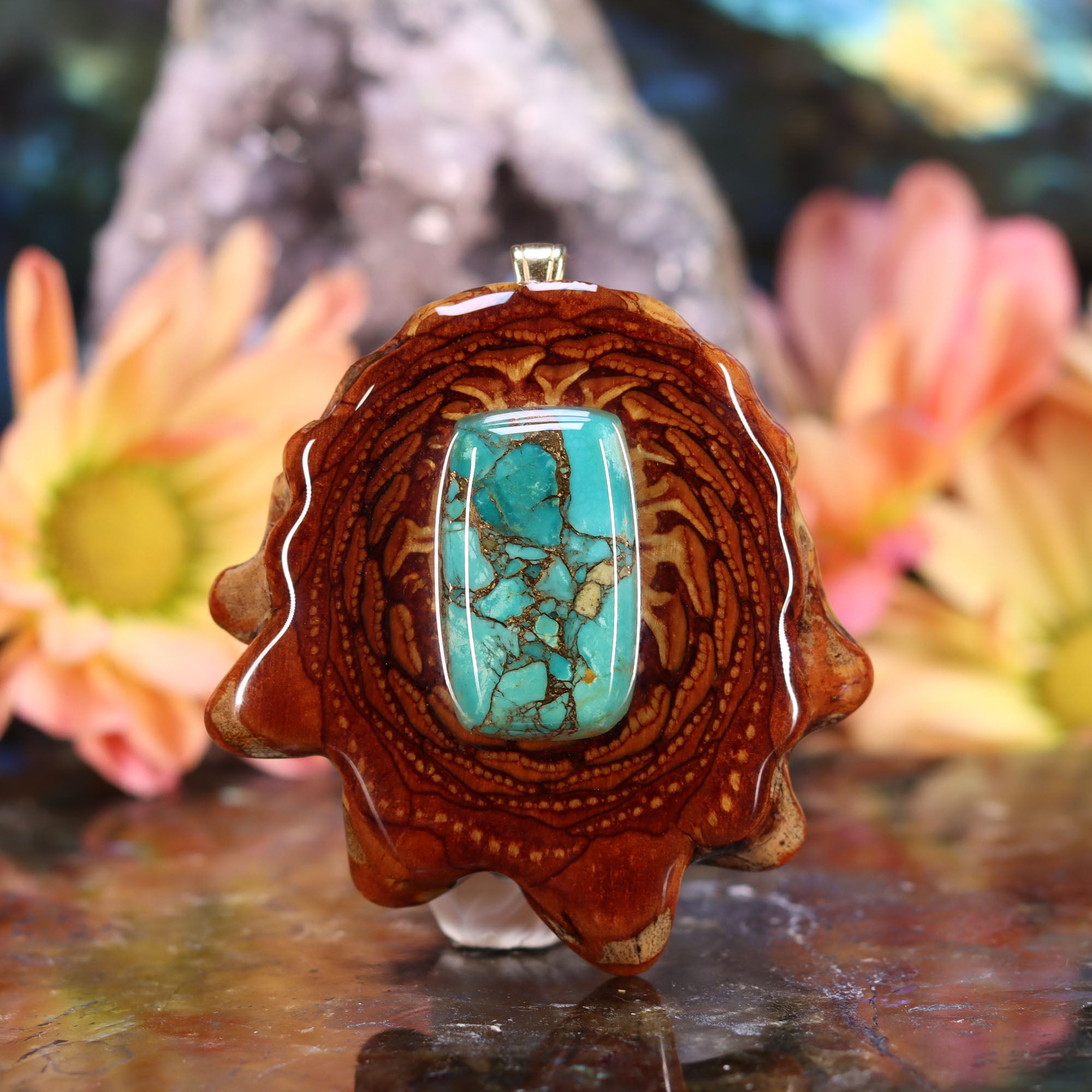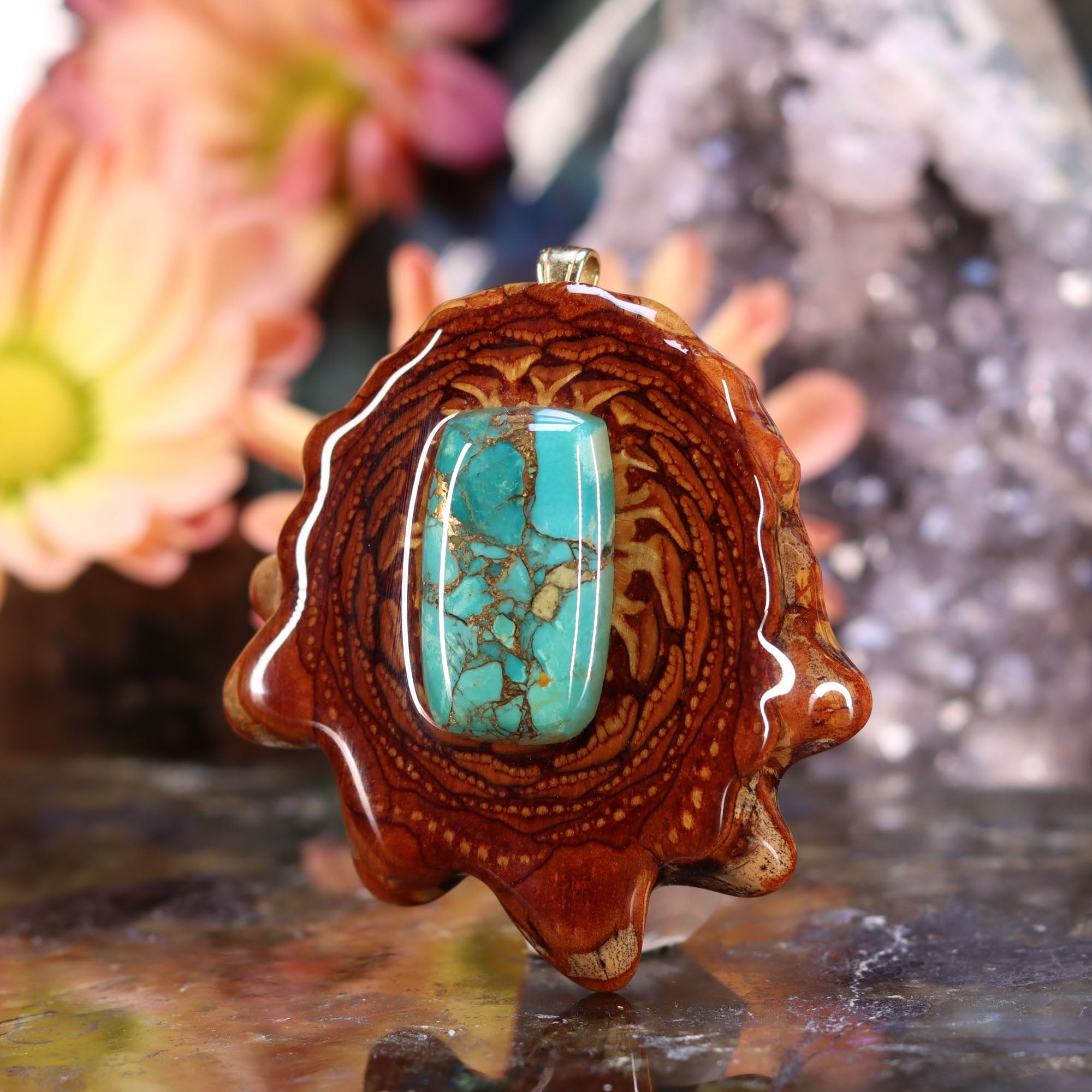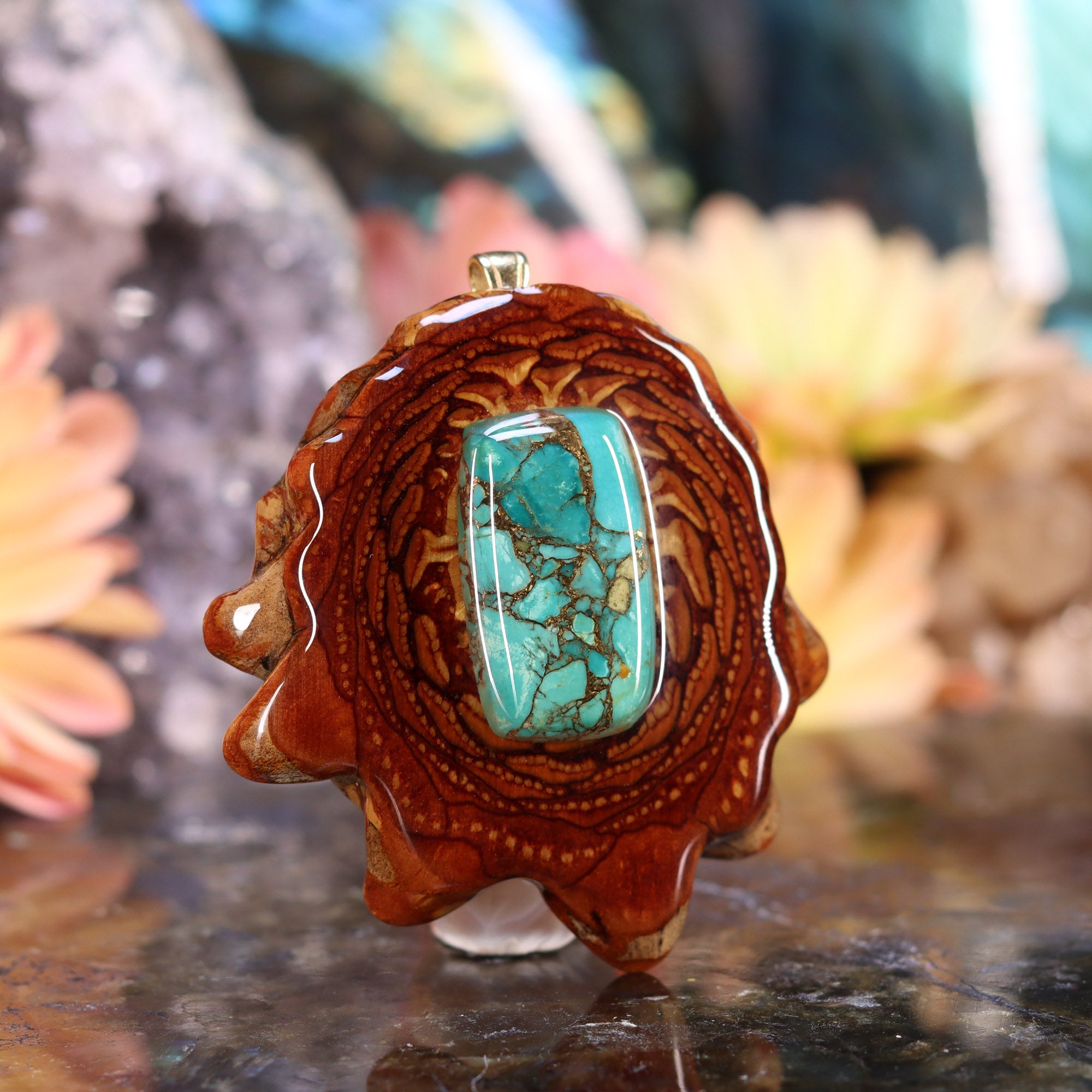 Every pinecone pendant is an elegant gift from Mother Nature -- unveiling the ornate Sacred Geometry hidden at the center of one of the world's densest Pinecones. Because only one cross-section is taken from the "heart" of each Cone, every pendant is absolutely unique, and truly one-of-a-kind.