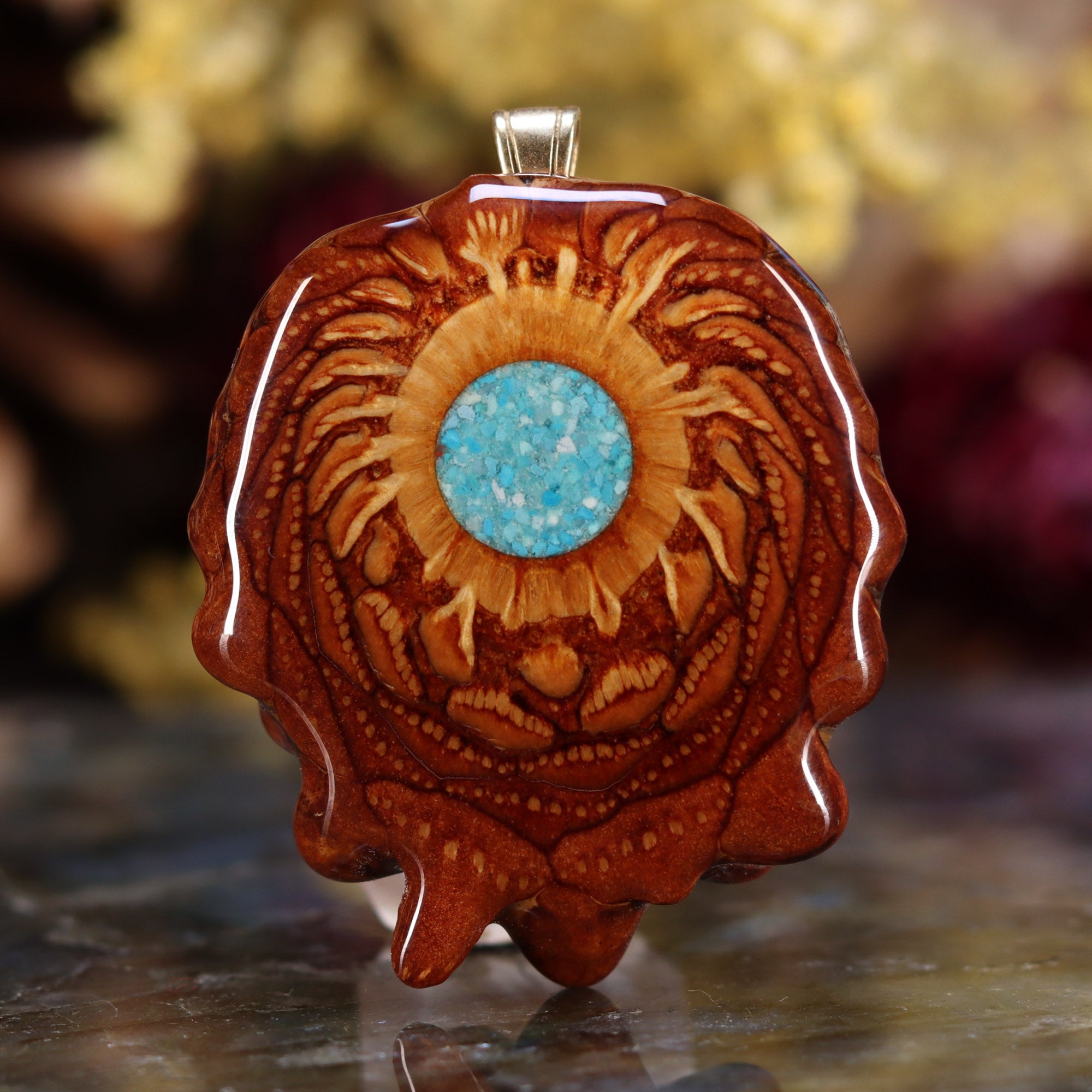 Crushed Turquoise has been carefully mixed with a Phosphorescent Powder, then inlaid into the center of this unique pendant -- causing it to gently "Glow" in the dark, in addition to its vibrant color during the day!