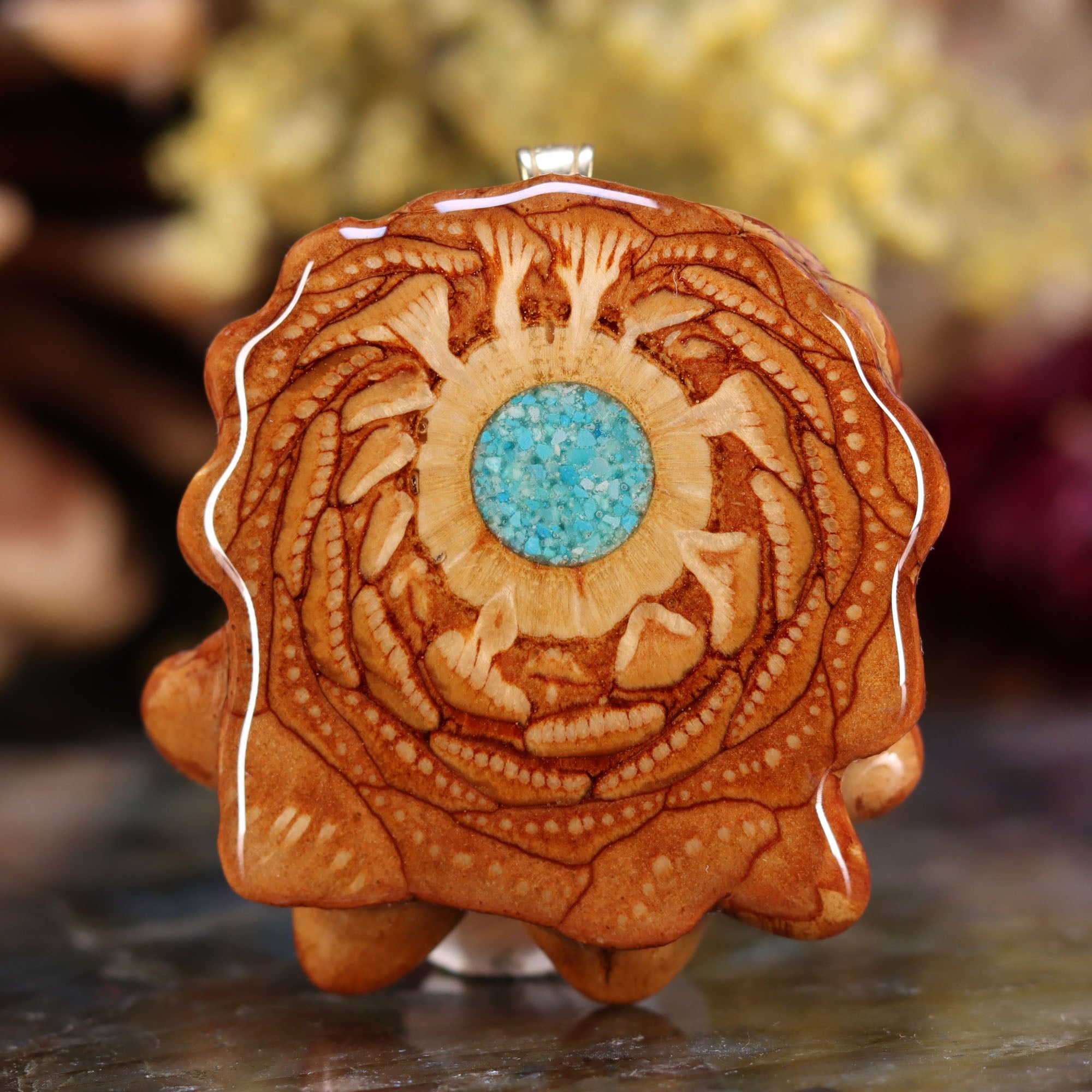 Crushed Turquoise has been carefully mixed with a Phosphorescent Powder, then inlaid into the center of this unique pendant -- causing it to gently "Glow" in the dark, in addition to its vibrant color during the day!