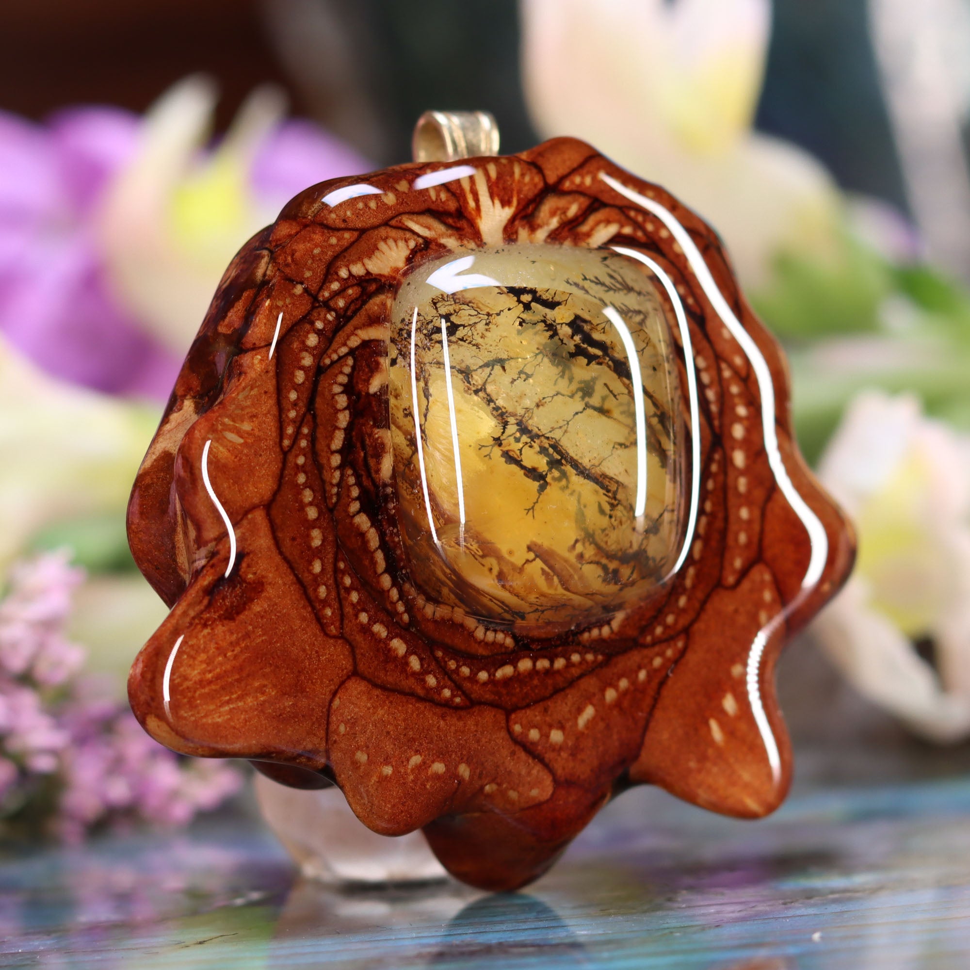 Every pinecone pendant is an elegant gift from Mother Nature -- unveiling the ornate Sacred Geometry hidden at the center of one of the world's densest Pinecones. Because only one cross-section is taken from the "heart" of each Cone, every pendant is absolutely unique, and truly one-of-a-kind.