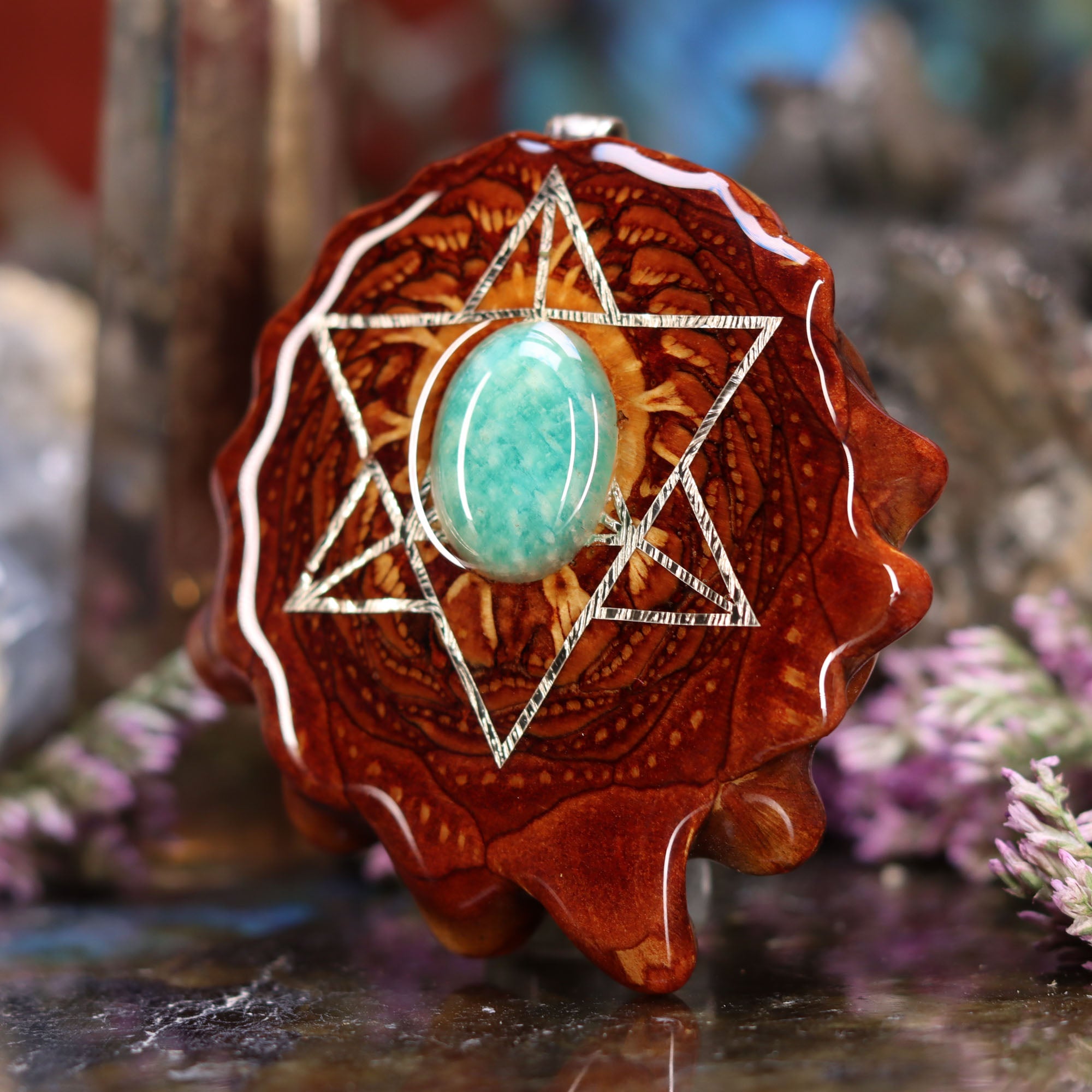 This Pinecone has been anointed with our "Merkaba" emblem, cast in Sterling Silver. Merkaba - "Mer" meaning Light, "Ka" meaning Spirit, and "Ba" meaning Body - is a powerful icon historically known as the "Vehicle of Ascension". The Merkaba opens the mind to increased awareness and promotes deep conscious interconnection.