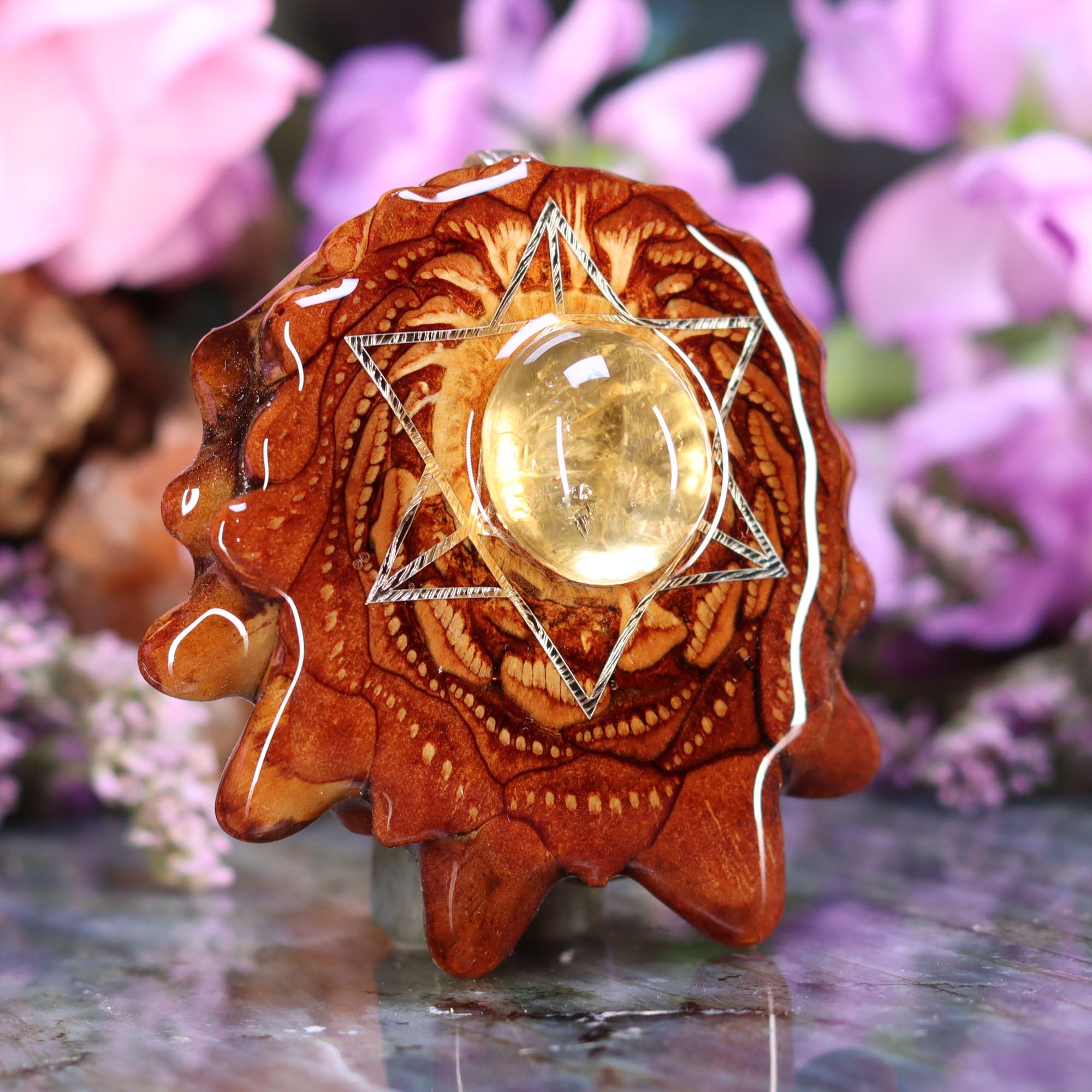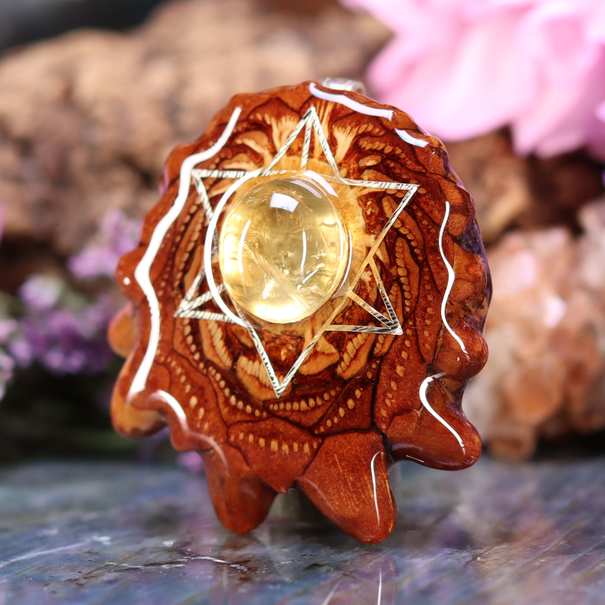 This Pinecone has been anointed with our "Merkaba" emblem, cast in Sterling Silver. Merkaba - "Mer" meaning Light, "Ka" meaning Spirit, and "Ba" meaning Body - is a powerful icon historically known as the "Vehicle of Ascension". The Merkaba opens the mind to increased awareness and promotes deep conscious interconnection.
