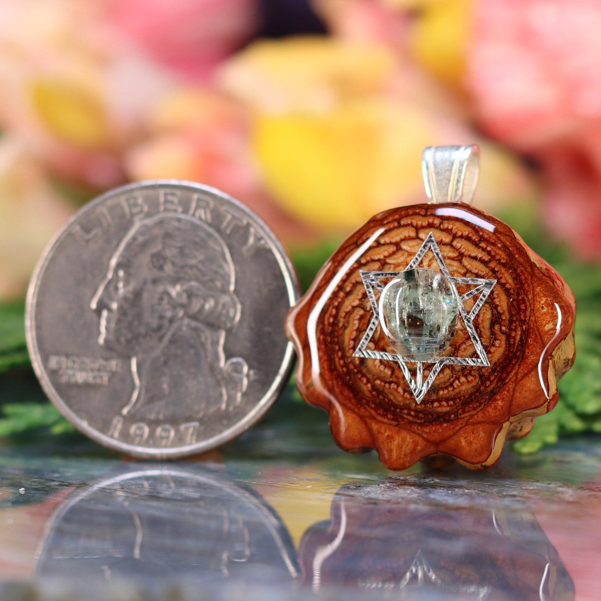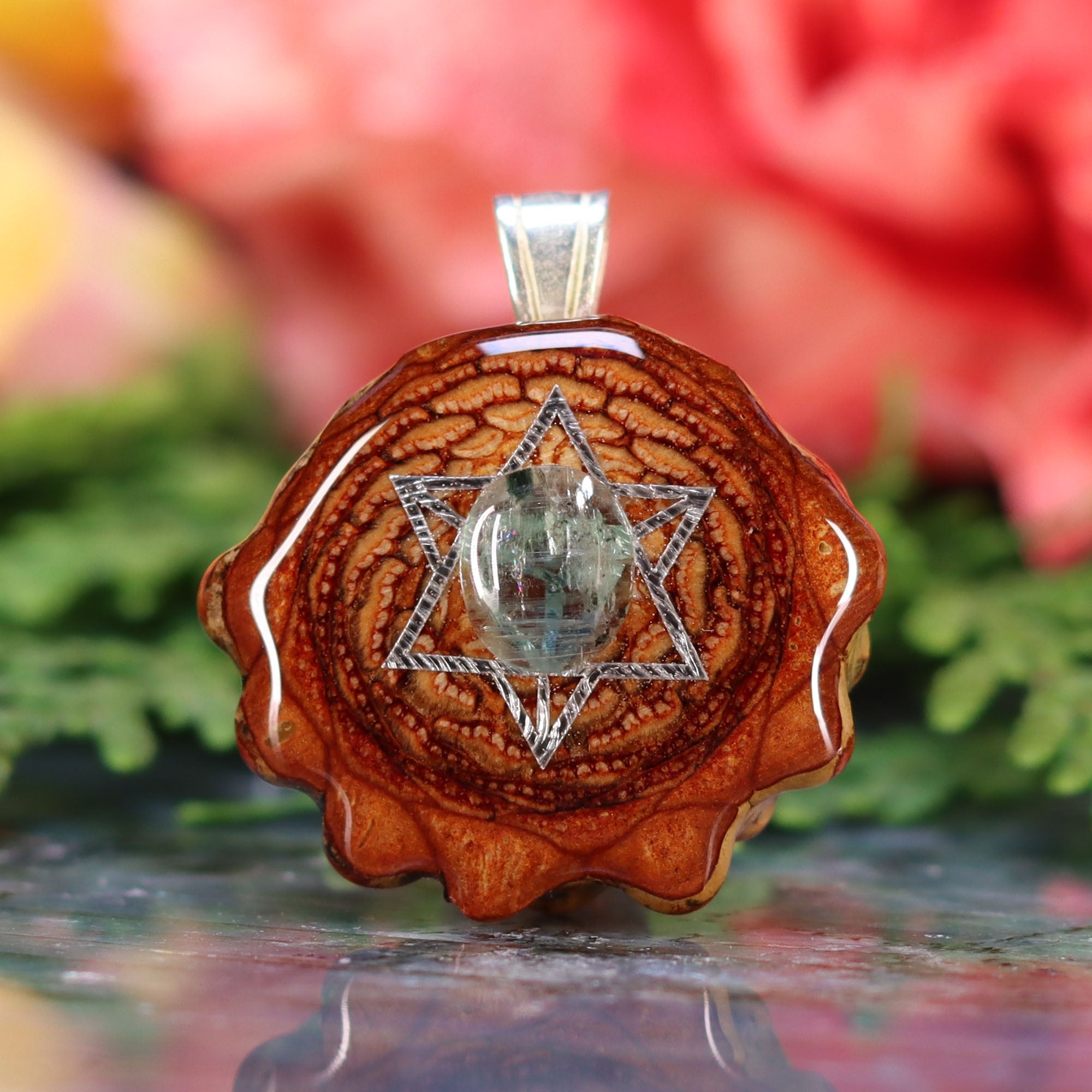 This Pinecone has been anointed with our "Merkaba" emblem, cast in Sterling Silver. Merkaba - "Mer" meaning Light, "Ka" meaning Spirit, and "Ba" meaning Body - is a powerful icon historically known as the "Vehicle of Ascension". The Merkaba opens the mind to increased awareness and promotes deep conscious interconnection.
