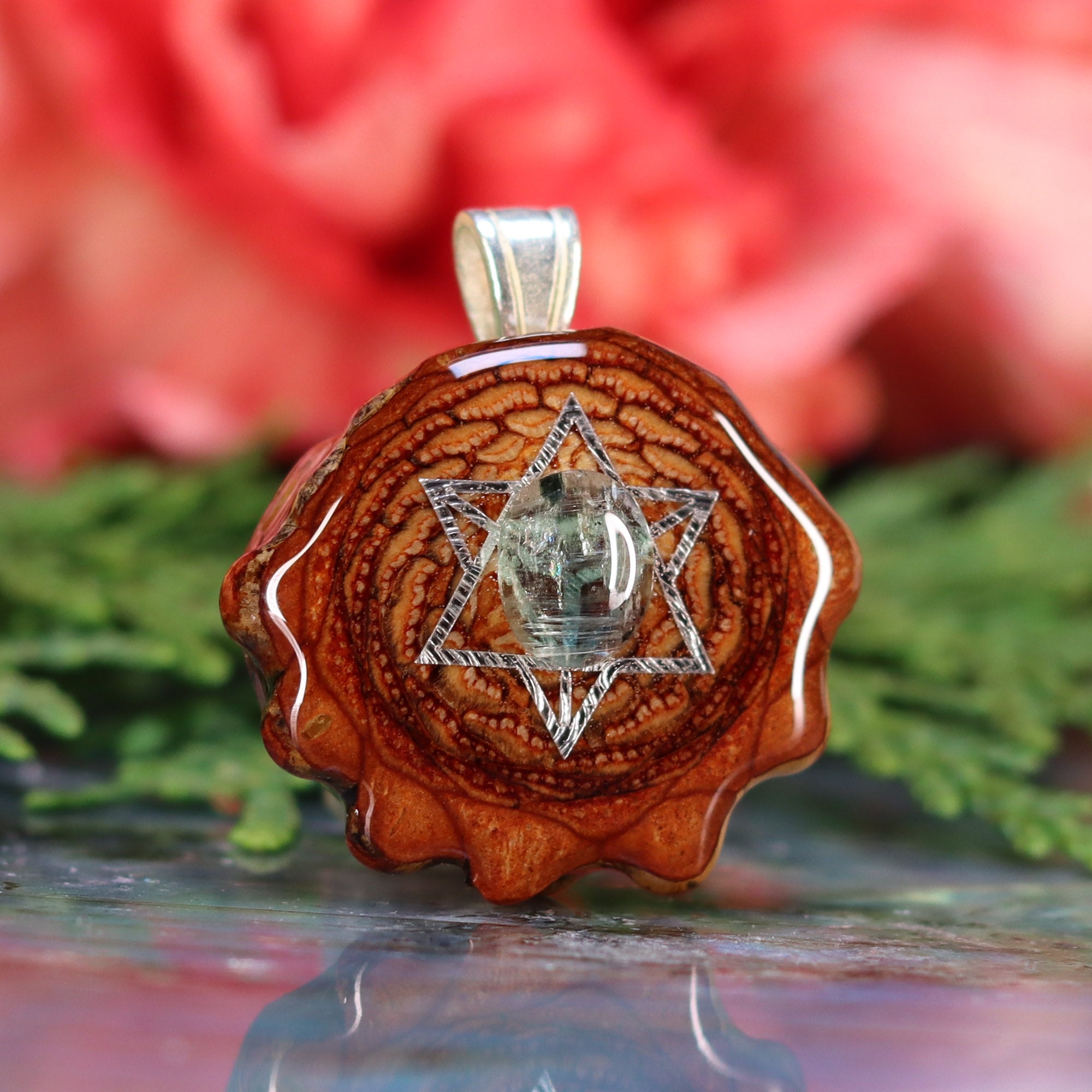 Every pinecone pendant is an elegant gift from Mother Nature -- unveiling the ornate Sacred Geometry hidden at the center of one of the world's densest Pinecones. Because only one cross-section is taken from the "heart" of each Cone, every pendant is absolutely unique, and truly one-of-a-kind.
