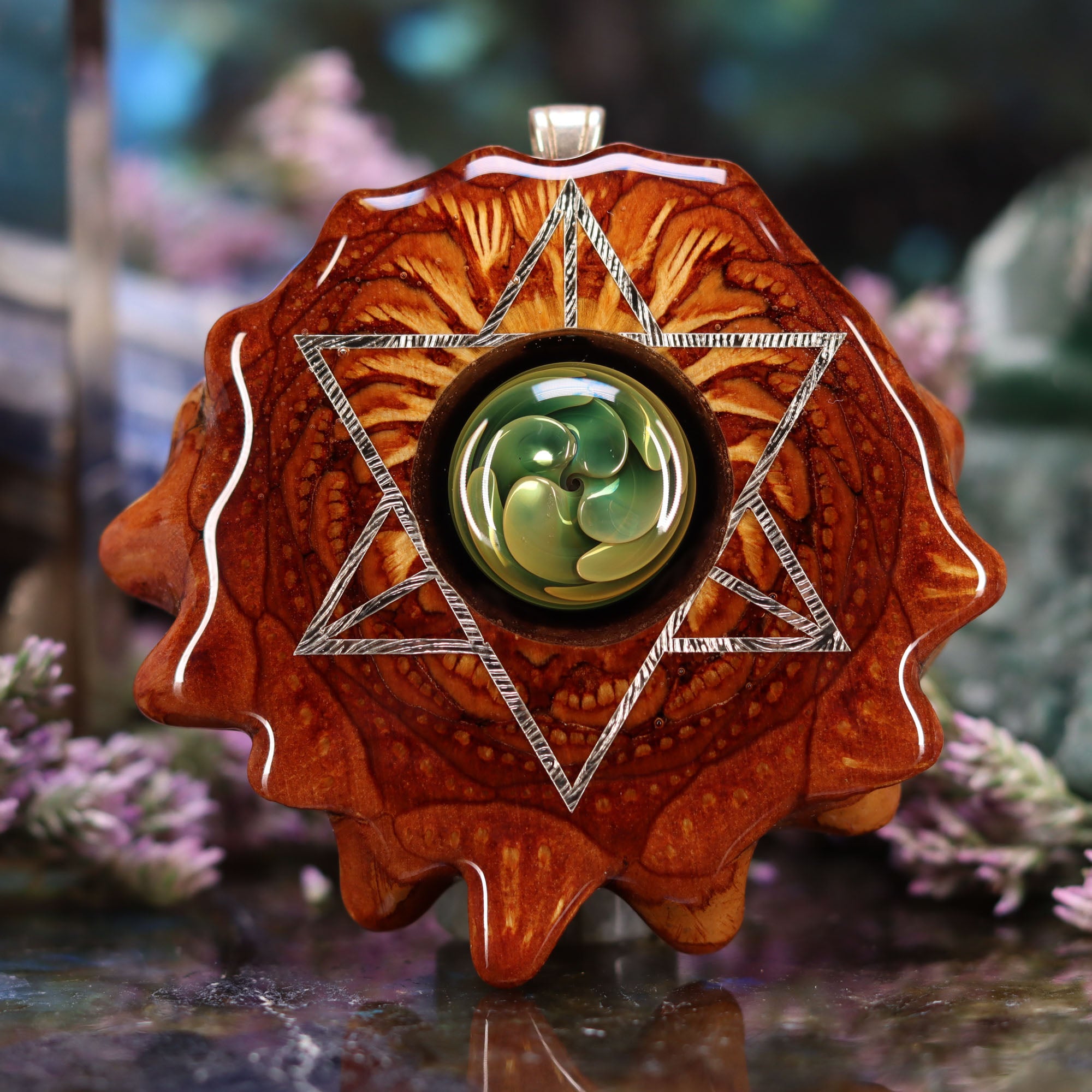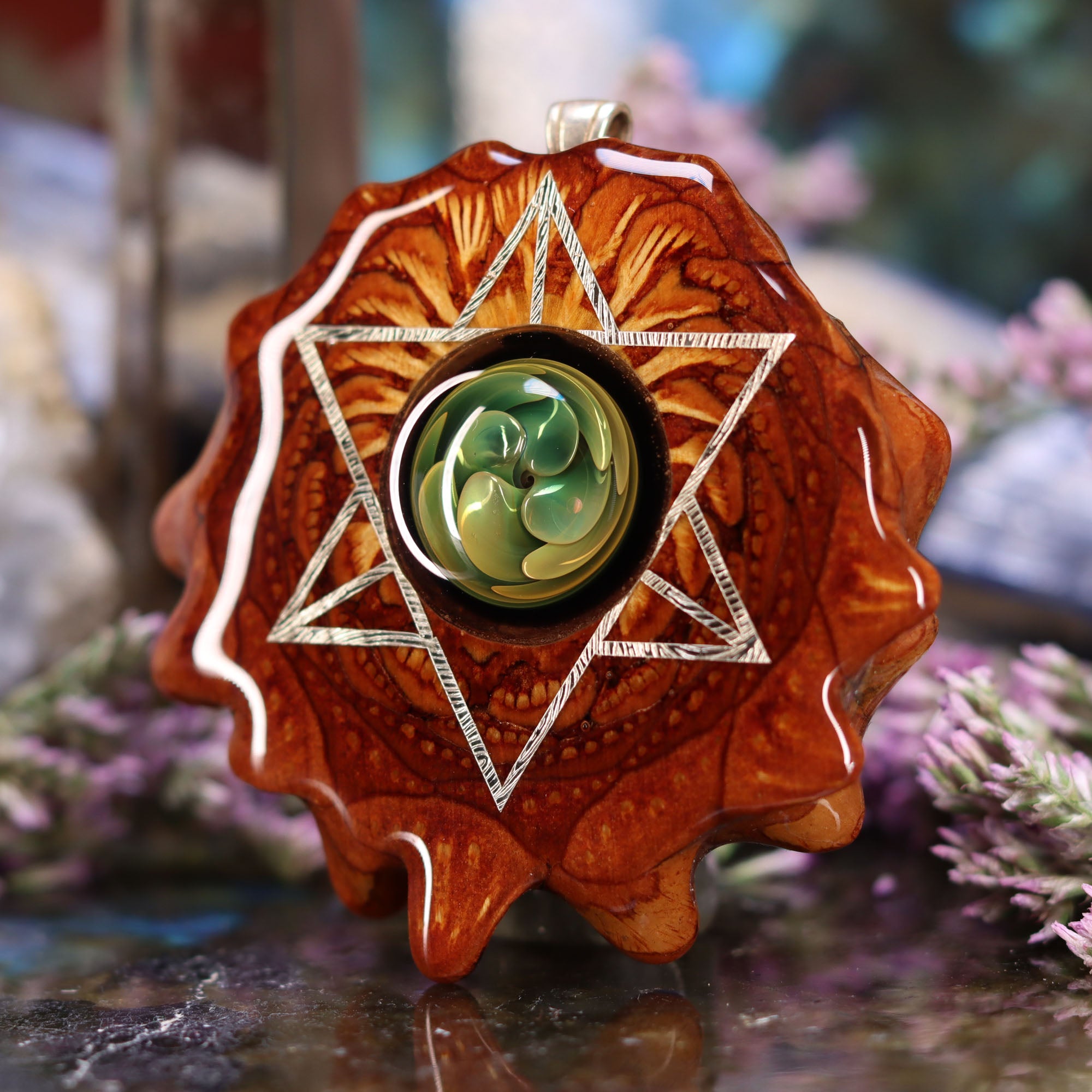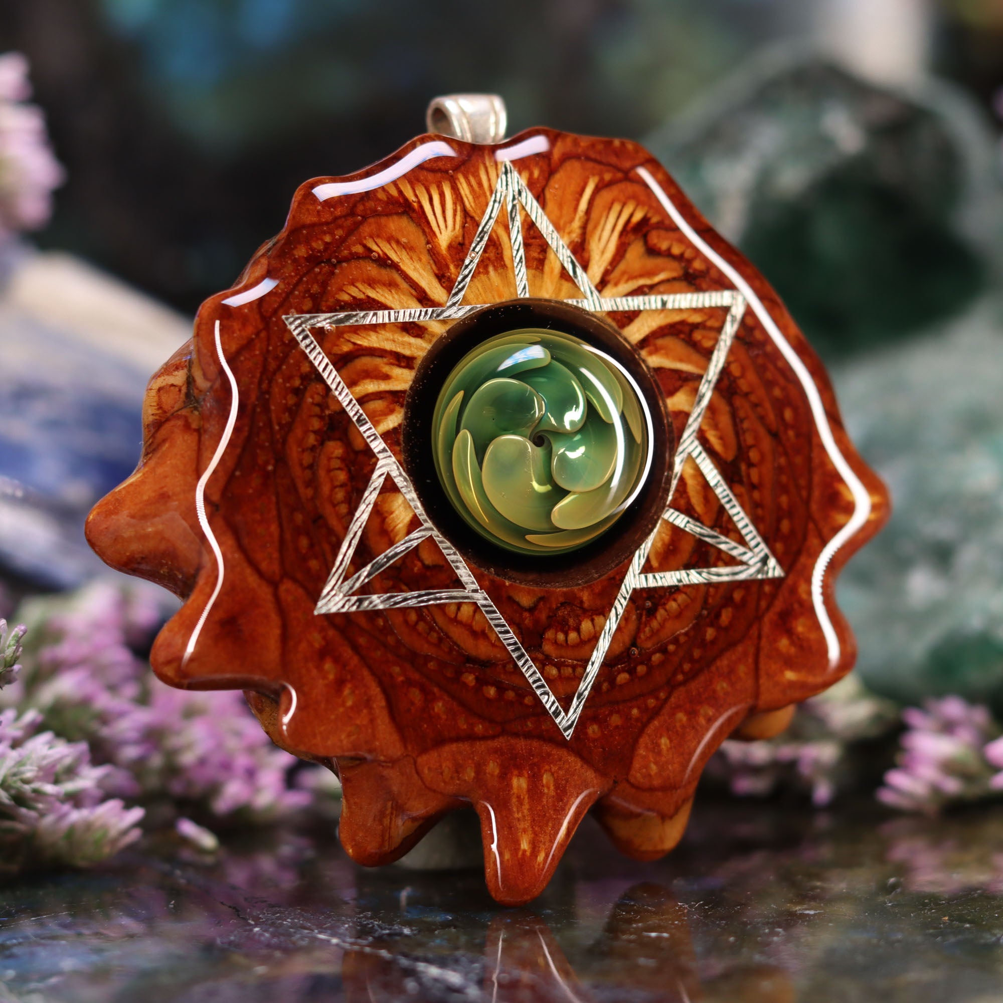 Created using a special flame-working technique known as “fume implosion,” these glass pieces are exposed to temperatures upwards of 5000 degrees. Each bead incorporates gold and silver fused into the glass – creating the gorgeous infinite multi-colored swirls seen within.This Pinecone has been anointed with our "Merkaba" emblem, cast in Sterling Silver. Merkaba - "Mer" meaning Light, "Ka" meaning Spirit, and "Ba" meaning Body - is a powerful icon historically known as the "Vehicle of Ascension". The Merkaba opens the mind to increased awareness and promotes deep conscious interconnection.