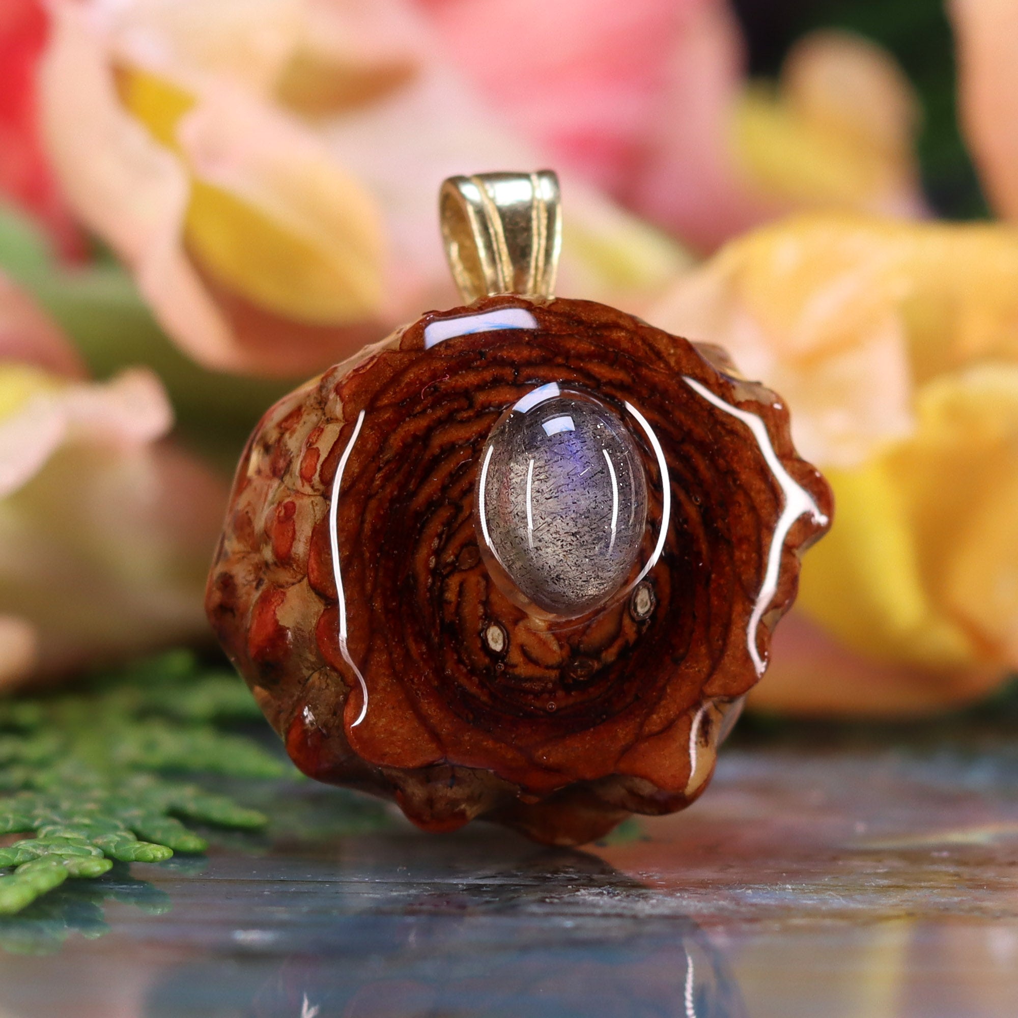 Every pinecone pendant is an elegant gift from Mother Nature -- unveiling the ornate Sacred Geometry hidden at the center of one of the world's densest Pinecones. Because only one cross-section is taken from the "heart" of each Cone, every pendant is absolutely unique, and truly one-of-a-kind.
