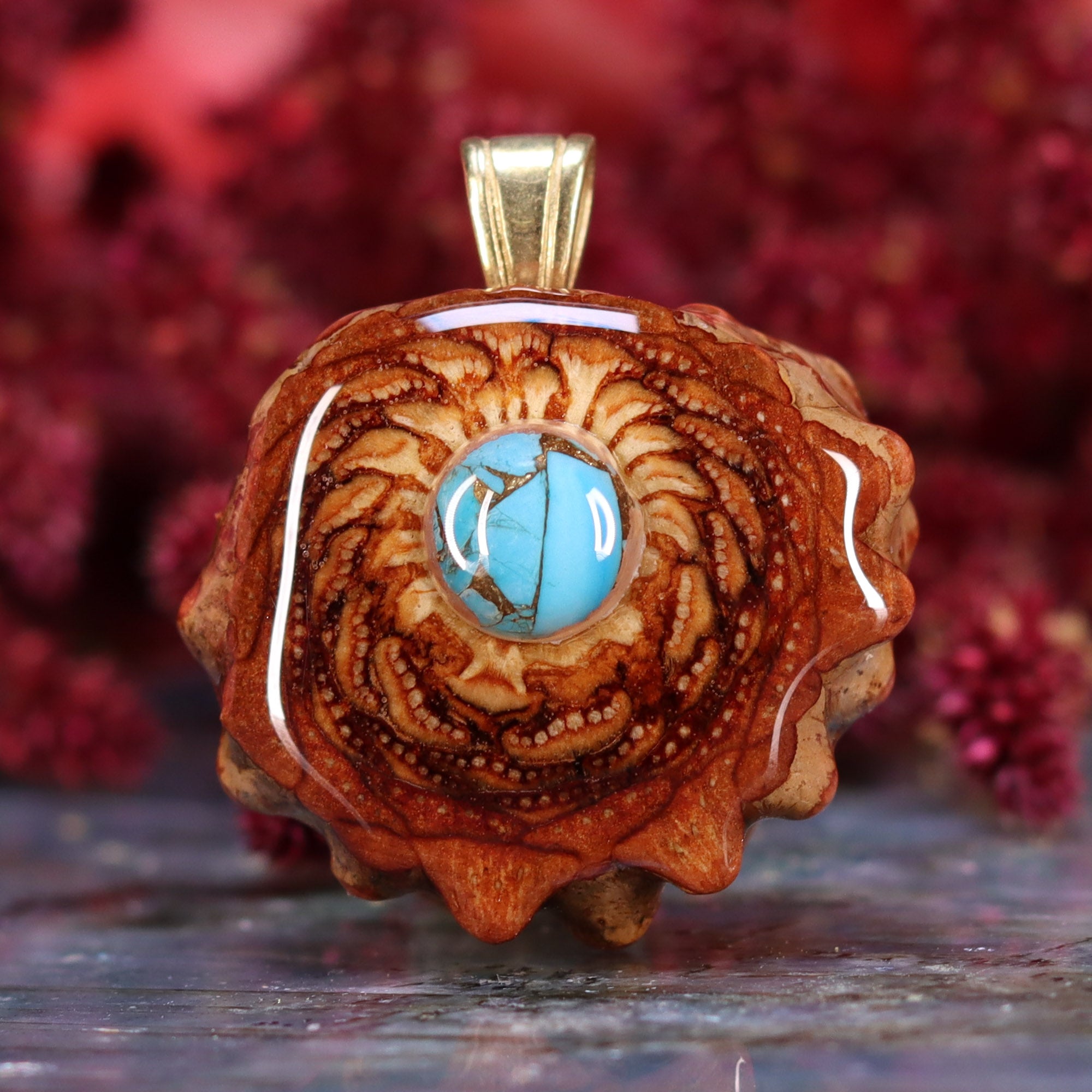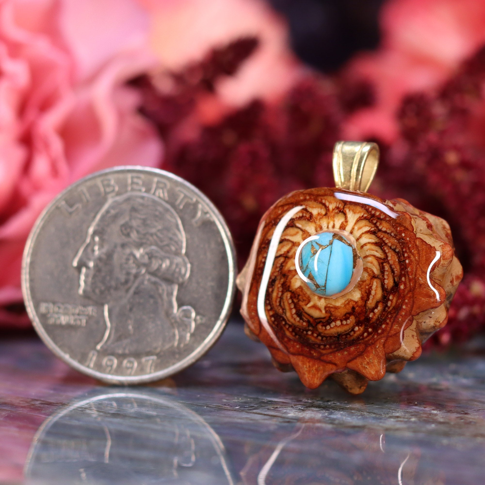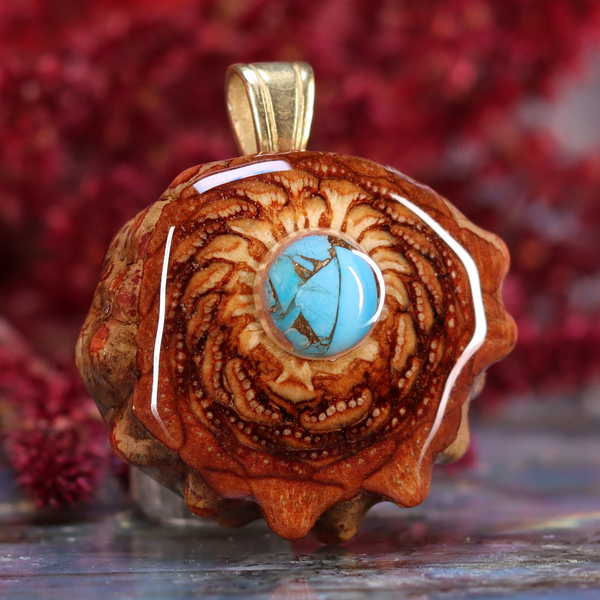 Every pinecone pendant is an elegant gift from Mother Nature -- unveiling the ornate Sacred Geometry hidden at the center of one of the world's densest Pinecones. Because only one cross-section is taken from the "heart" of each Cone, every pendant is absolutely unique, and truly one-of-a-kind.