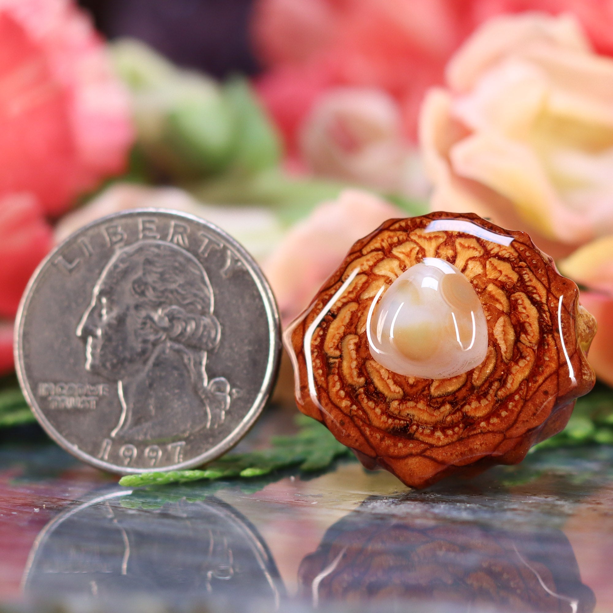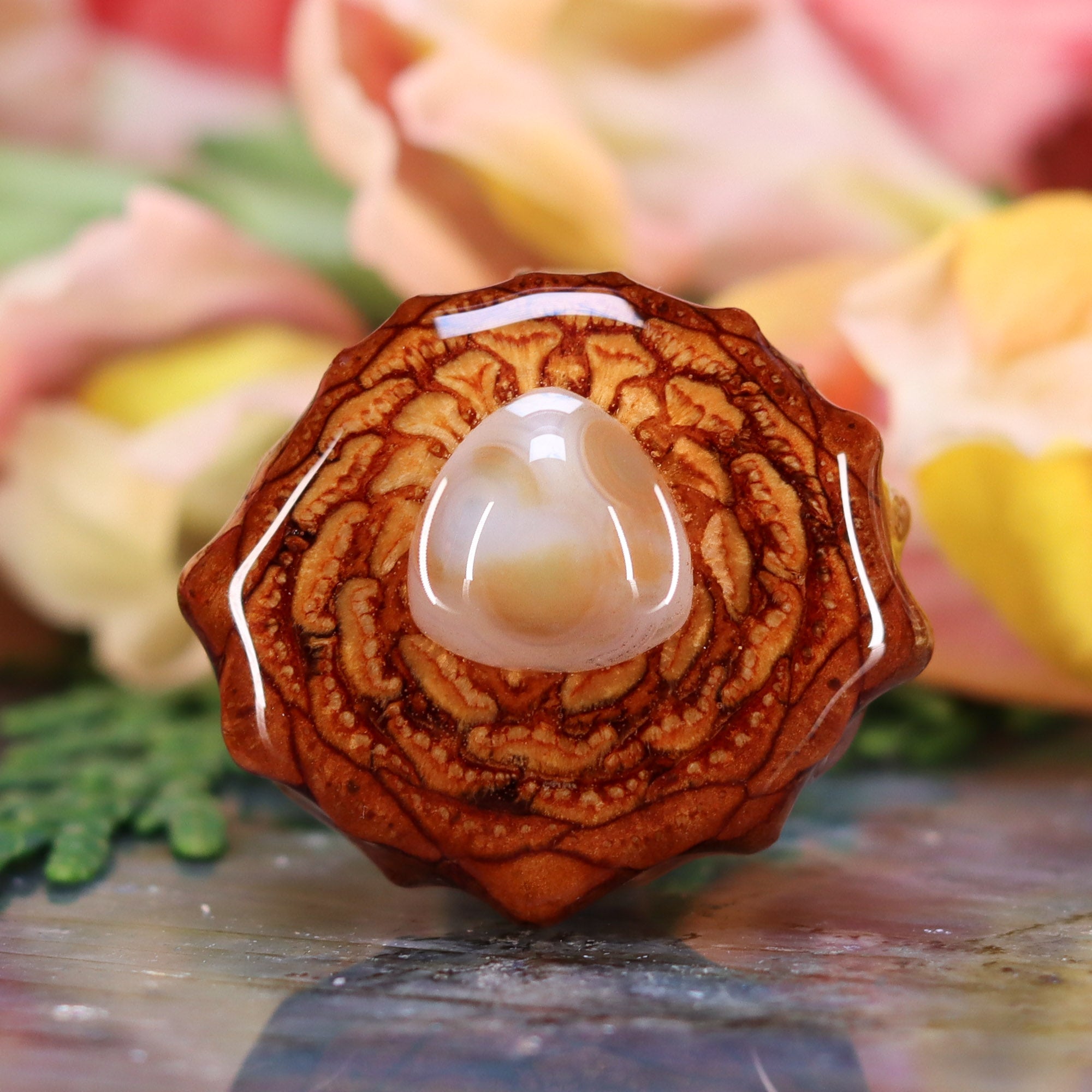 Every pinecone pendant is an elegant gift from Mother Nature -- unveiling the ornate Sacred Geometry hidden at the center of one of the world's densest Pinecones. Because only one cross-section is taken from the "heart" of each Cone, every pendant is absolutely unique, and truly one-of-a-kind.