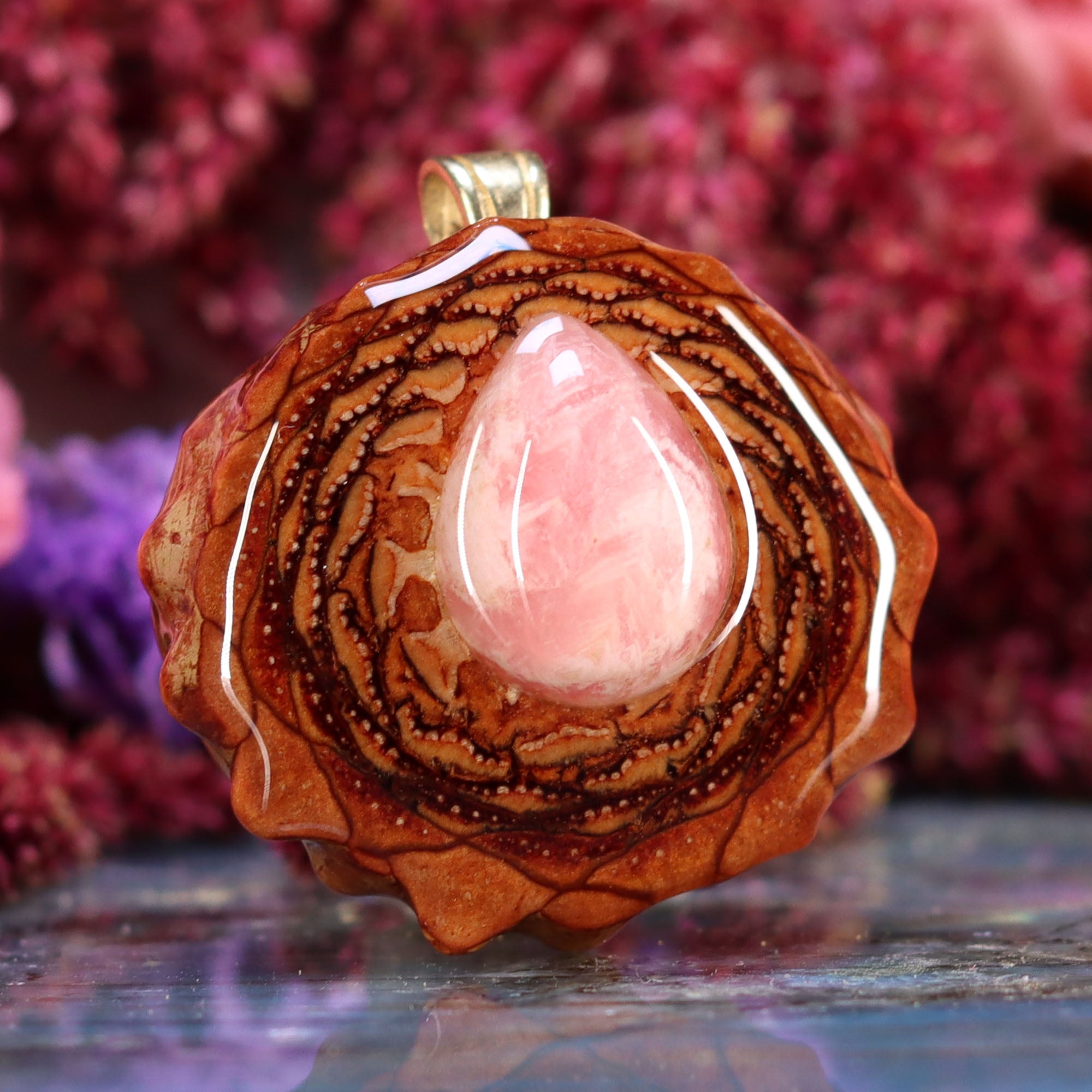 Every pinecone pendant is an elegant gift from Mother Nature -- unveiling the ornate Sacred Geometry hidden at the center of one of the world's densest Pinecones. Because only one cross-section is taken from the "heart" of each Cone, every pendant is absolutely unique, and truly one-of-a-kind.