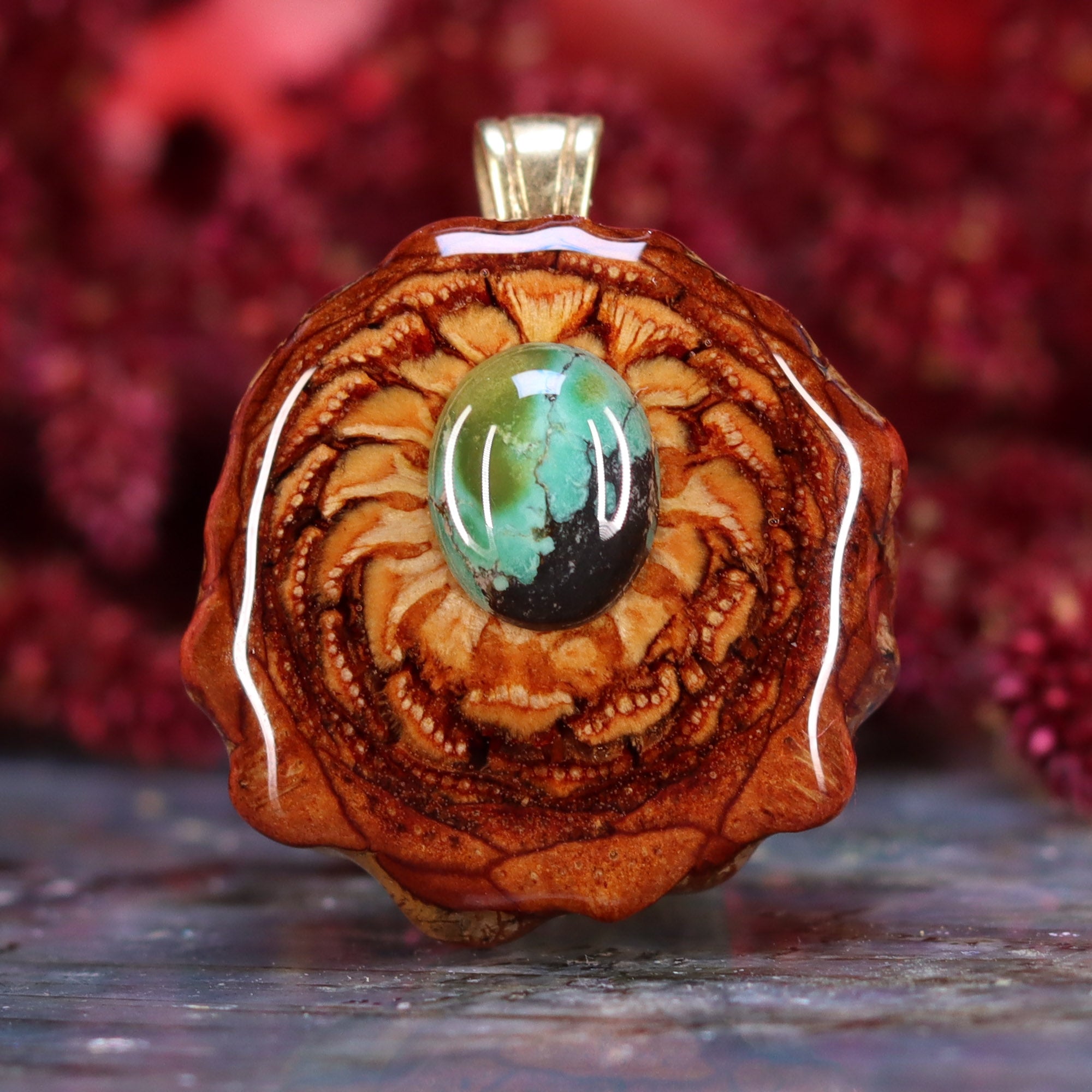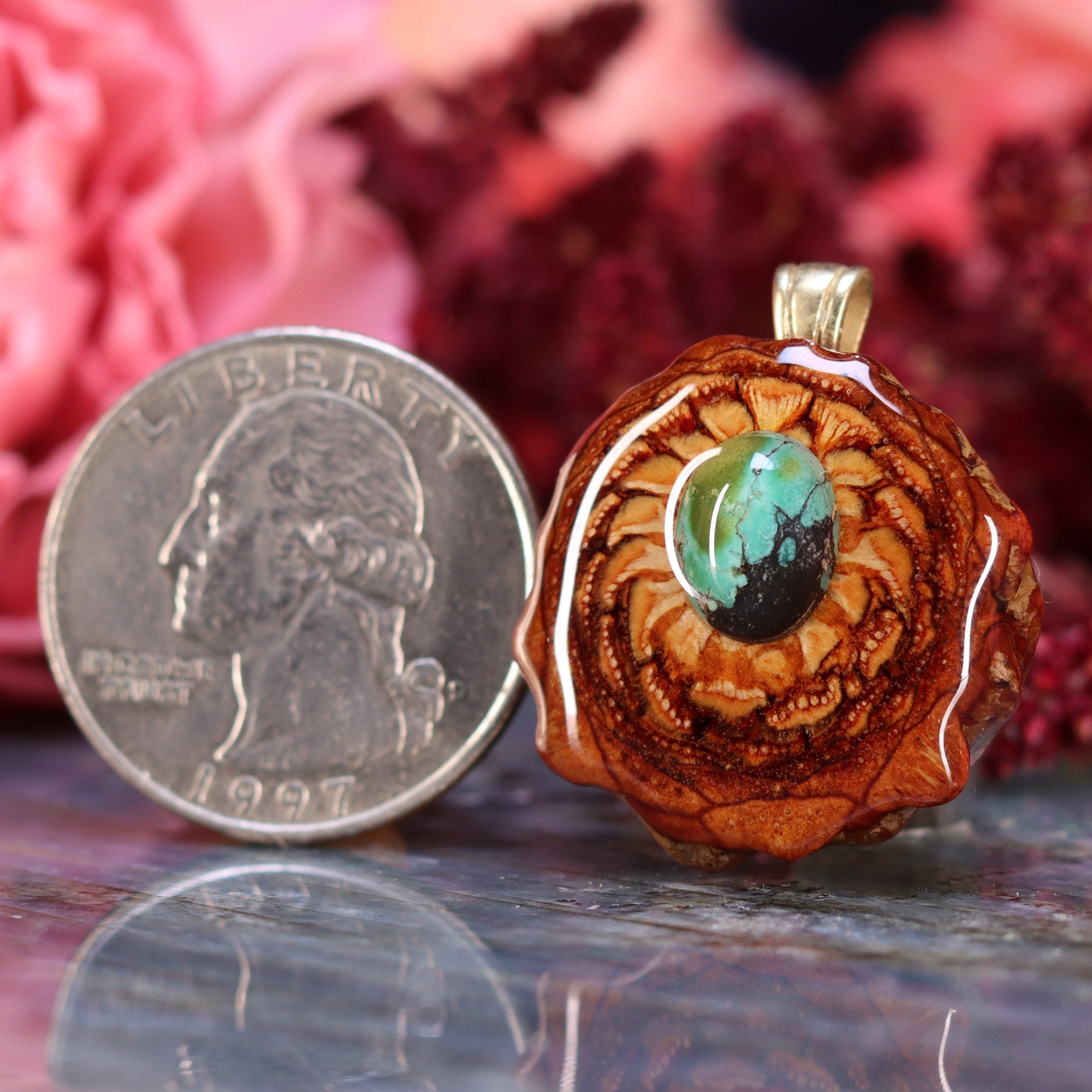Every pinecone pendant is an elegant gift from Mother Nature -- unveiling the ornate Sacred Geometry hidden at the center of one of the world's densest Pinecones. Because only one cross-section is taken from the "heart" of each Cone, every pendant is absolutely unique, and truly one-of-a-kind.