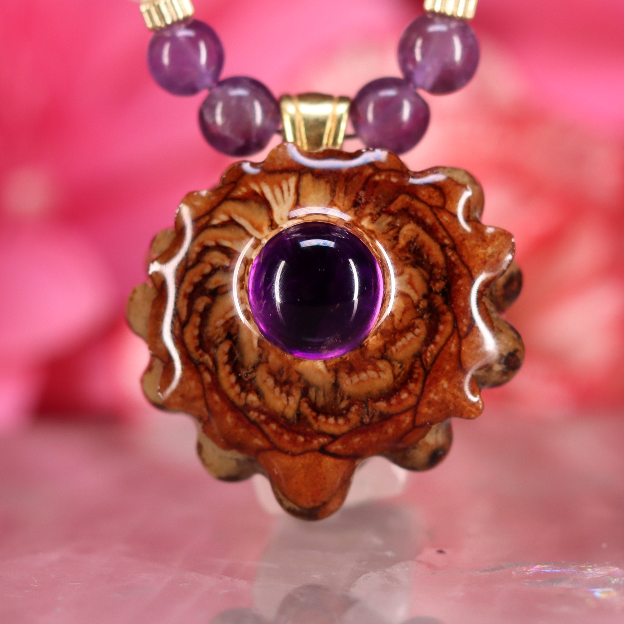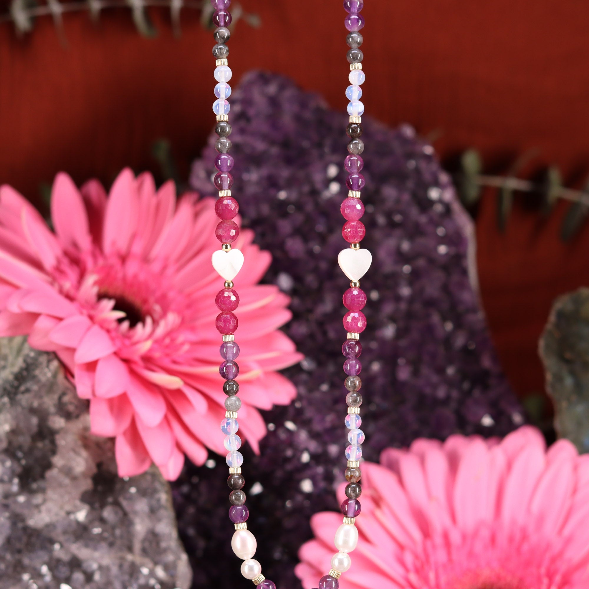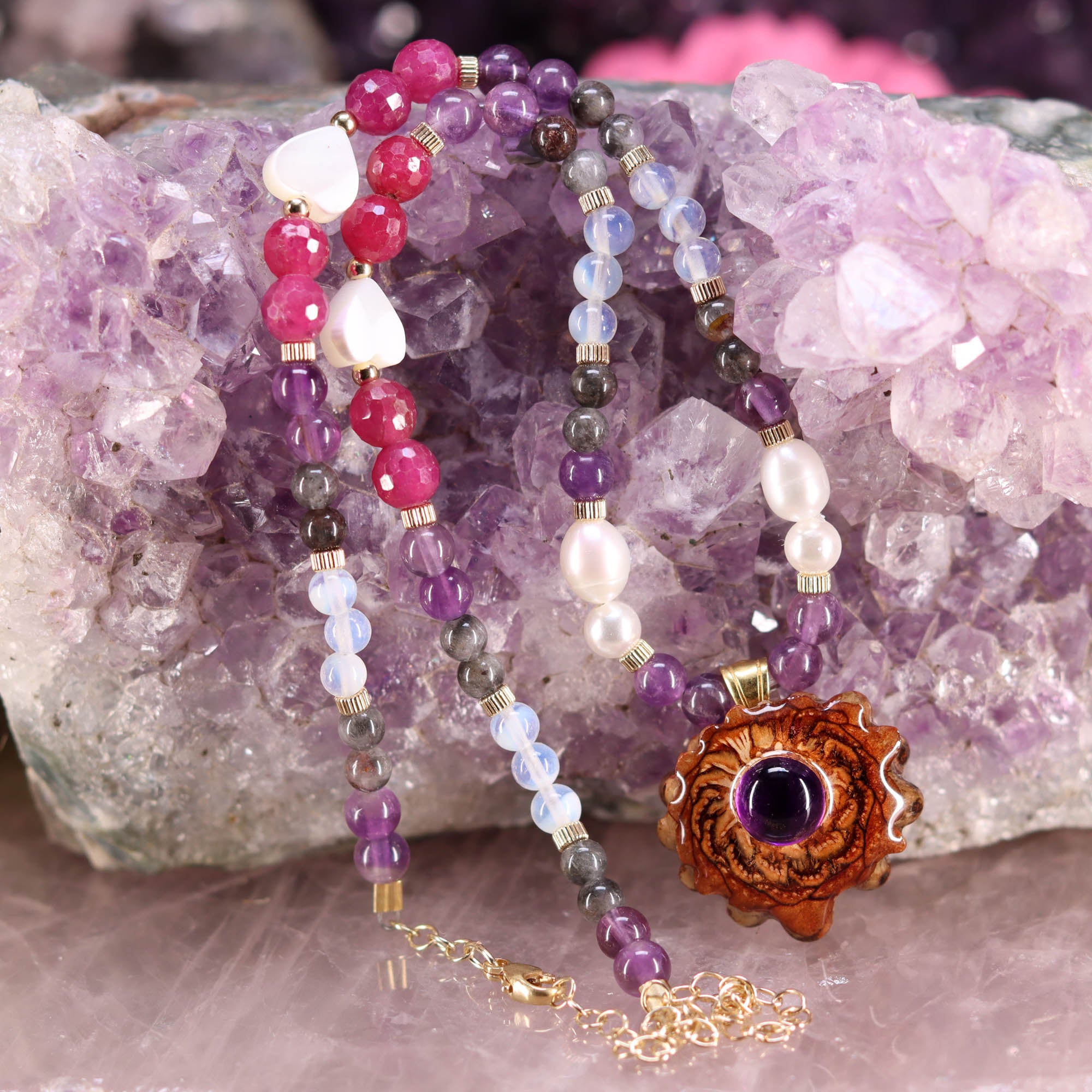 This necklace measures 12.75 inches (32.5 cm) and features a Amethyst pendant lovingly strung with a 4-inch length-adjustable 14k Gold Fill chain with Amethyst, Pearl, Ruby Jade, Iolite, Opalite, and Mother of Pearl beads to activate and energize body, mind and spirit!