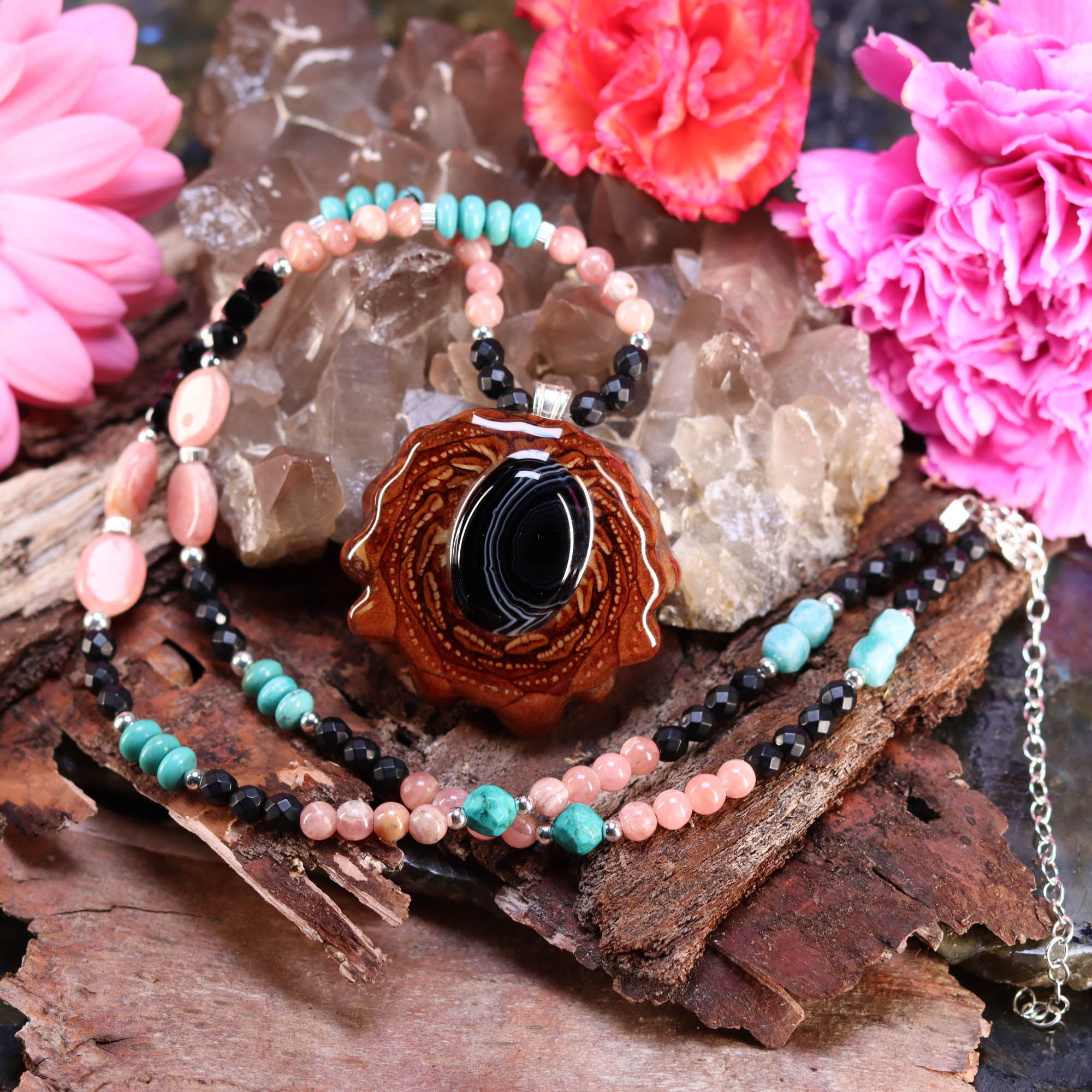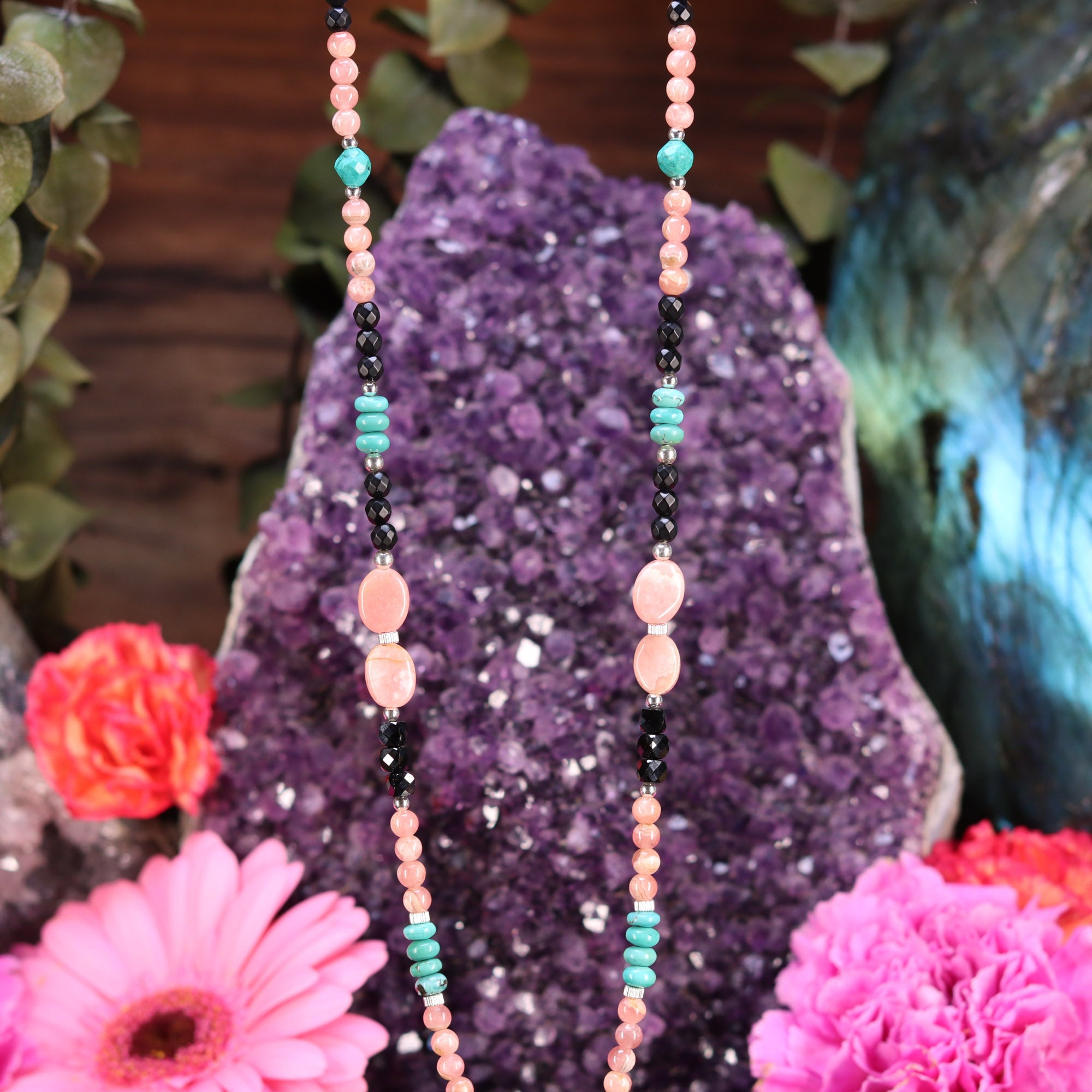 This necklace measures 18 inches (46 cm) and features a Tuxedo Agate pendant lovingly strung with a 3-inch length-adjustable Sterling Silver chain with Matte Onyx, Rhodochrosite, Turquoise, and Amazonite beads to activate and energize body, mind and spirit!