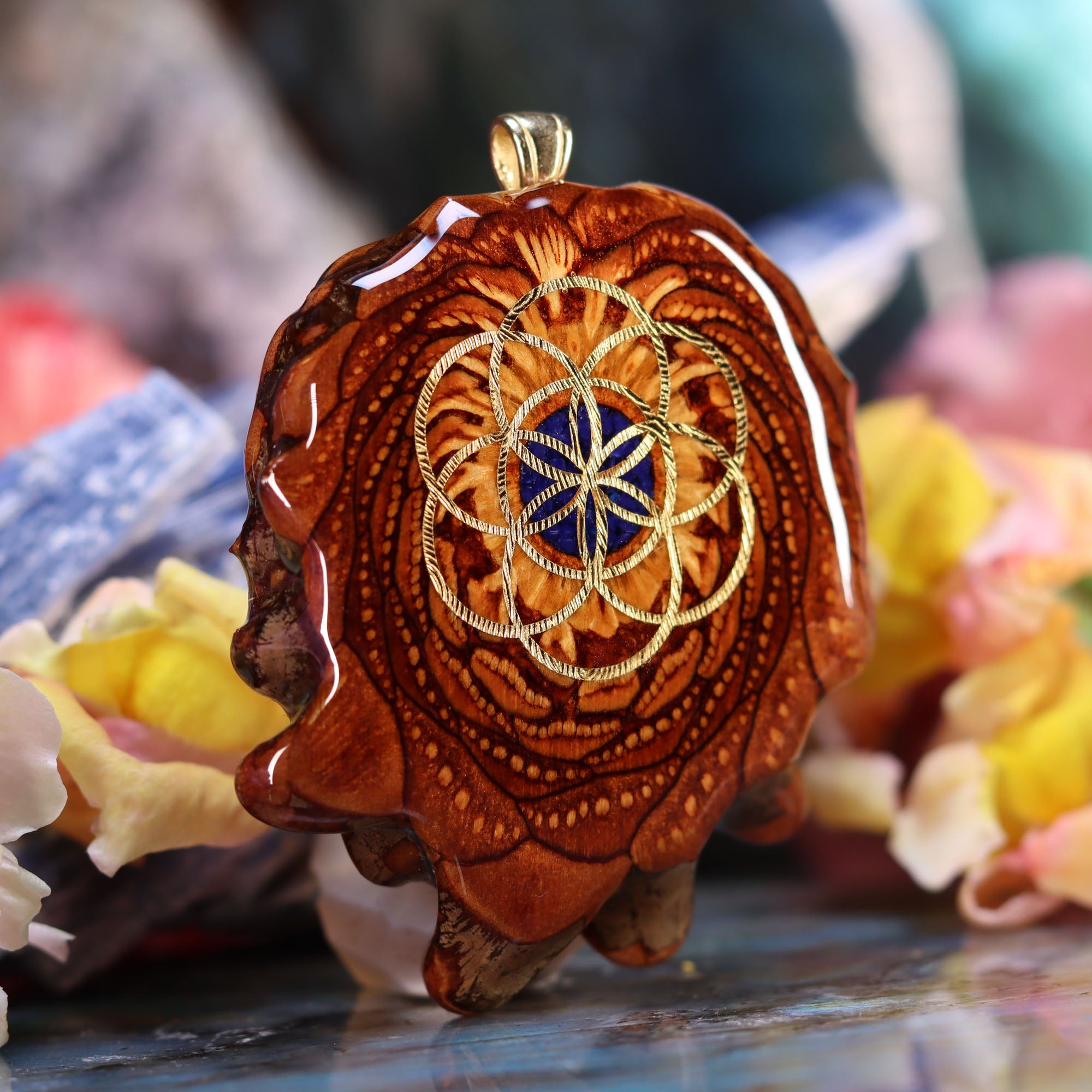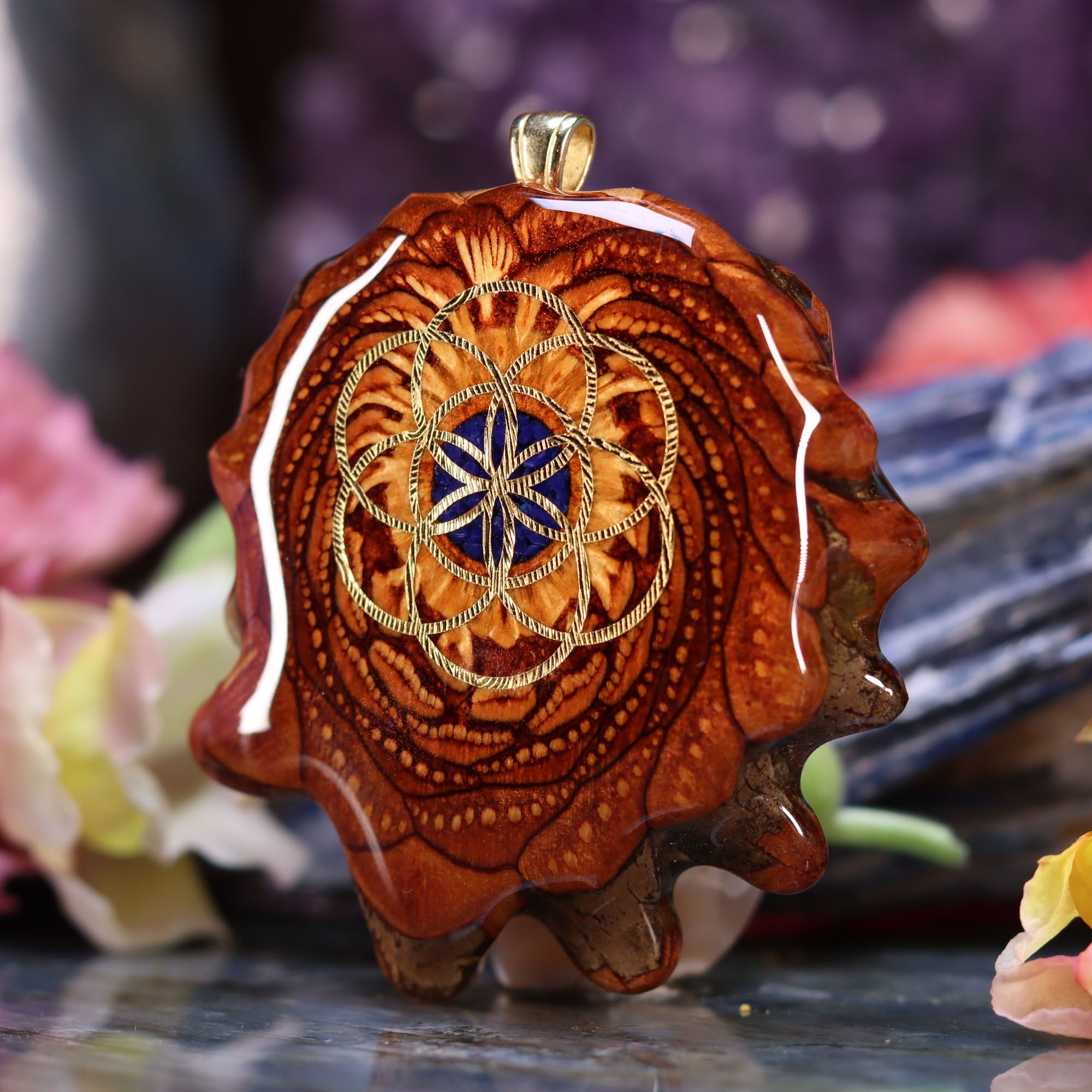 Every pinecone pendant is an elegant gift from Mother Nature -- unveiling the ornate Sacred Geometry hidden at the center of one of the world's densest Pinecones. Because only one cross-section is taken from the "heart" of each Cone, every pendant is absolutely unique, and truly one-of-a-kind.