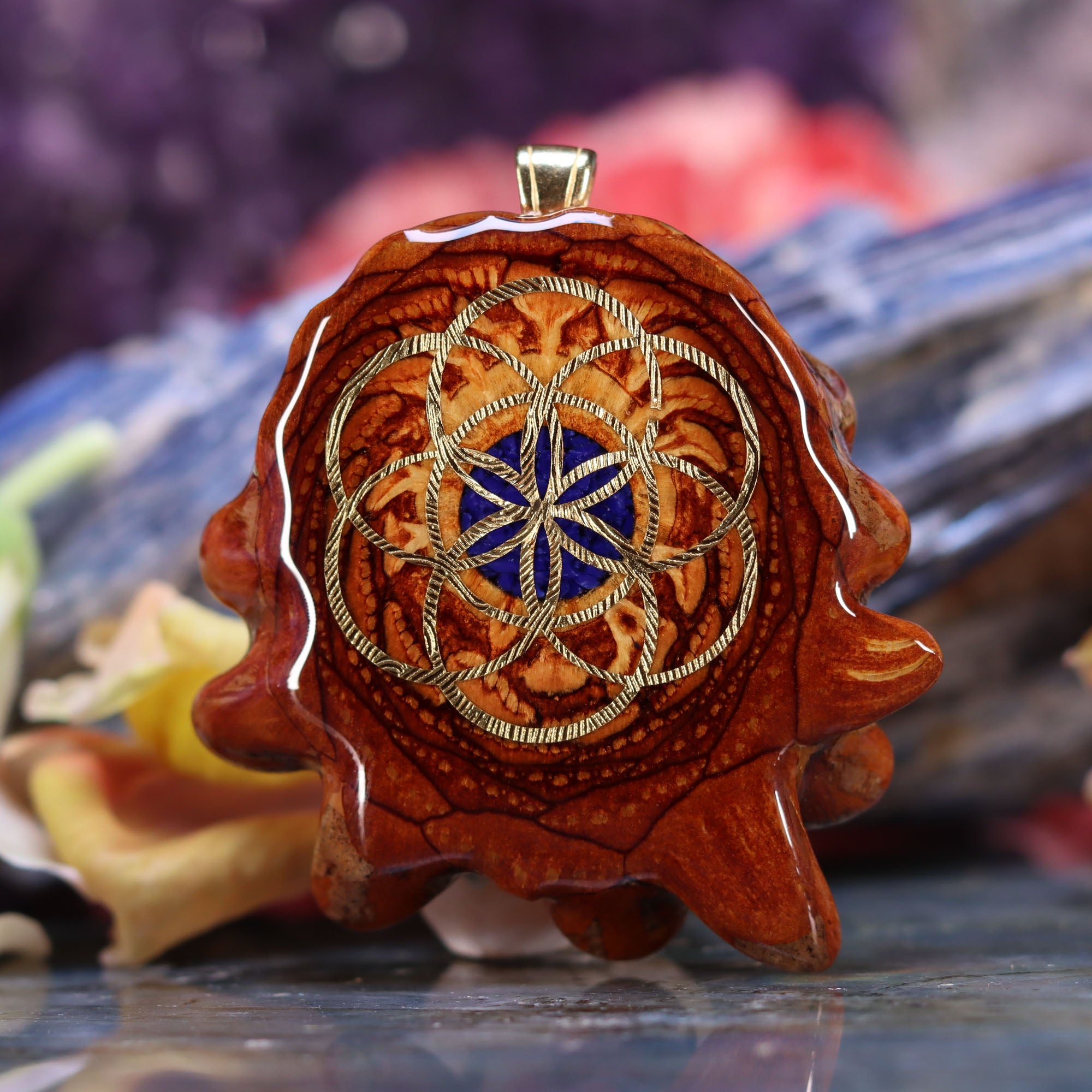 This Pinecone has been blessed with the Seed of Life, cast in 24k Gold. This sacred symbol serves as the foundation or "Seed" for the Flower of Life, and represents the Seven days of Creation. It depicts the origins of all matter, in geometric perfection, with six circles (the six days of work) resting inside a seventh circle (the day of rest, the sabbath).