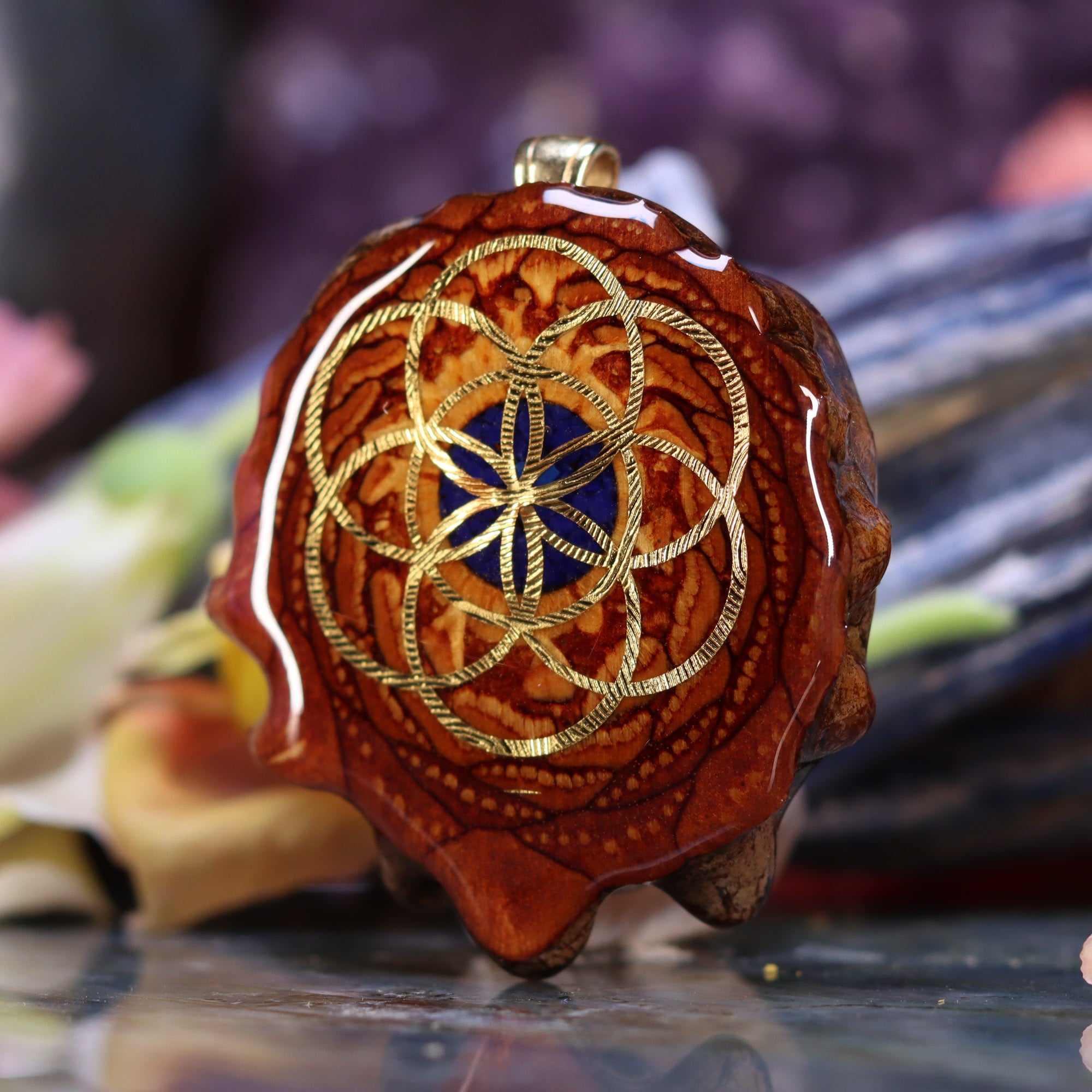 This Pinecone has been blessed with the Seed of Life, cast in 24k Gold. This sacred symbol serves as the foundation or "Seed" for the Flower of Life, and represents the Seven days of Creation. It depicts the origins of all matter, in geometric perfection, with six circles (the six days of work) resting inside a seventh circle (the day of rest, the sabbath).