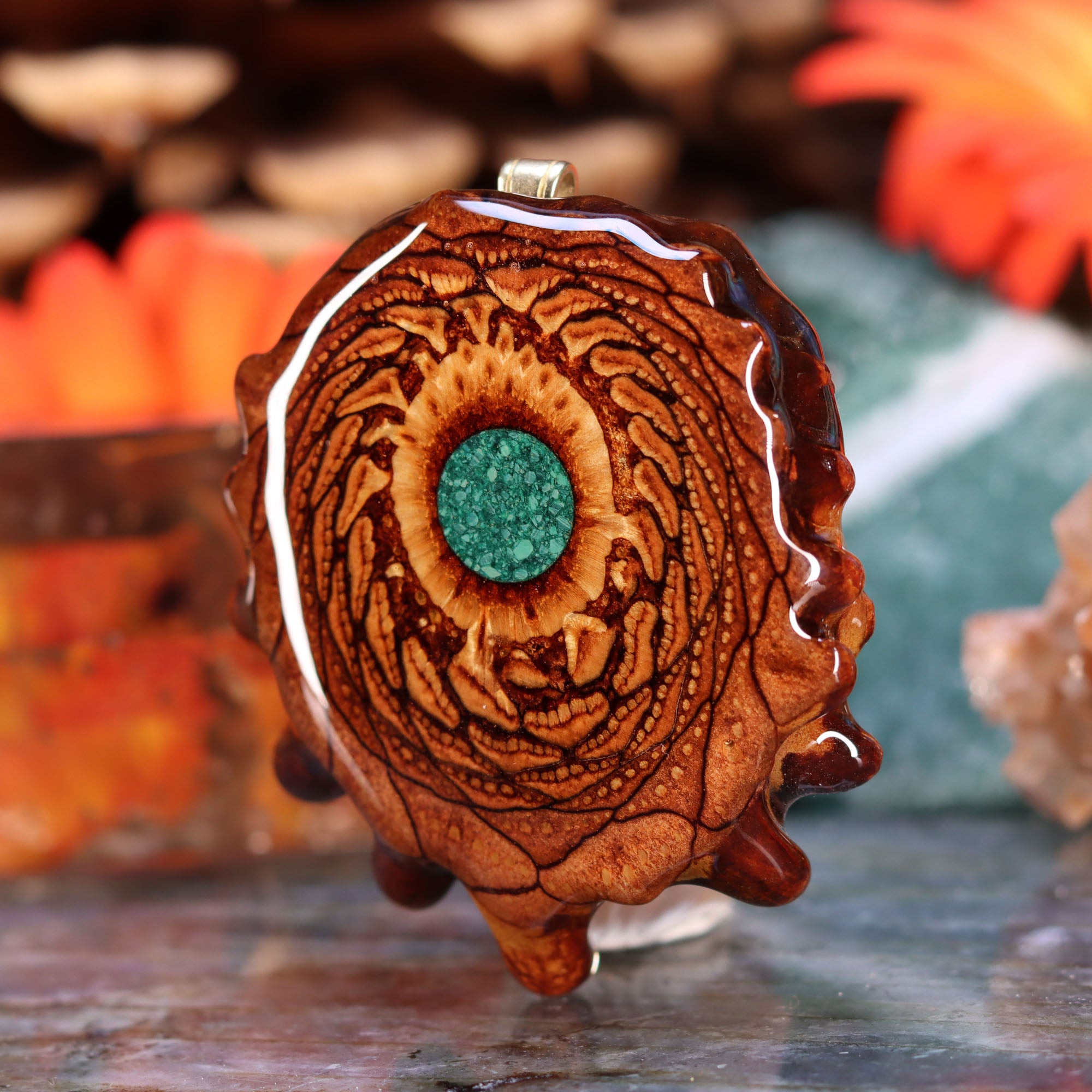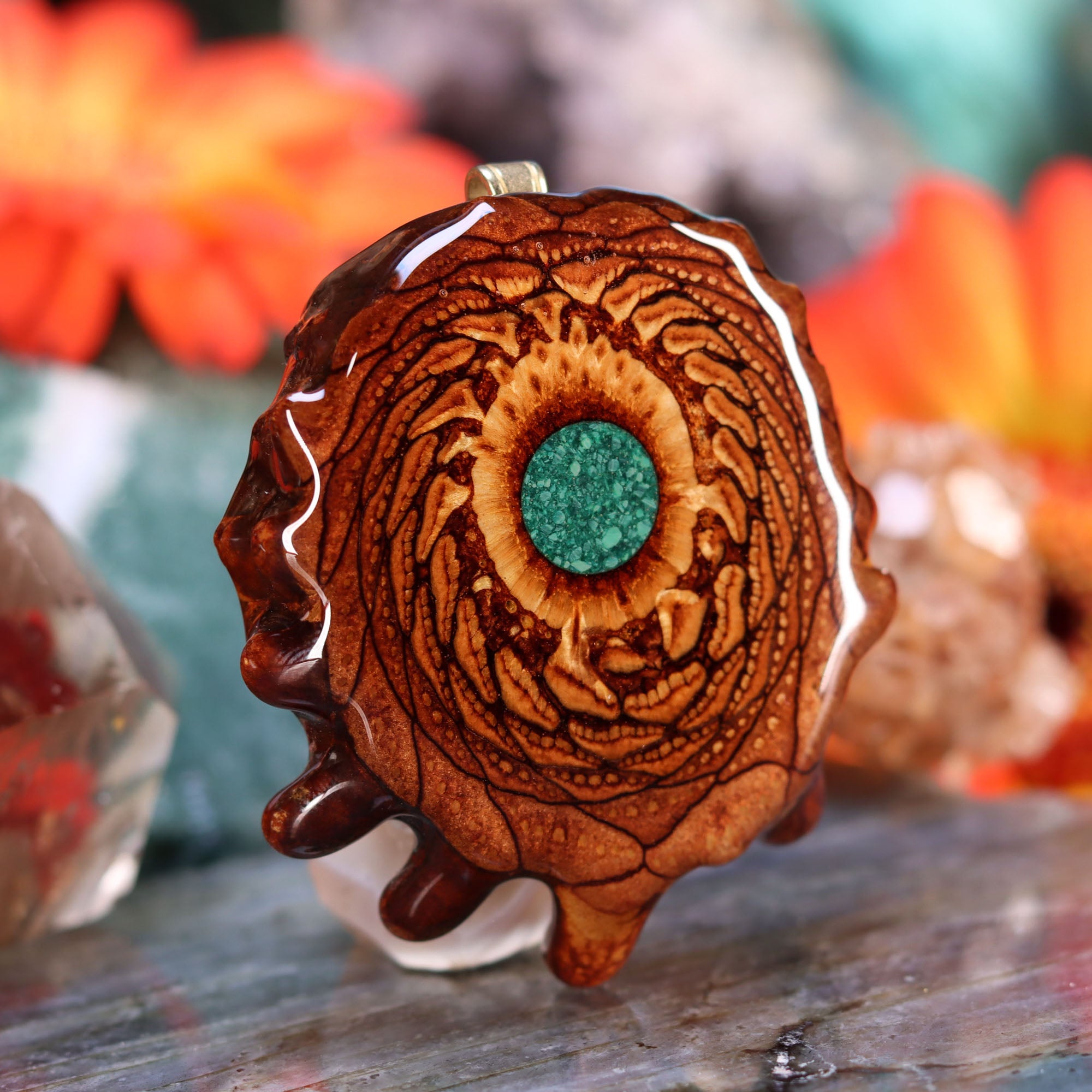 Every pinecone pendant is an elegant gift from Mother Nature -- unveiling the ornate Sacred Geometry hidden at the center of one of the world's densest Pinecones. Because only one cross-section is taken from the "heart" of each Cone, every pendant is absolutely unique, and truly one-of-a-kind.