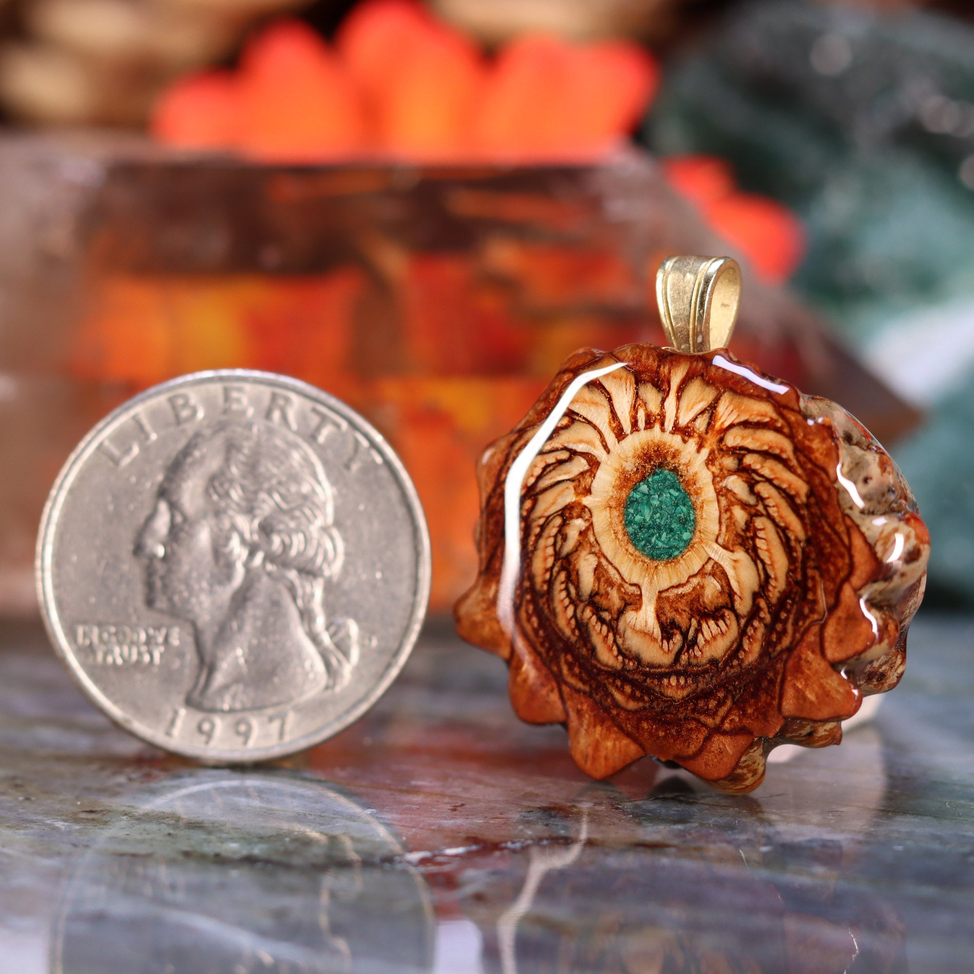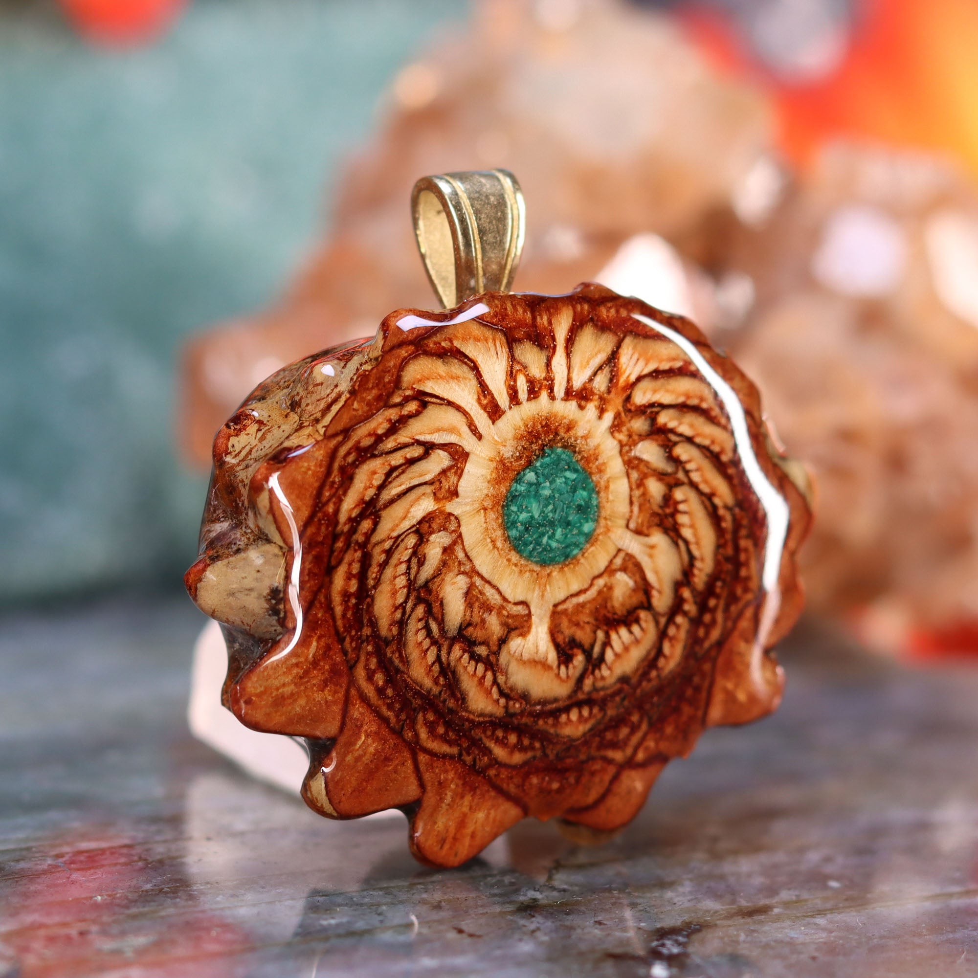 Every pinecone pendant is an elegant gift from Mother Nature -- unveiling the ornate Sacred Geometry hidden at the center of one of the world's densest Pinecones. Because only one cross-section is taken from the "heart" of each Cone, every pendant is absolutely unique, and truly one-of-a-kind.