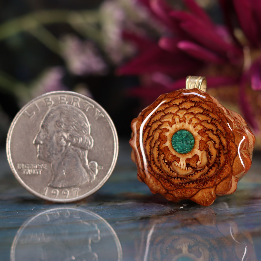 Every pinecone pendant is an elegant gift from Mother Nature -- unveiling the ornate Sacred Geometry hidden at the center of one of the world's densest Pinecones. Because only one cross-section is taken from the "heart" of each Cone, every pendant is absolutely unique, and truly one-of-a-kind.