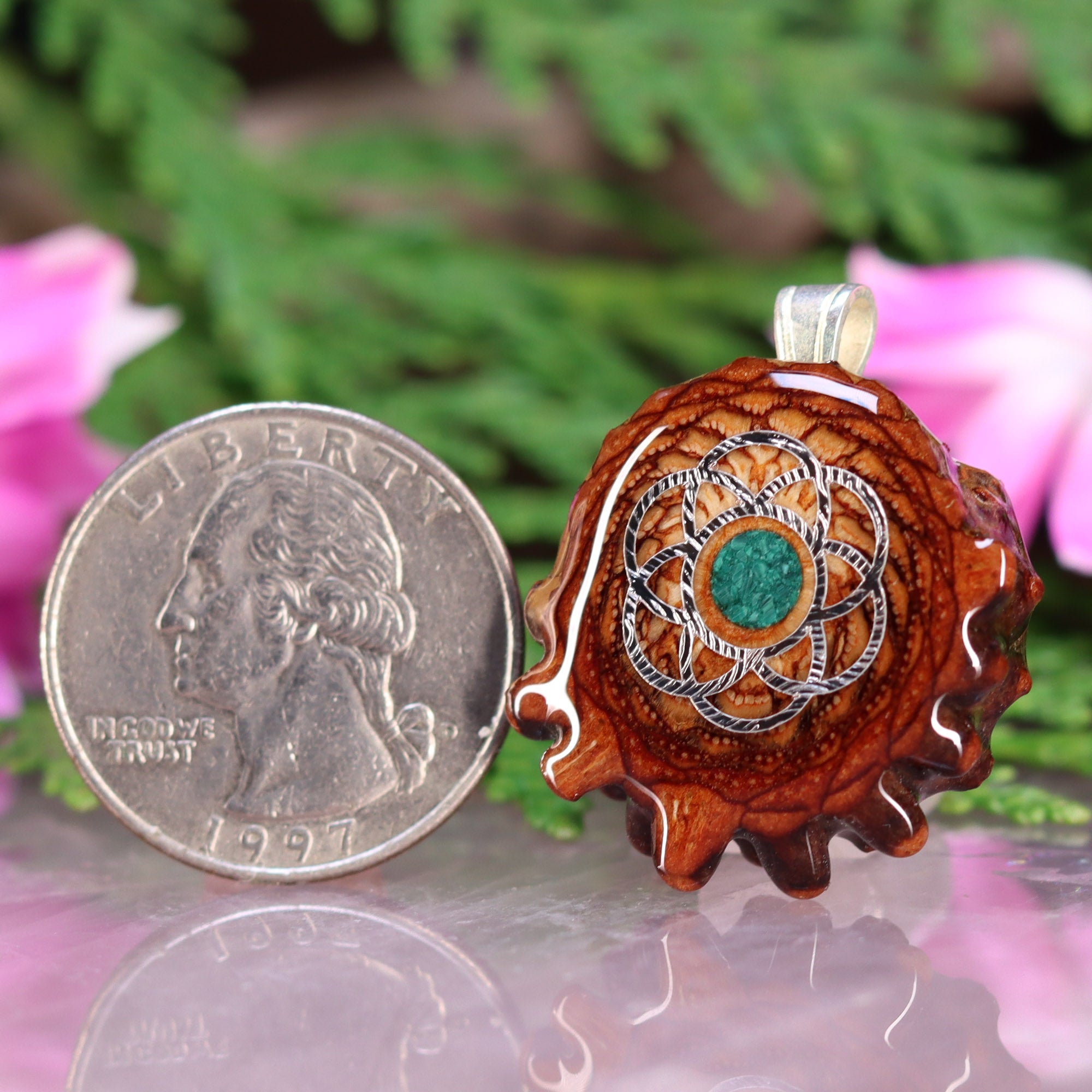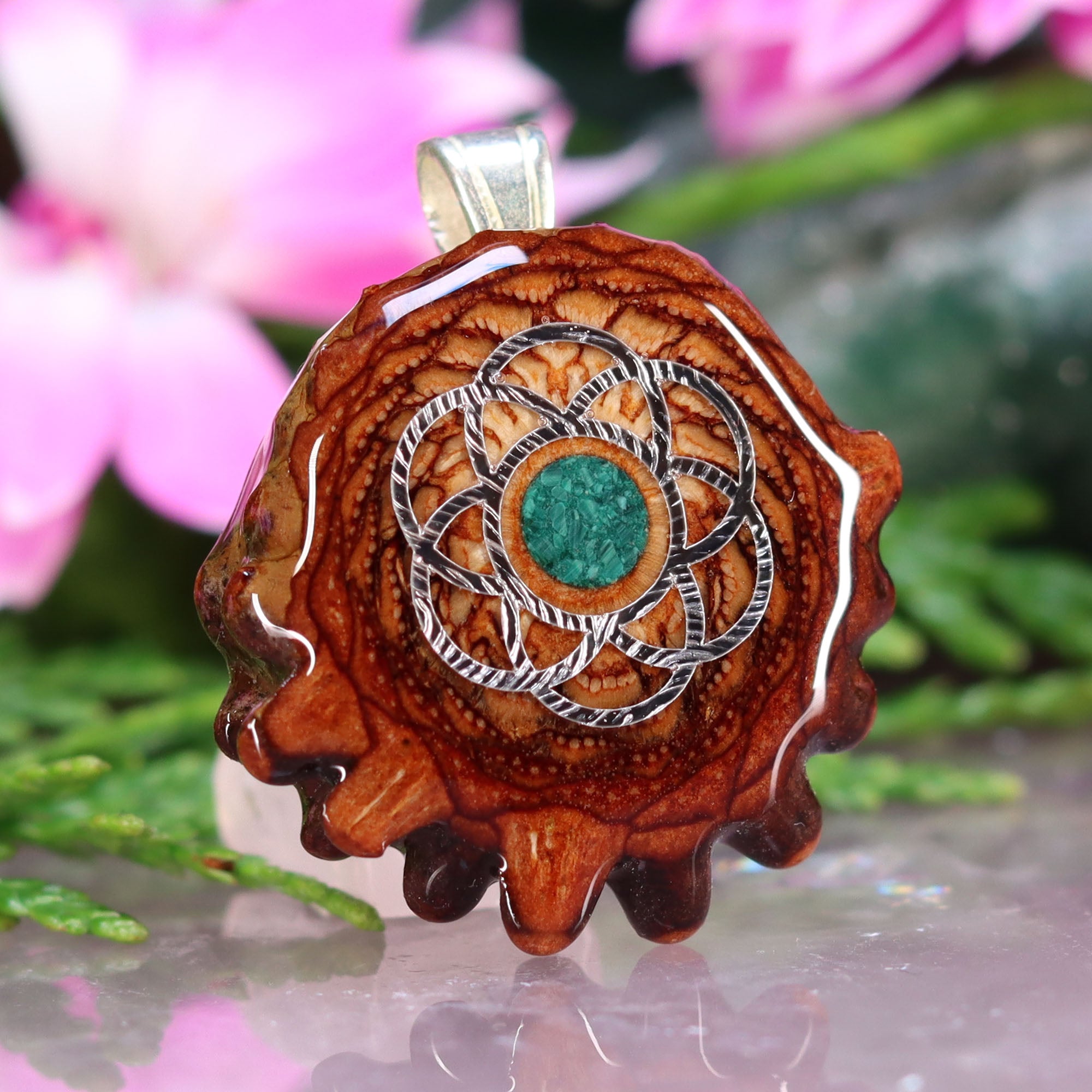 Every pinecone pendant is an elegant gift from Mother Nature -- unveiling the ornate Sacred Geometry hidden at the center of one of the world's densest Pinecones. Because only one cross-section is taken from the "heart" of each Cone, every pendant is absolutely unique, and truly one-of-a-kind.