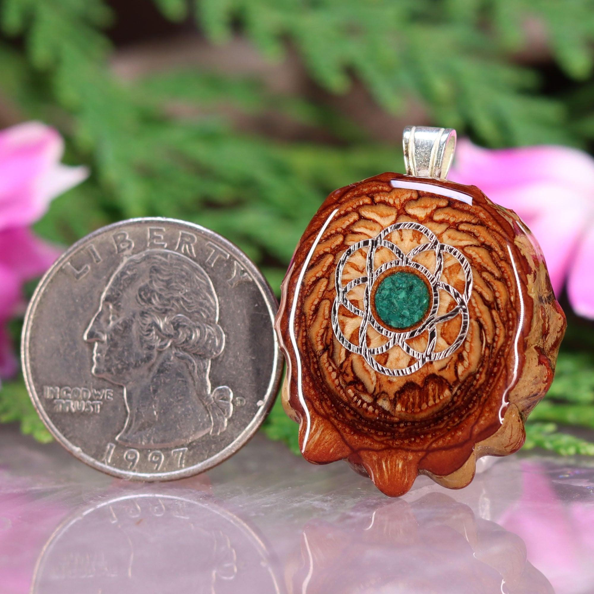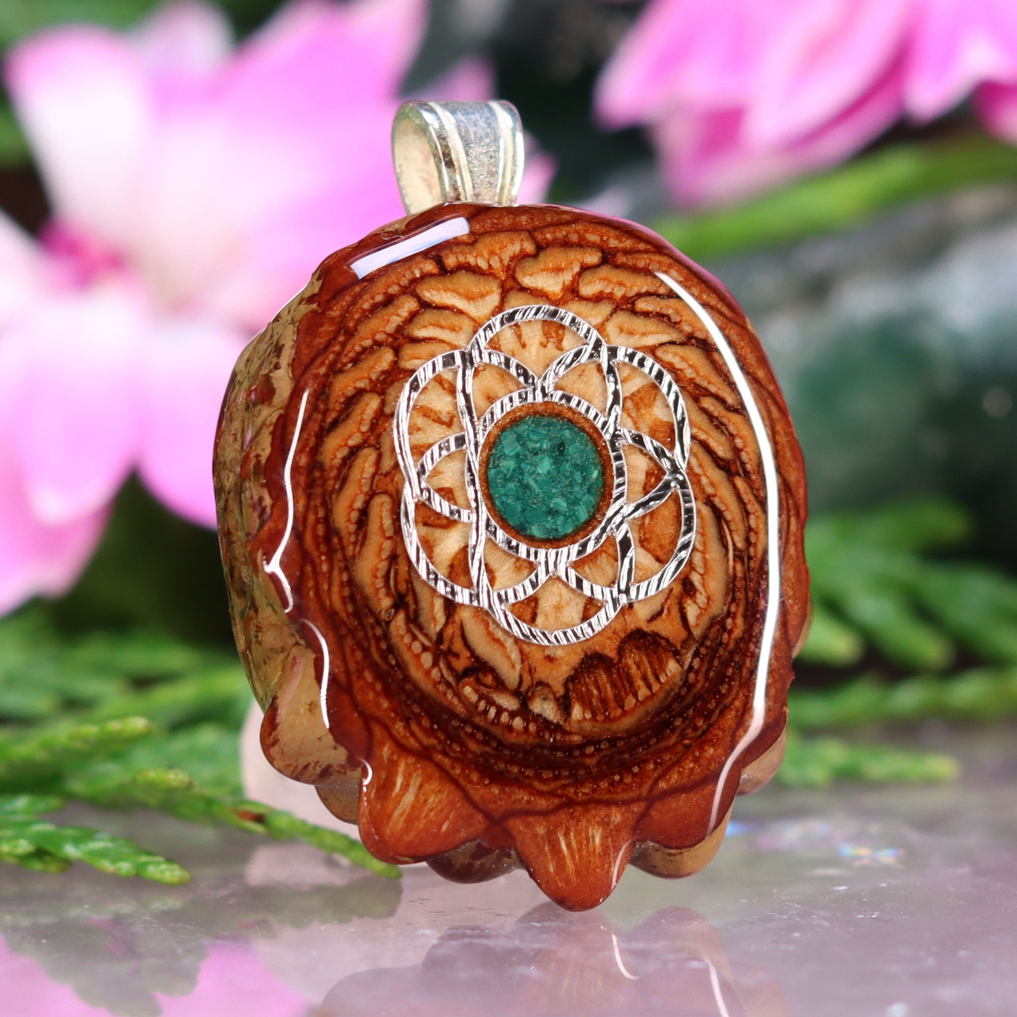 Every pinecone pendant is an elegant gift from Mother Nature -- unveiling the ornate Sacred Geometry hidden at the center of one of the world's densest Pinecones. Because only one cross-section is taken from the "heart" of each Cone, every pendant is absolutely unique, and truly one-of-a-kind.