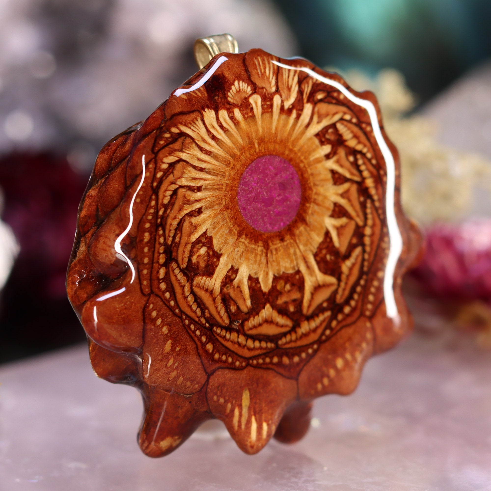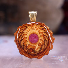 Every pinecone pendant is an elegant gift from Mother Nature -- unveiling the ornate Sacred Geometry hidden at the center of one of the world's densest Pinecones. Because only one cross-section is taken from the "heart" of each Cone, every pendant is absolutely unique, and truly one-of-a-kind.