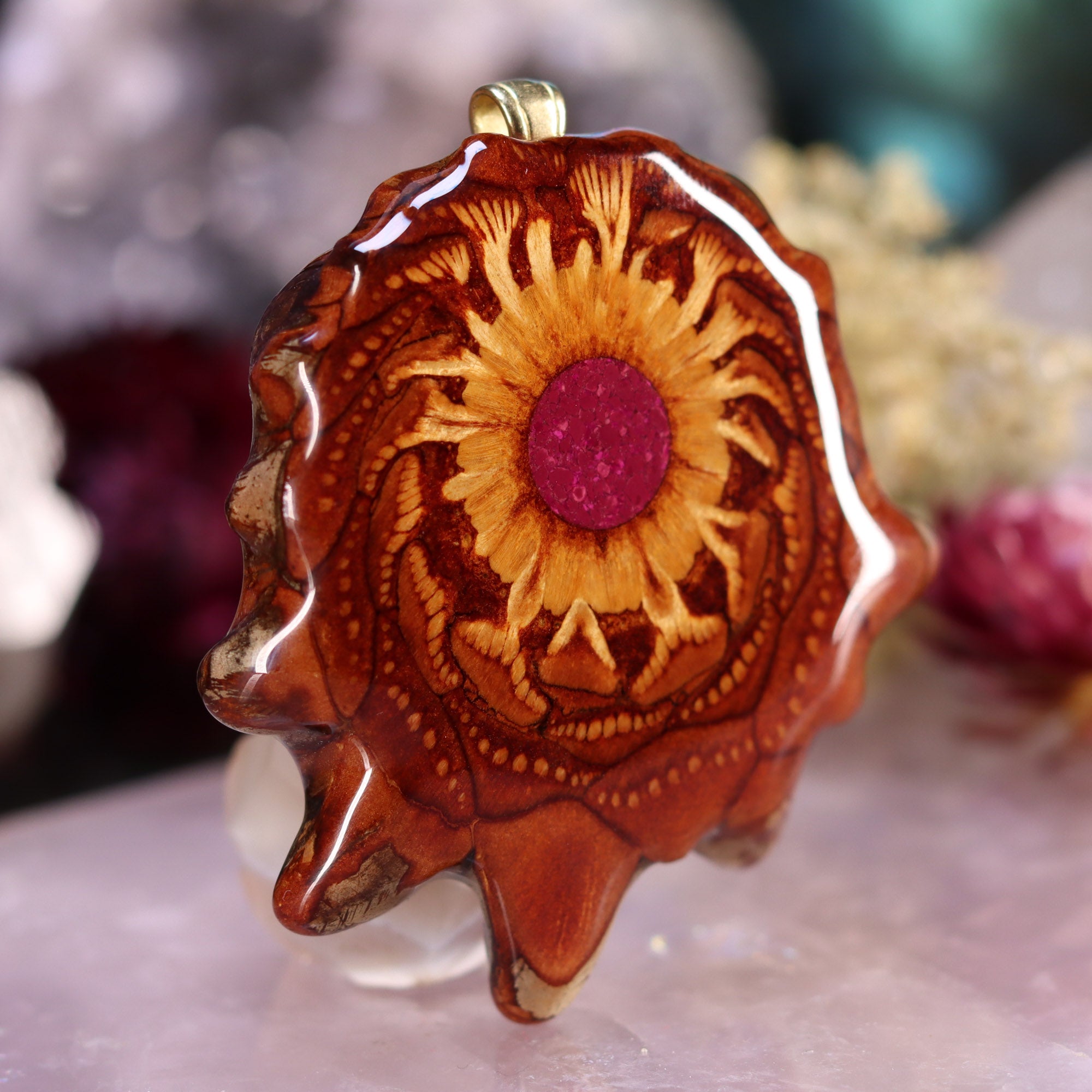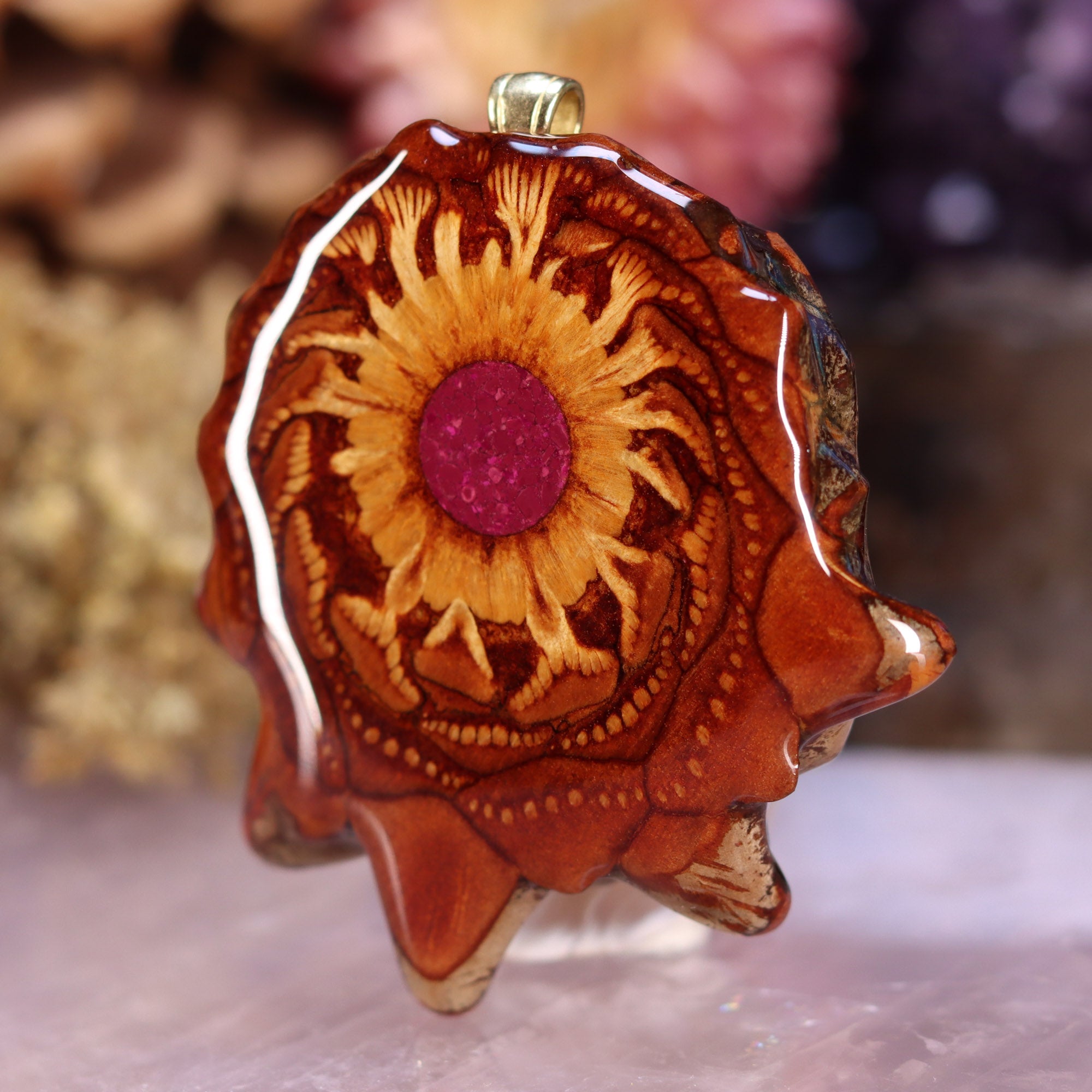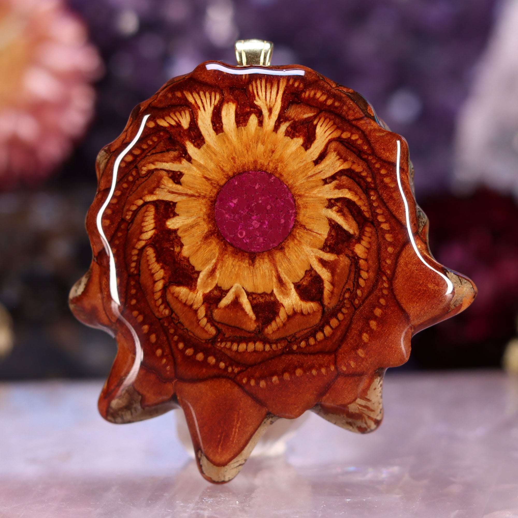 Every pinecone pendant is an elegant gift from Mother Nature -- unveiling the ornate Sacred Geometry hidden at the center of one of the world's densest Pinecones. Because only one cross-section is taken from the "heart" of each Cone, every pendant is absolutely unique, and truly one-of-a-kind.