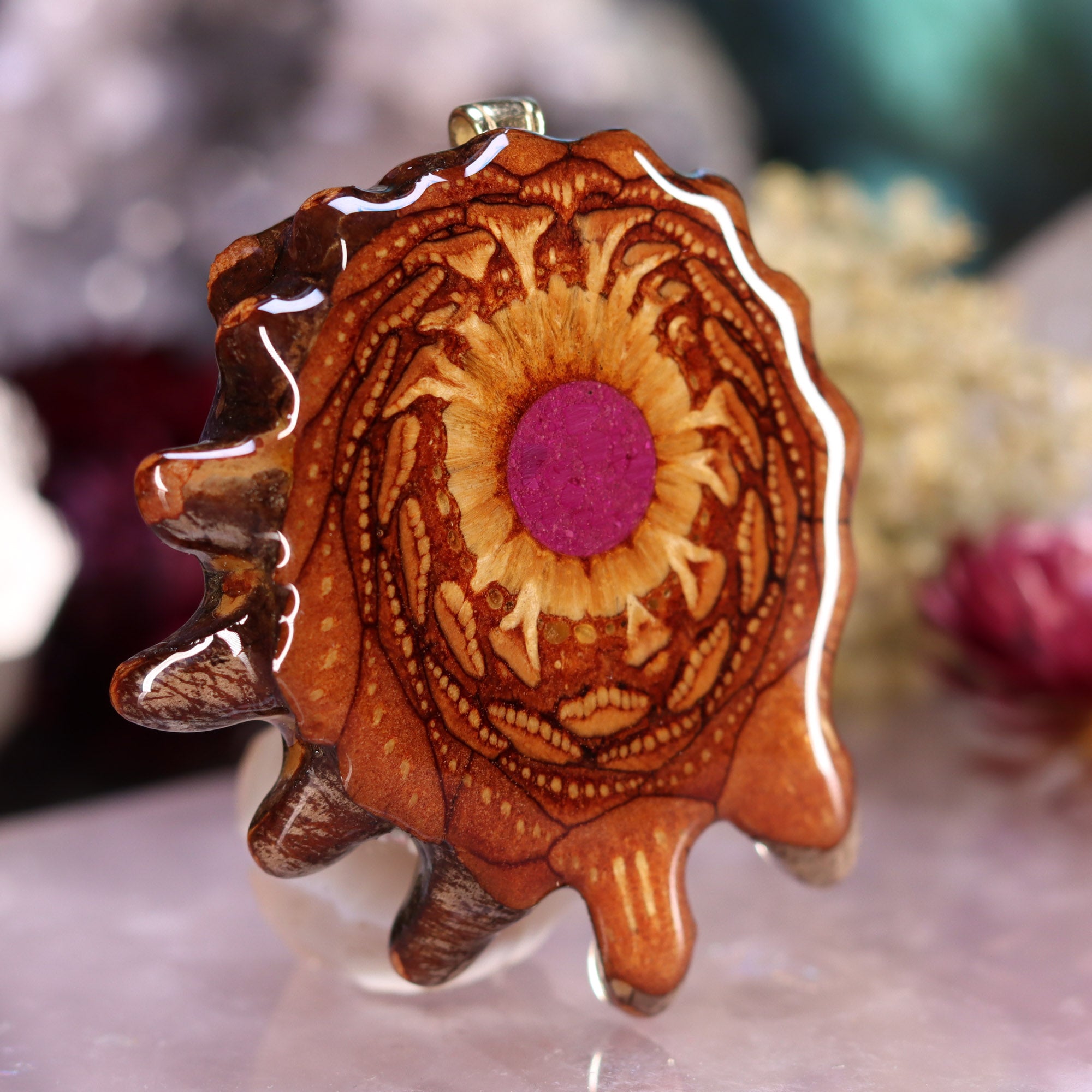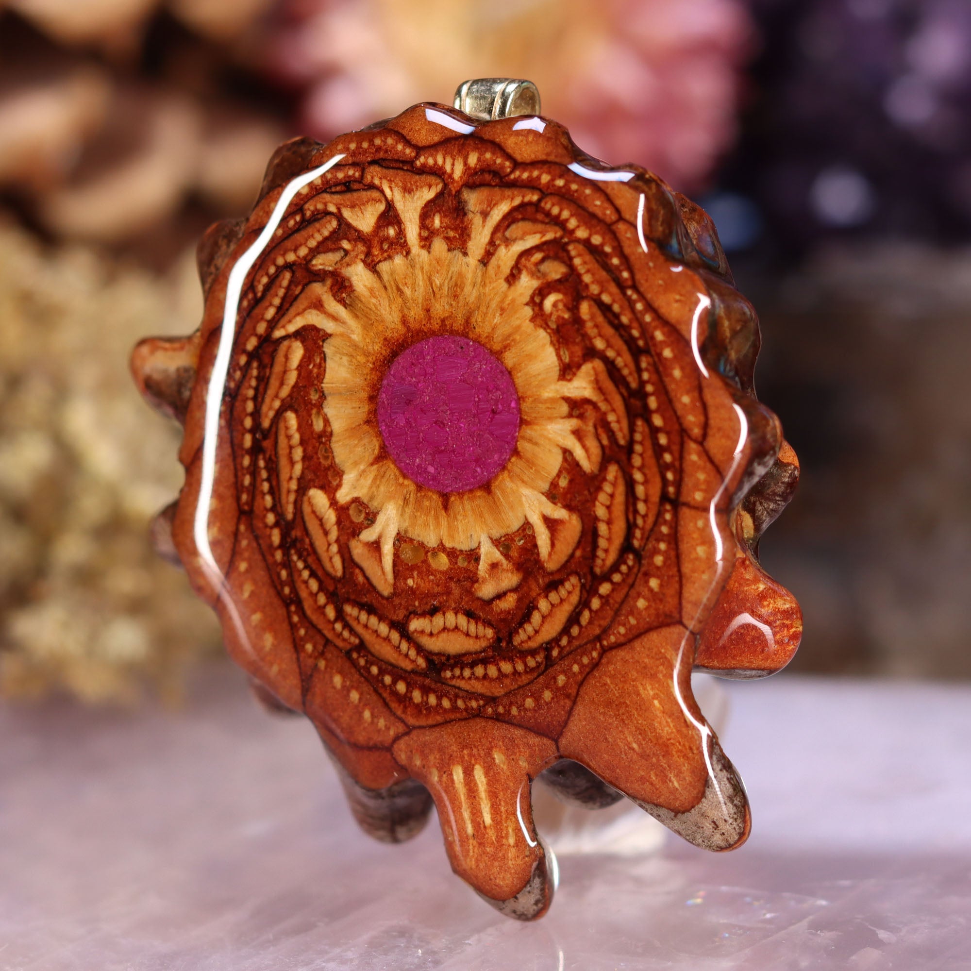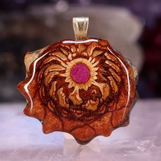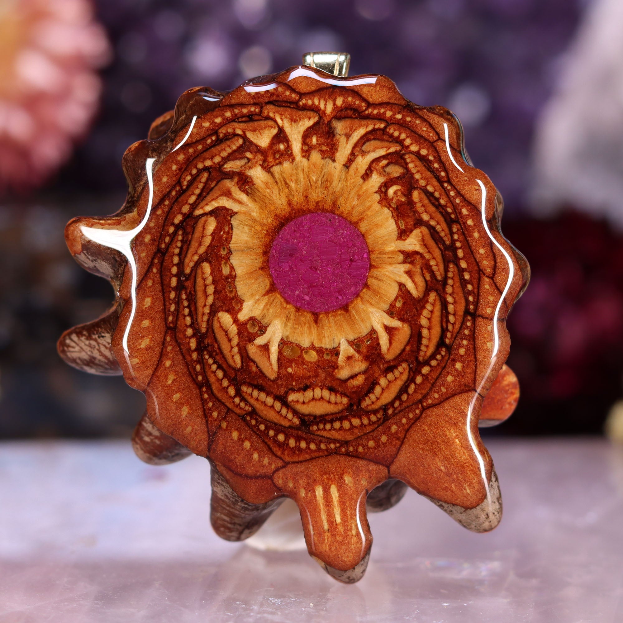 Every pinecone pendant is an elegant gift from Mother Nature -- unveiling the ornate Sacred Geometry hidden at the center of one of the world's densest Pinecones. Because only one cross-section is taken from the "heart" of each Cone, every pendant is absolutely unique, and truly one-of-a-kind.