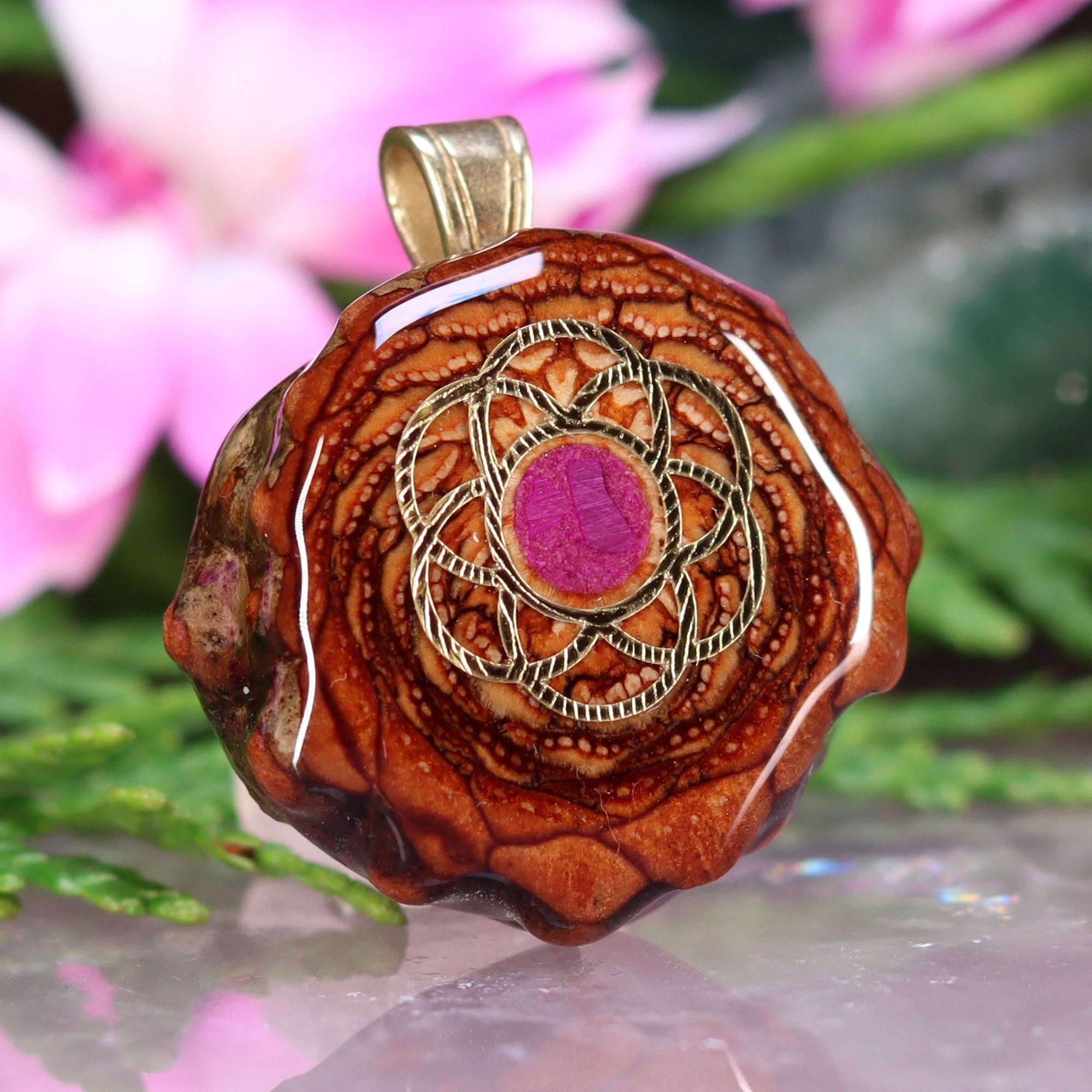 Every pinecone pendant is an elegant gift from Mother Nature -- unveiling the ornate Sacred Geometry hidden at the center of one of the world's densest Pinecones. Because only one cross-section is taken from the "heart" of each Cone, every pendant is absolutely unique, and truly one-of-a-kind.