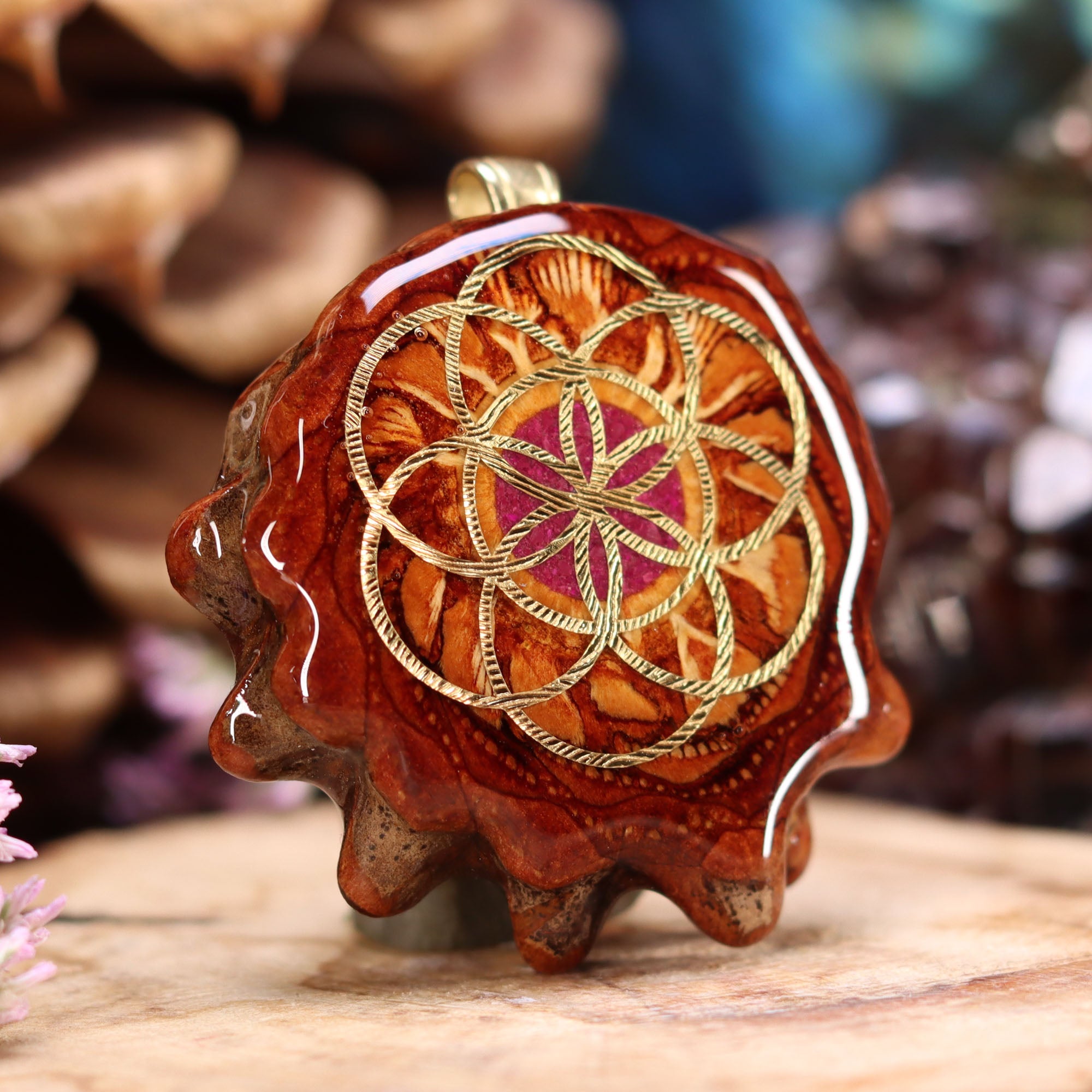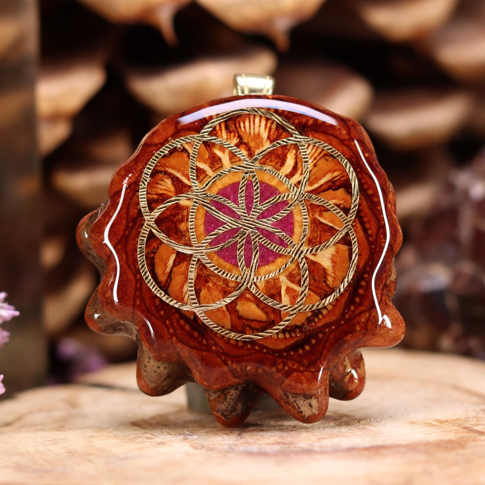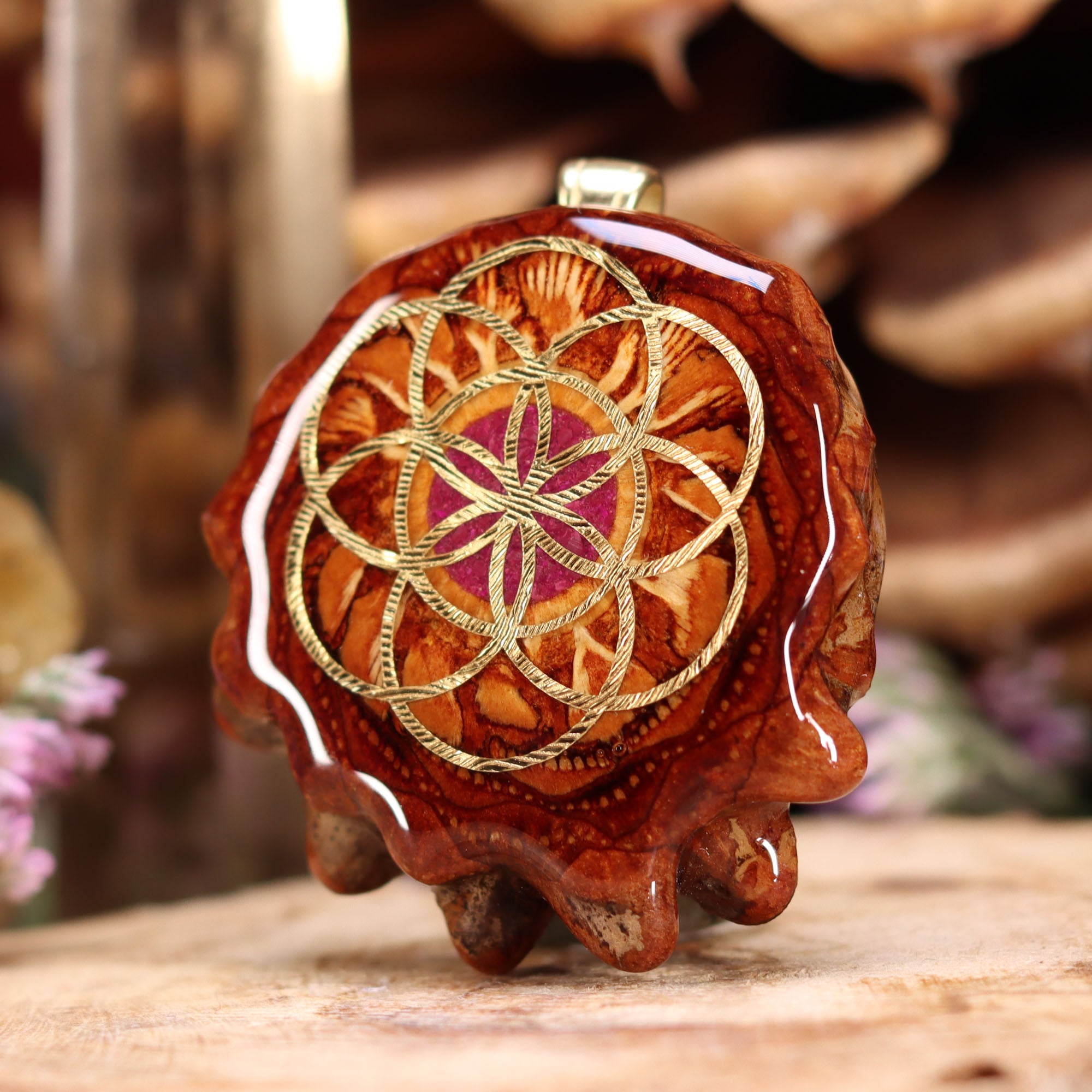 Every pinecone pendant is an elegant gift from Mother Nature -- unveiling the ornate Sacred Geometry hidden at the center of one of the world's densest Pinecones. Because only one cross-section is taken from the "heart" of each Cone, every pendant is absolutely unique, and truly one-of-a-kind.
