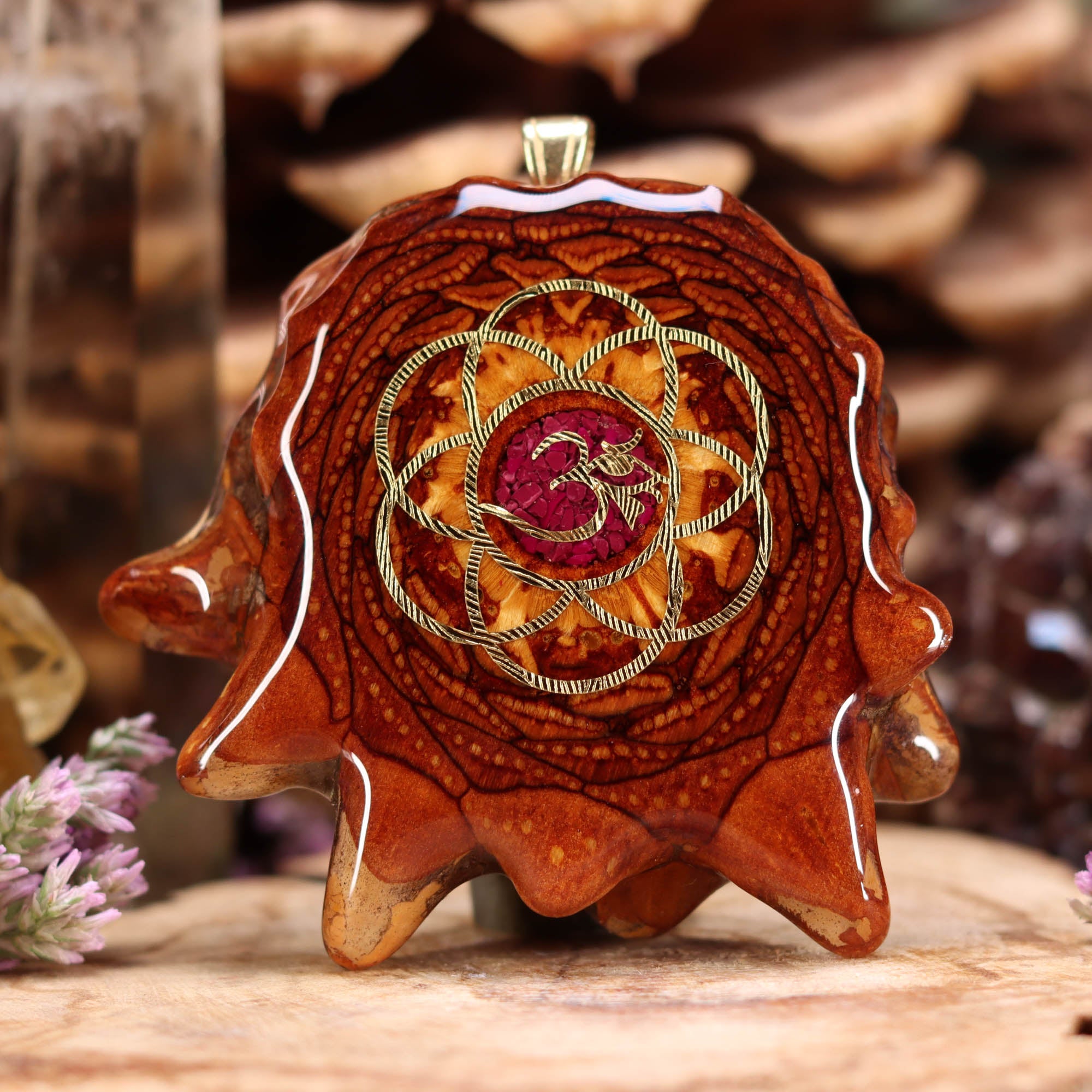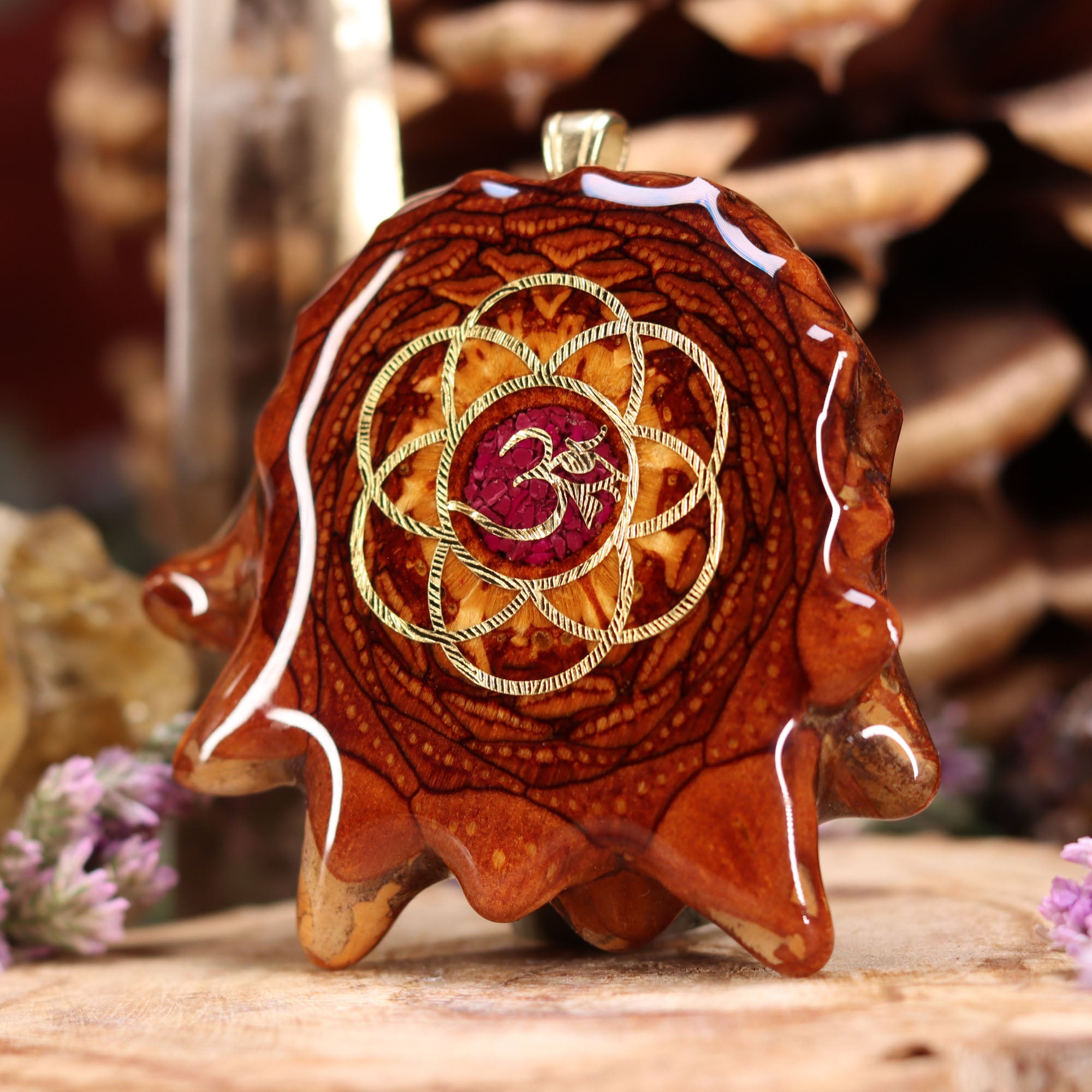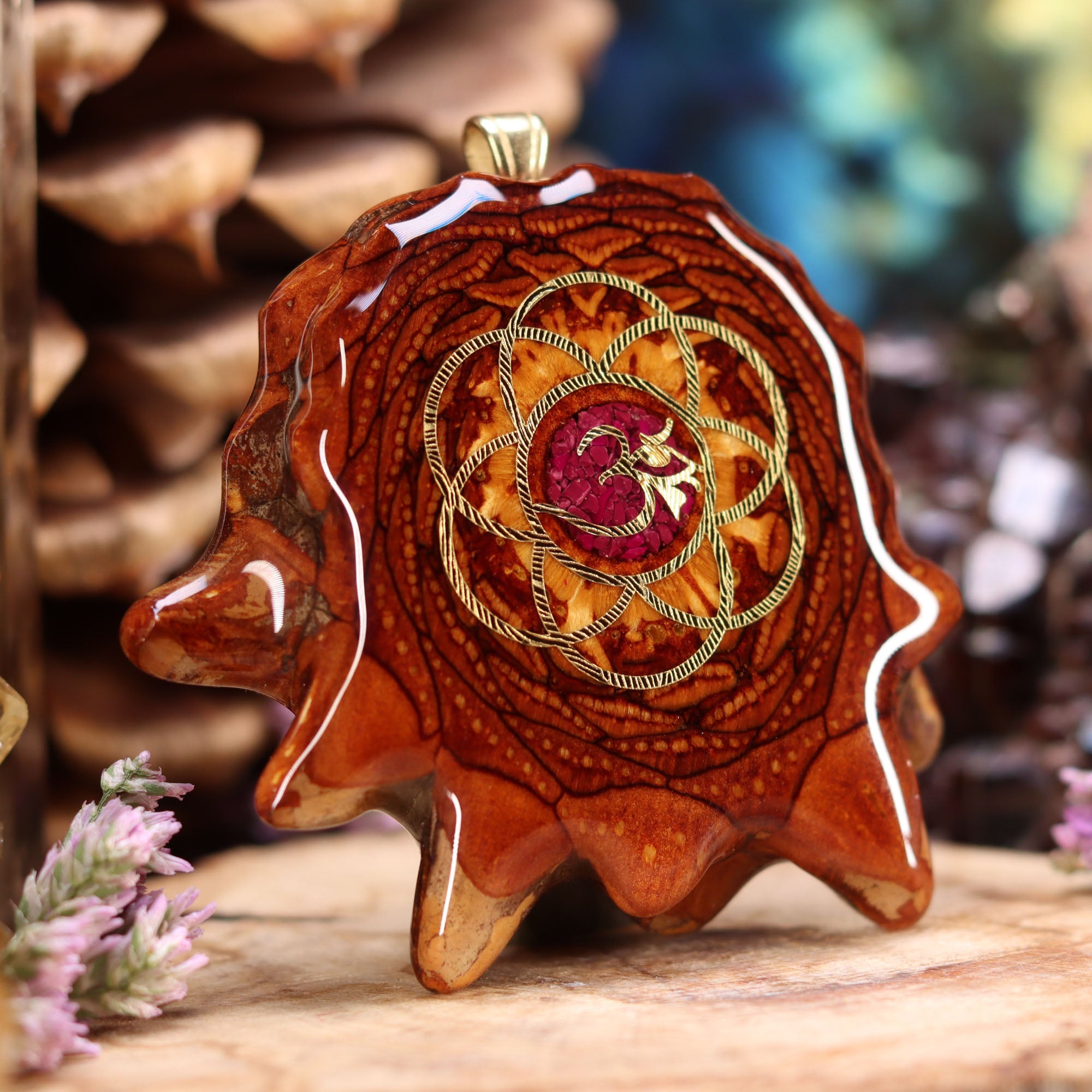 Every pinecone pendant is an elegant gift from Mother Nature -- unveiling the ornate Sacred Geometry hidden at the center of one of the world's densest Pinecones. Because only one cross-section is taken from the "heart" of each Cone, every pendant is absolutely unique, and truly one-of-a-kind.