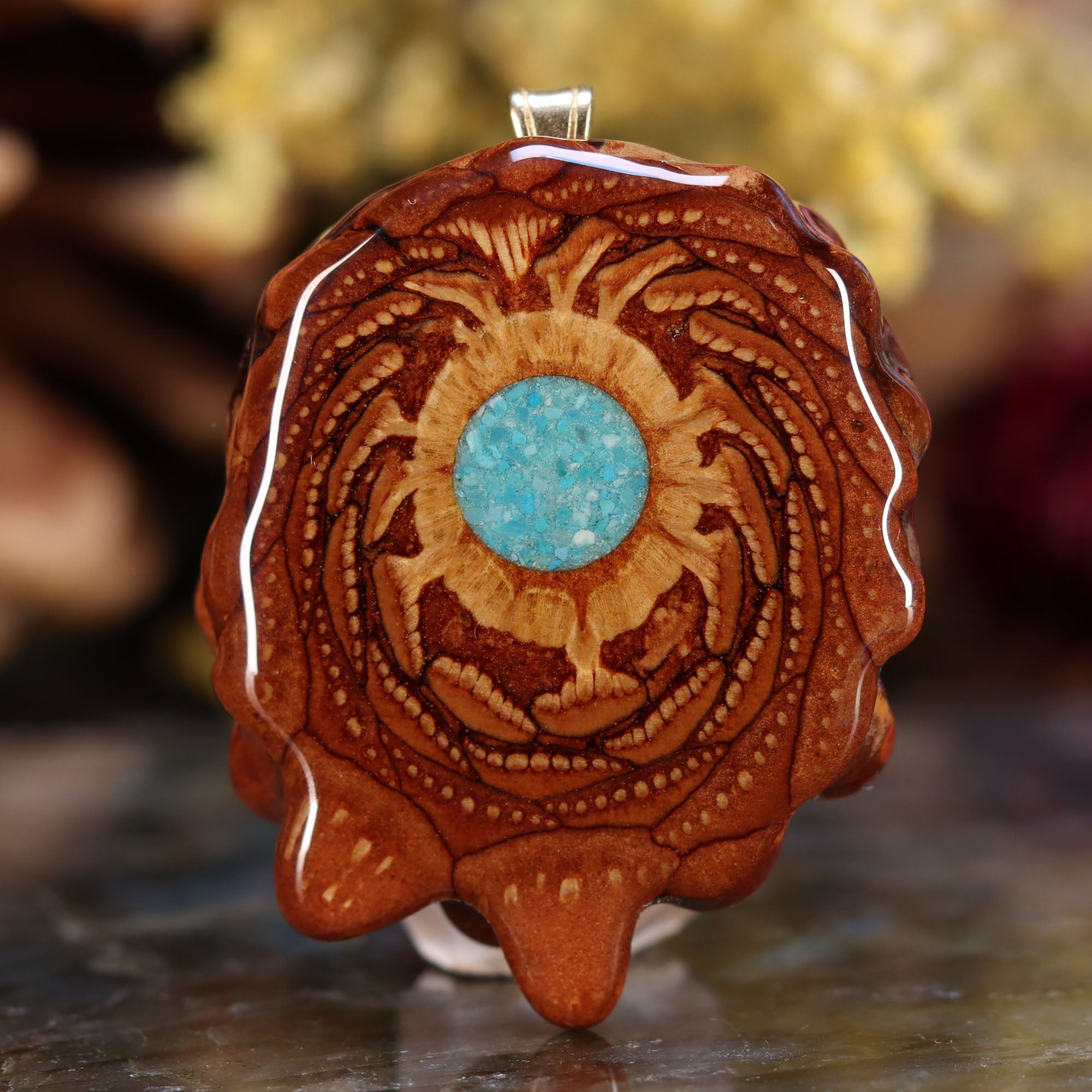 Crushed Turquoise has been carefully mixed with a Phosphorescent Powder, then inlaid into the center of this unique pendant -- causing it to gently "Glow" in the dark, in addition to its vibrant color during the day!