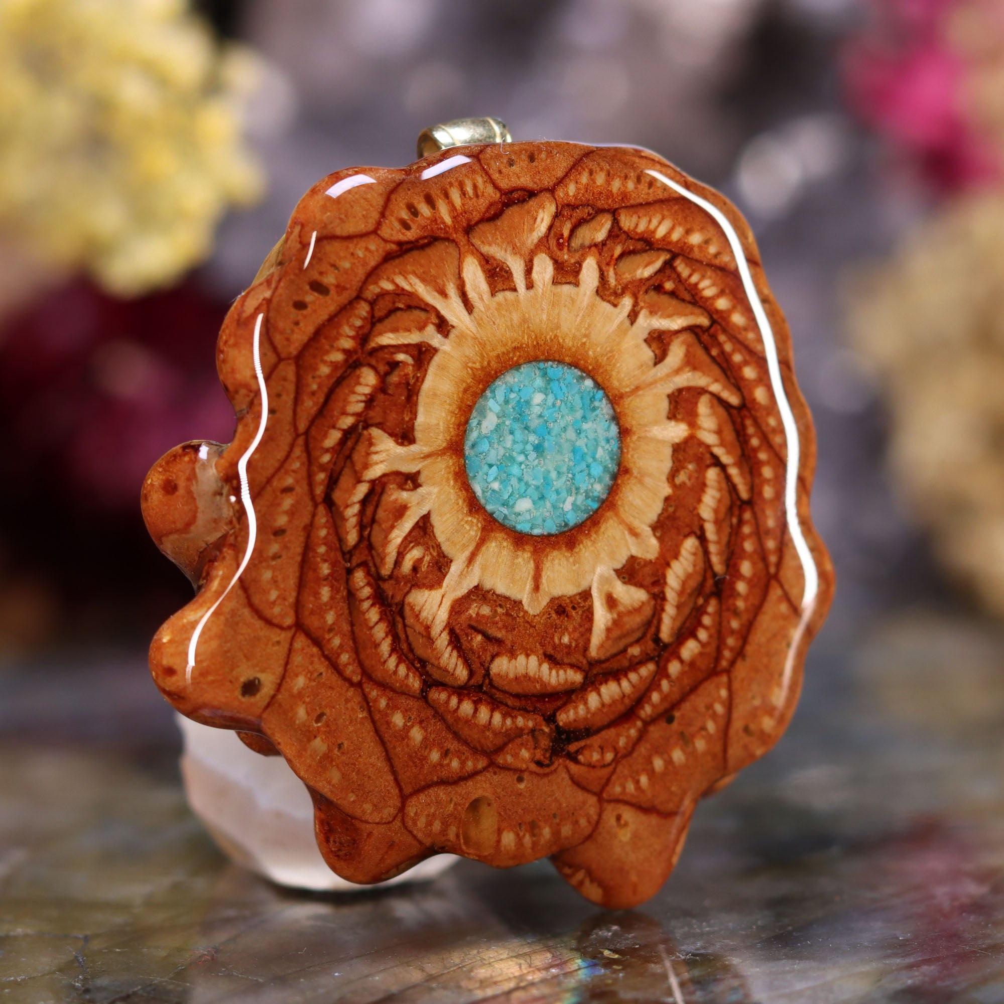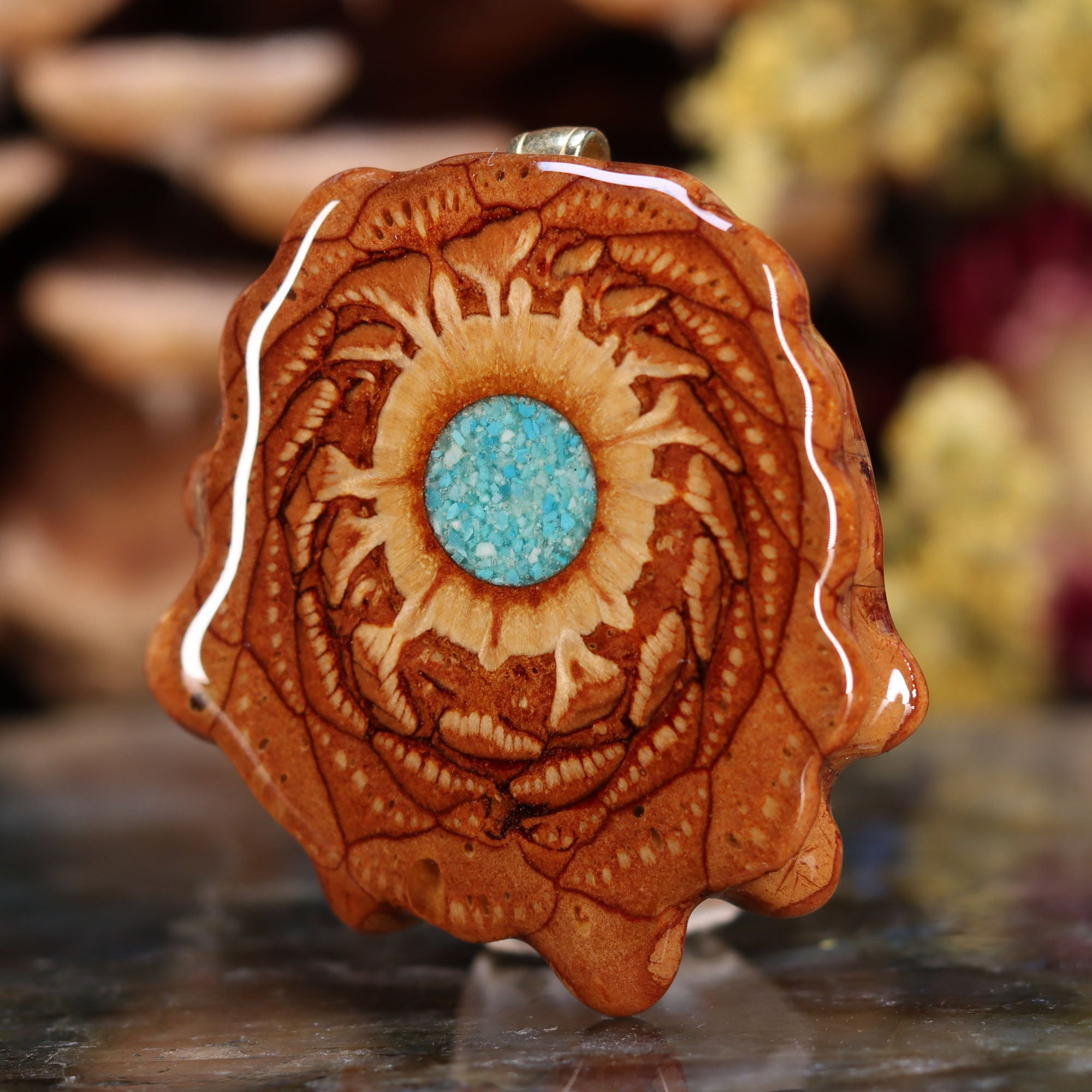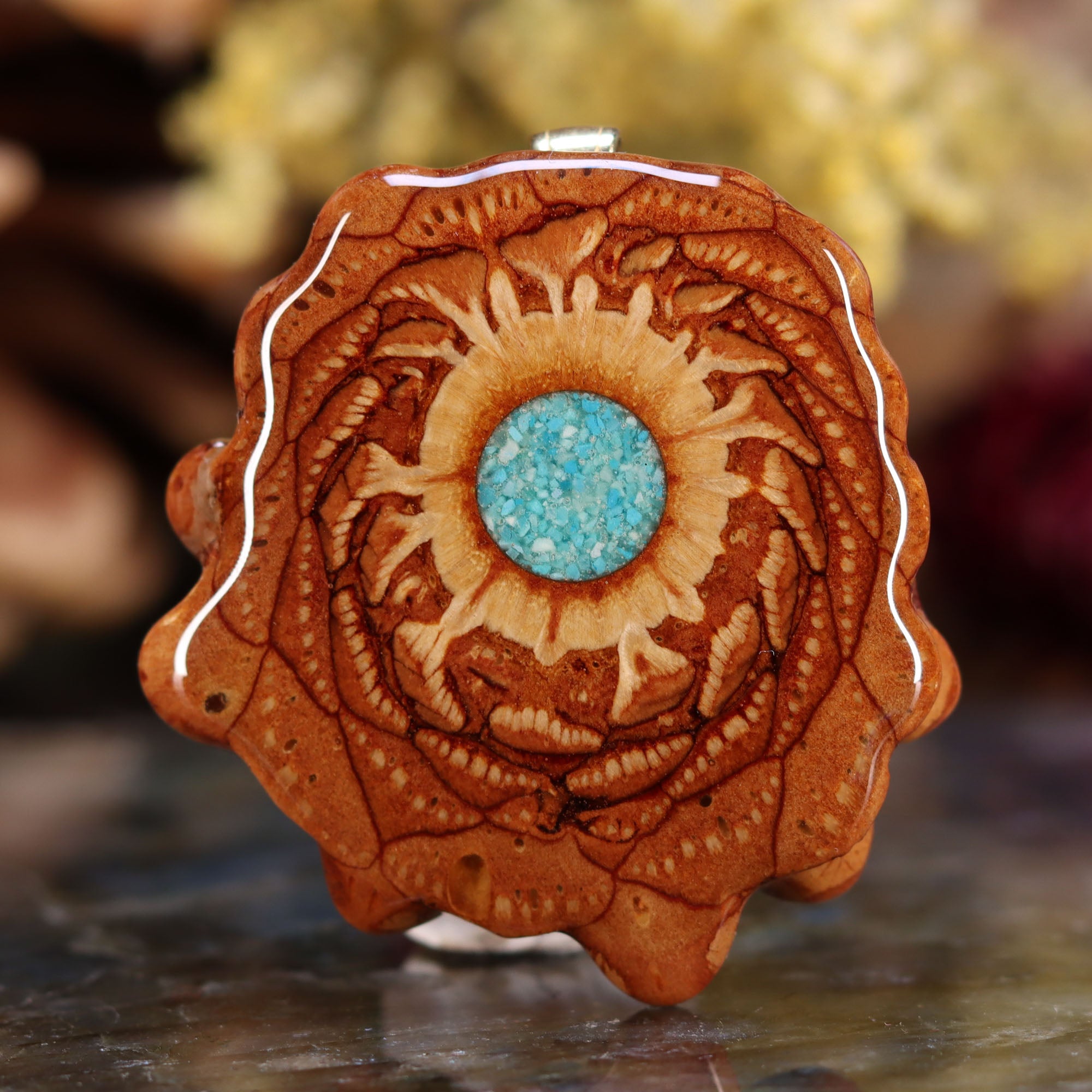 Every pinecone pendant is an elegant gift from Mother Nature -- unveiling the ornate Sacred Geometry hidden at the center of one of the world's densest Pinecones. Because only one cross-section is taken from the "heart" of each Cone, every pendant is absolutely unique, and truly one-of-a-kind.